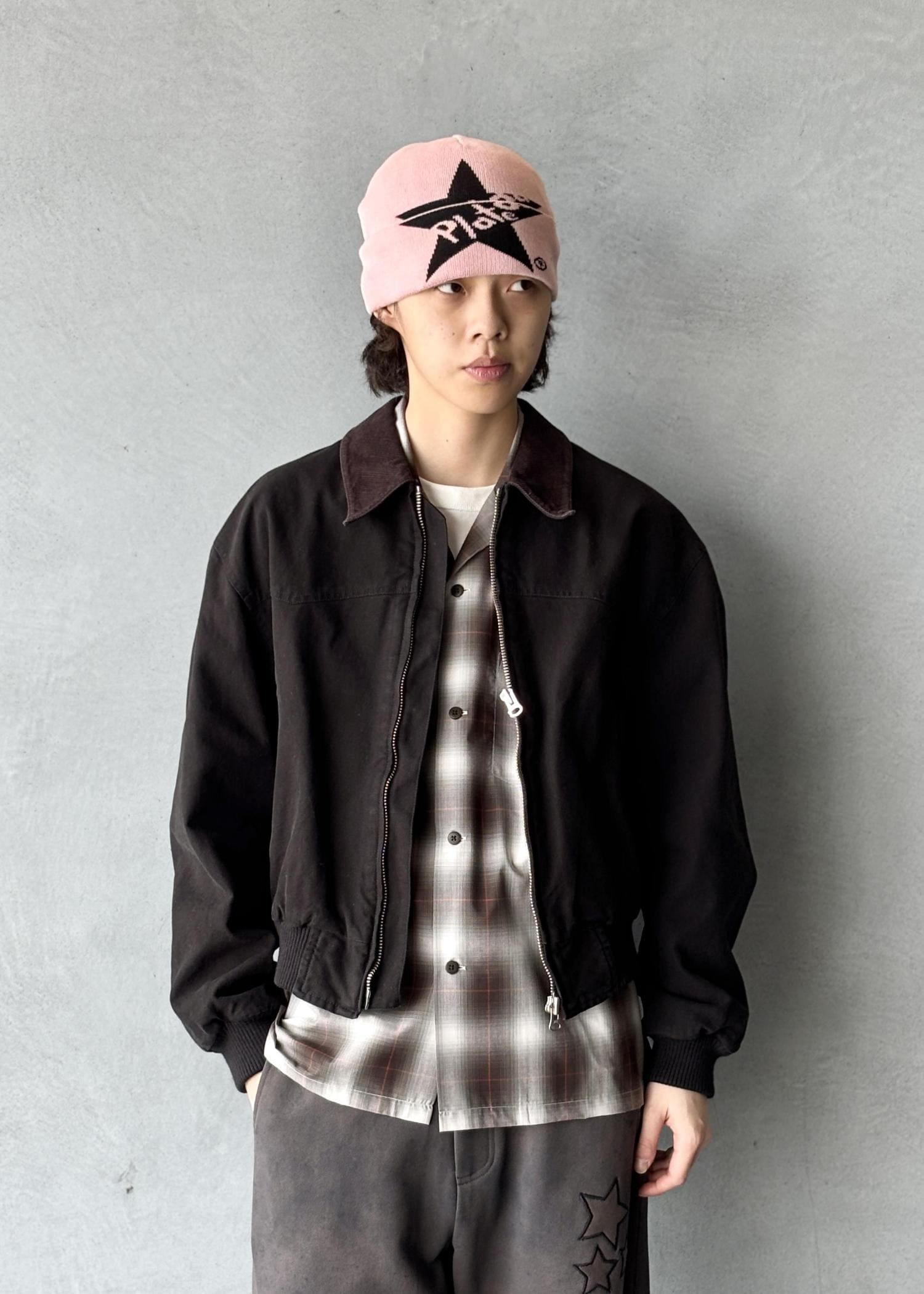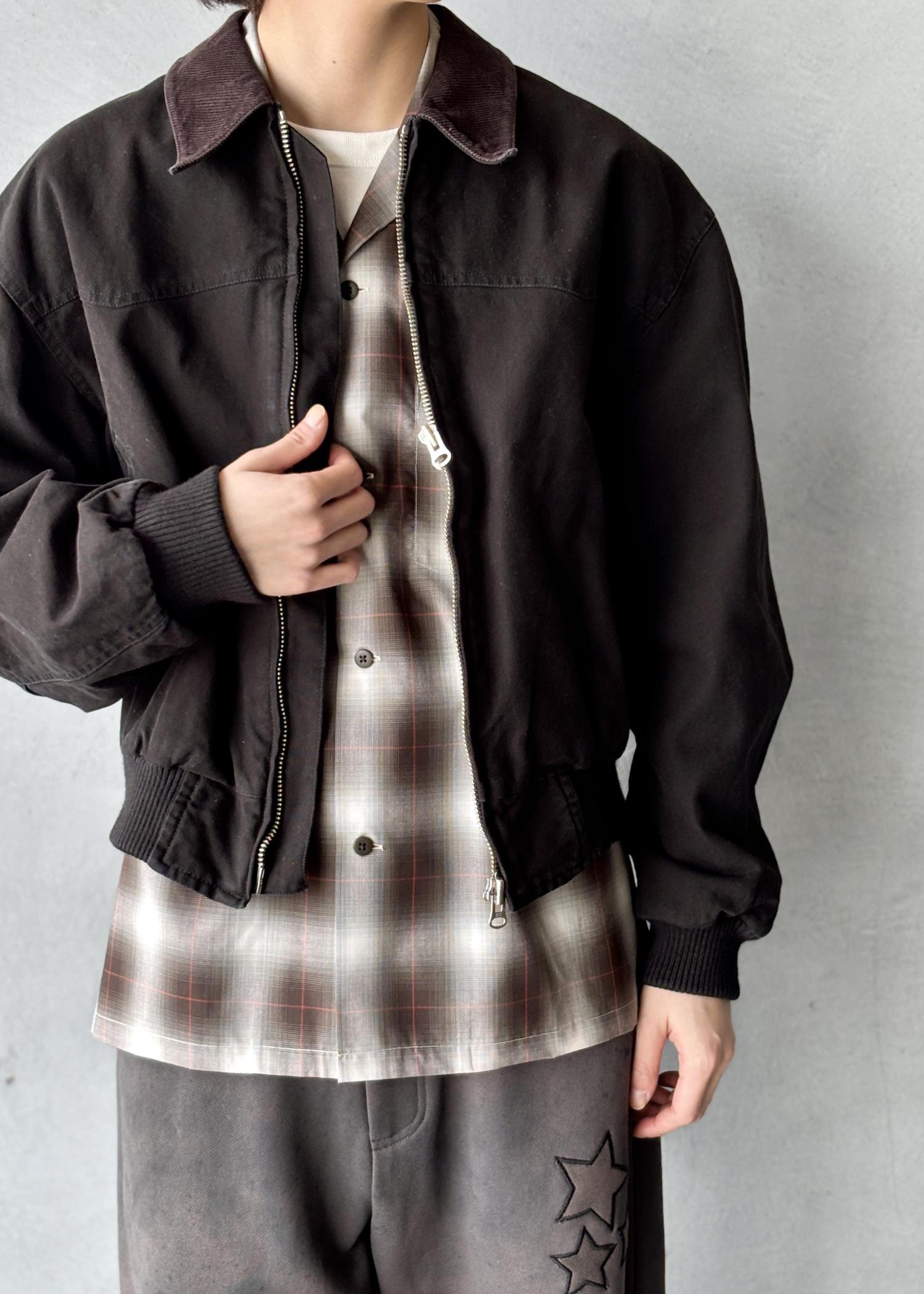 ダック地の短丈ブルゾンにシャドウチェックシャツを合わせた、男らしい雰囲気のストリートスタイル。