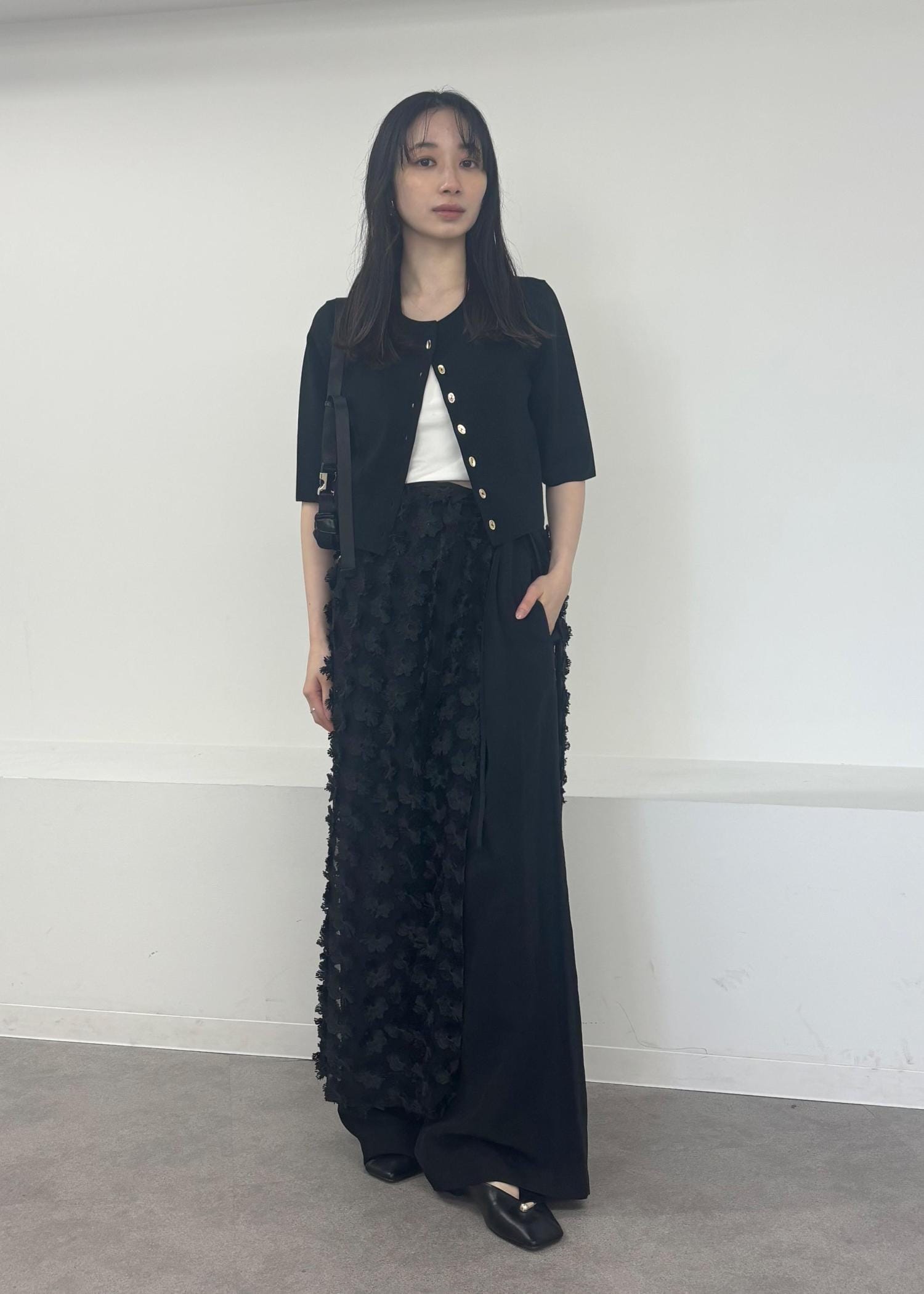 後は光沢感のあるパンツと女性らしいパンプスで