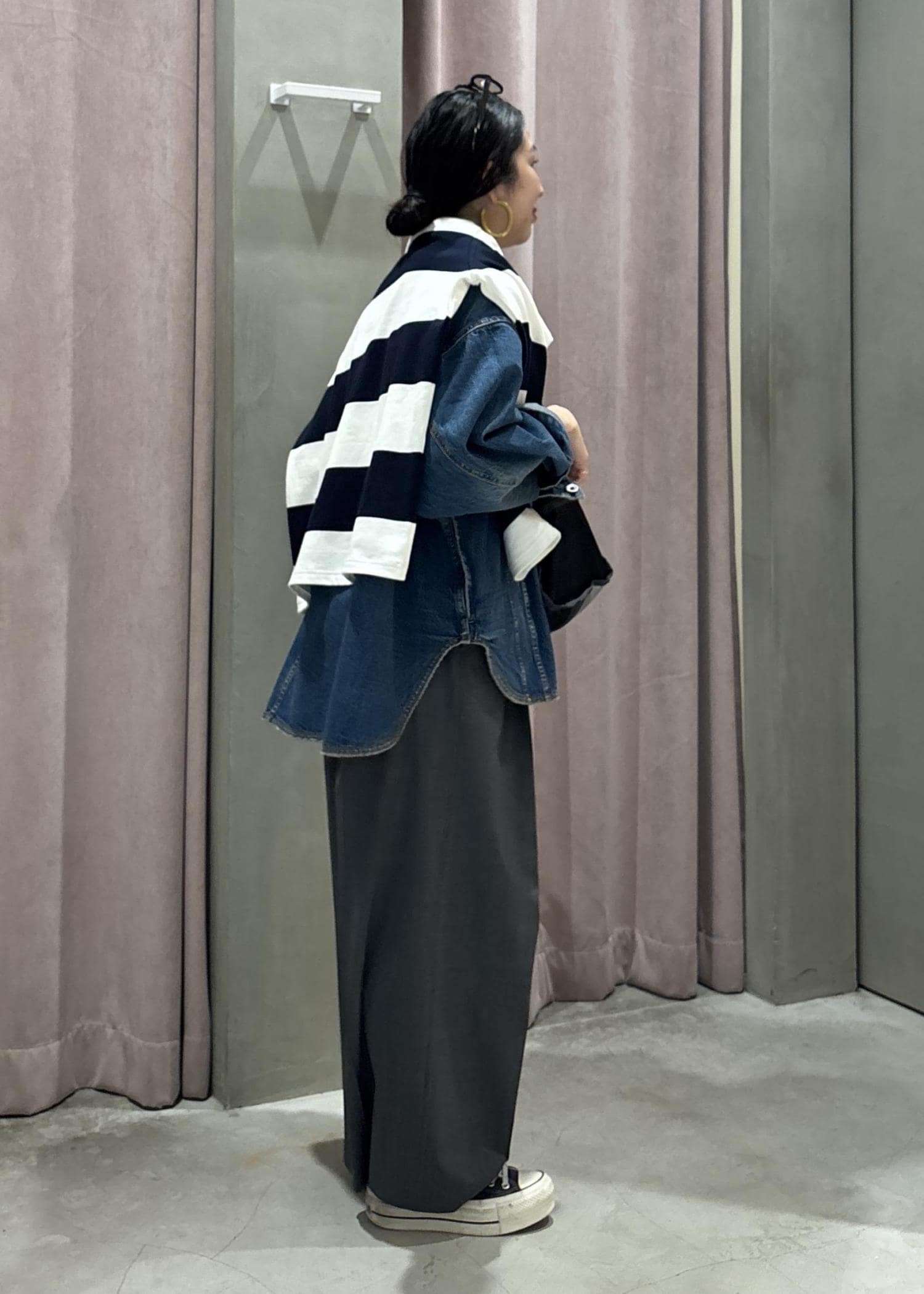 身幅はかなりゆったりなので、中にしっかりときこんでいただけます。シャツ風にも着れますし、デニムジャケットとしてアウター代わりにも着れる2WAYで着回し力高めです。 -