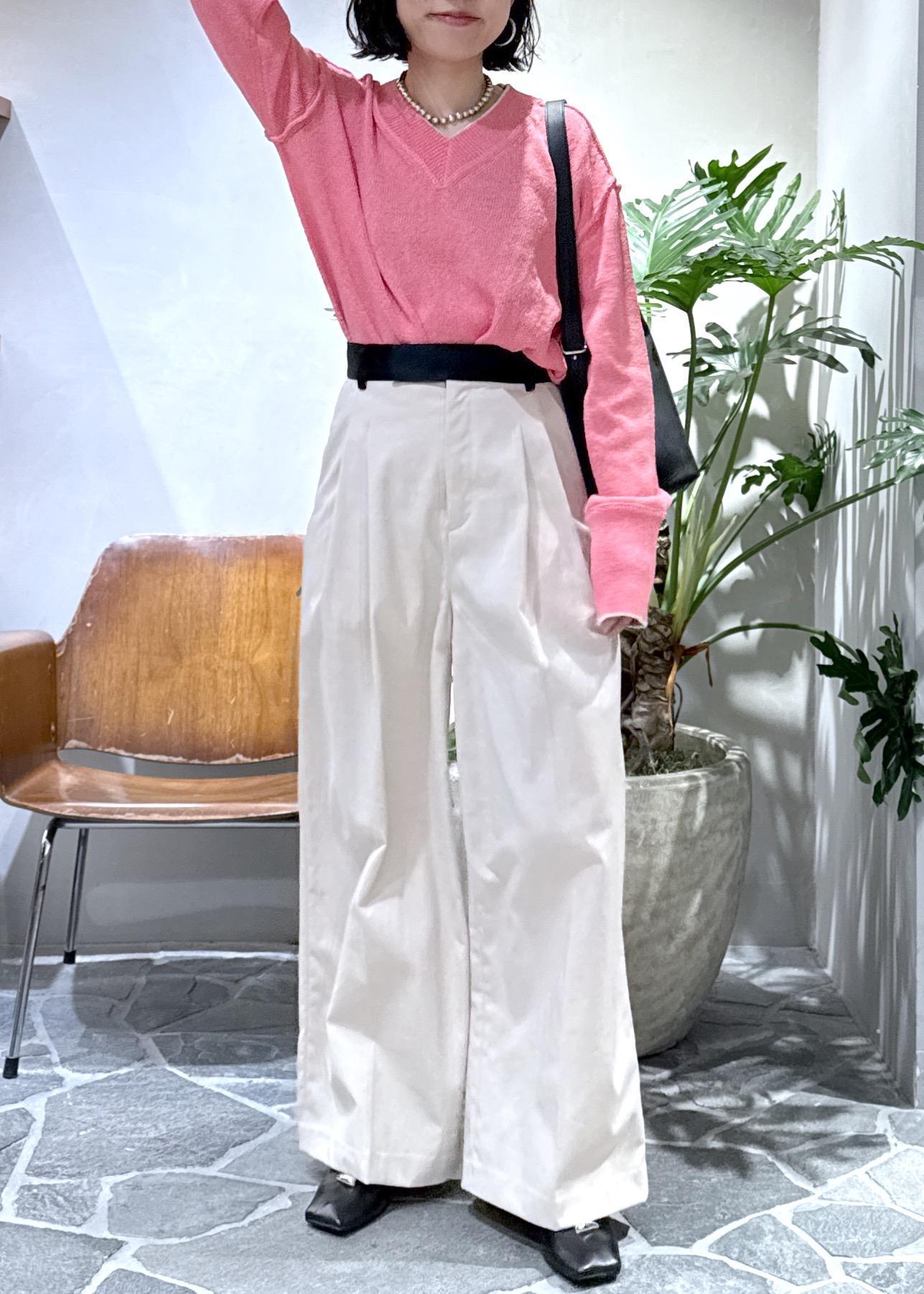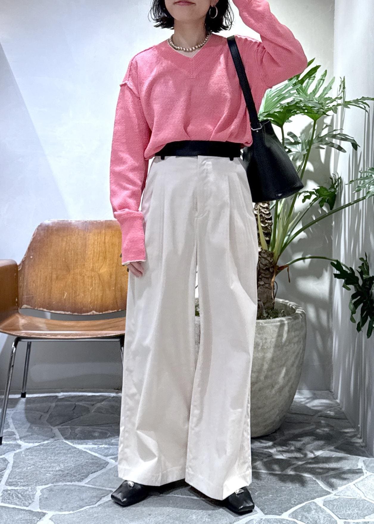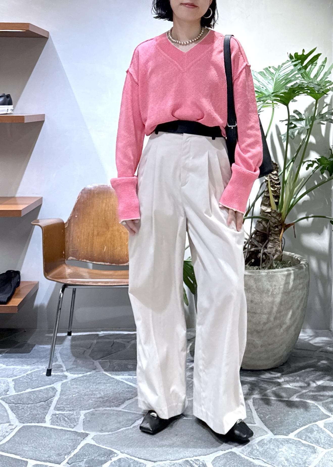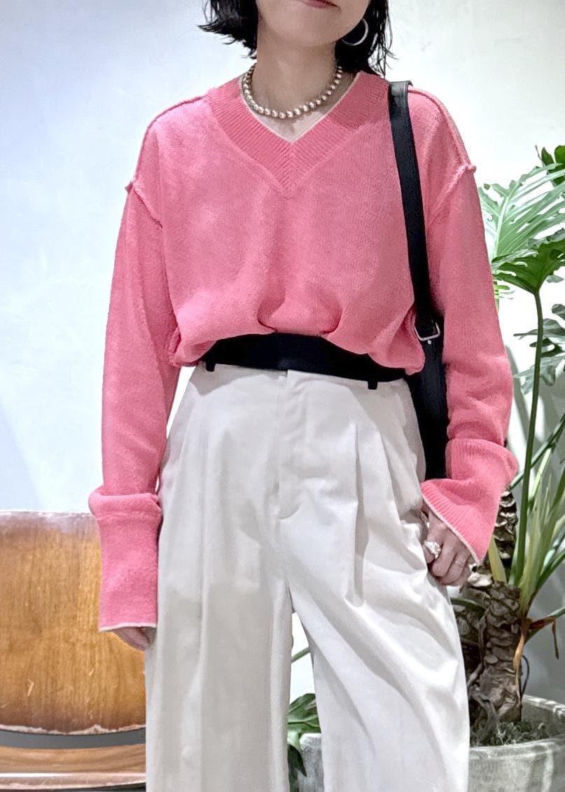ADAM ET ROPÉ FEMMEペーパーヤーンプルオーバーピンク / F¥16,500レビューワイドな身頃と短丈のバランスが綺麗です。深すぎないVネックで合わせやすくなっています。