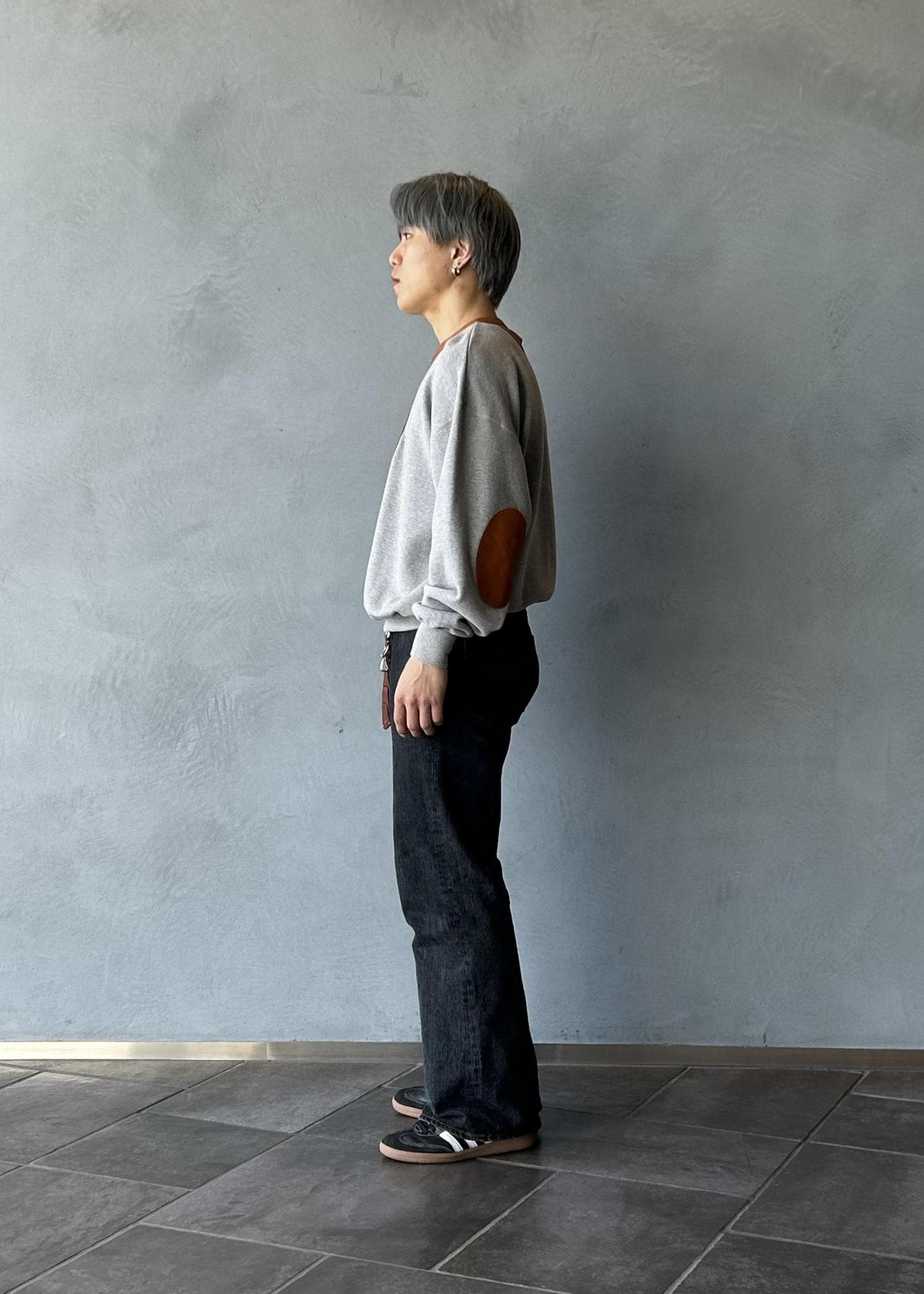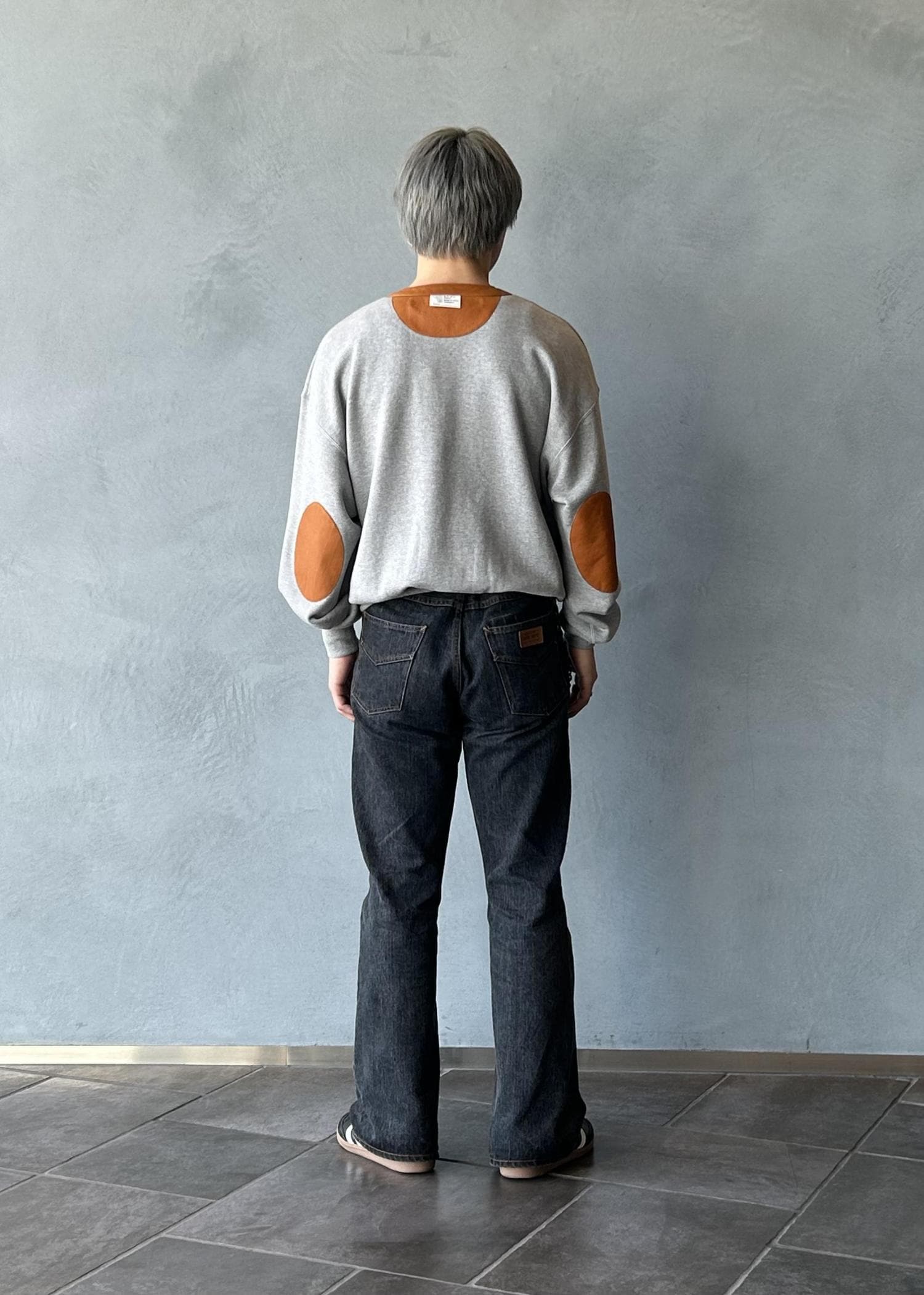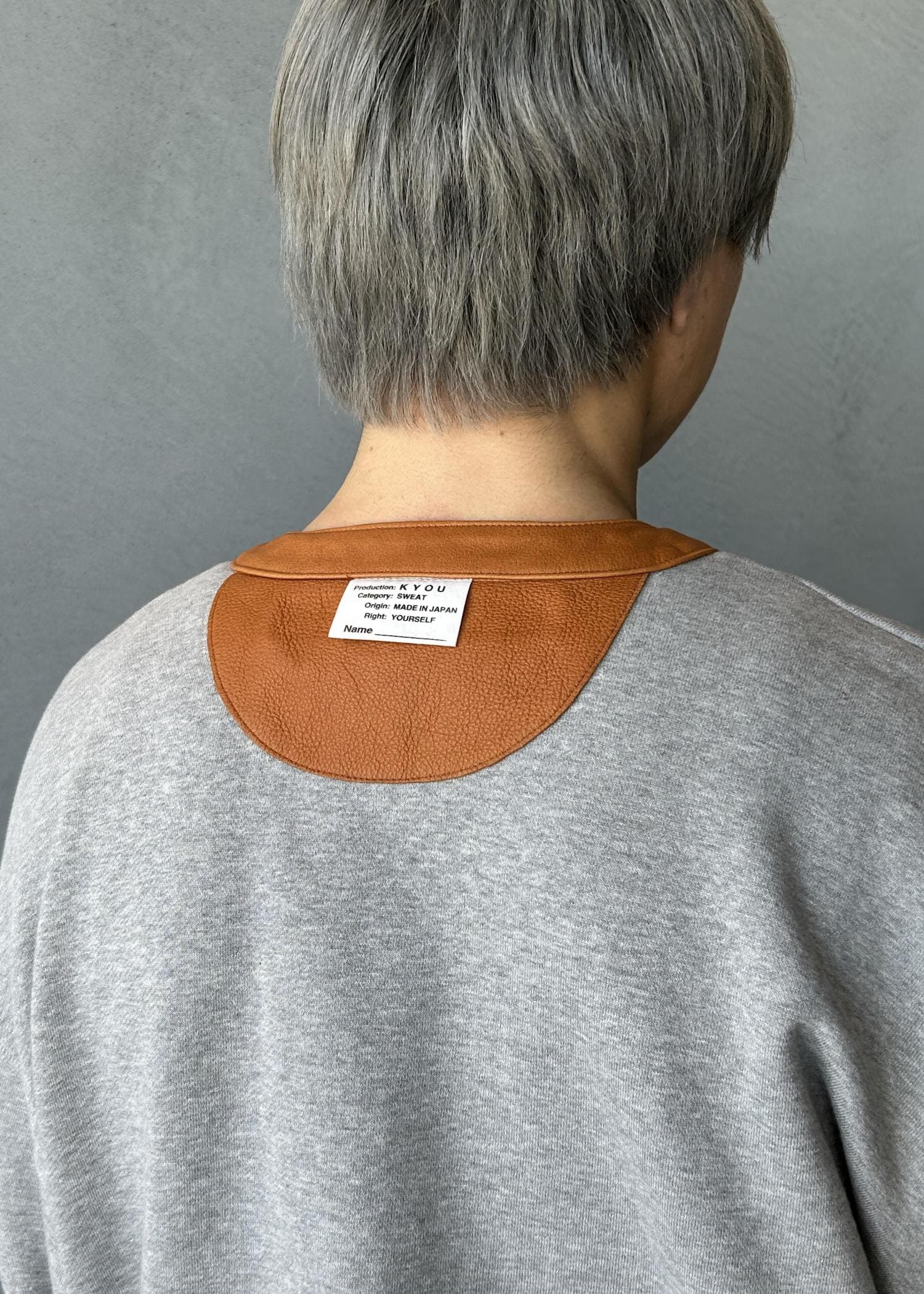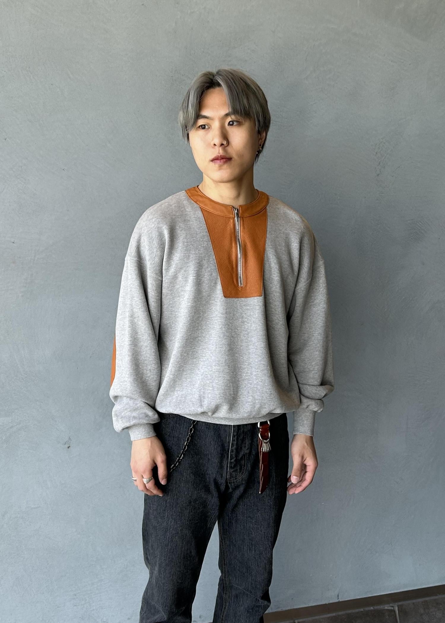 襟部分がレザーで切り替えされているスウェットで、ゆるさの中にもしっかりアクセントを感じれるよう仕上げました。