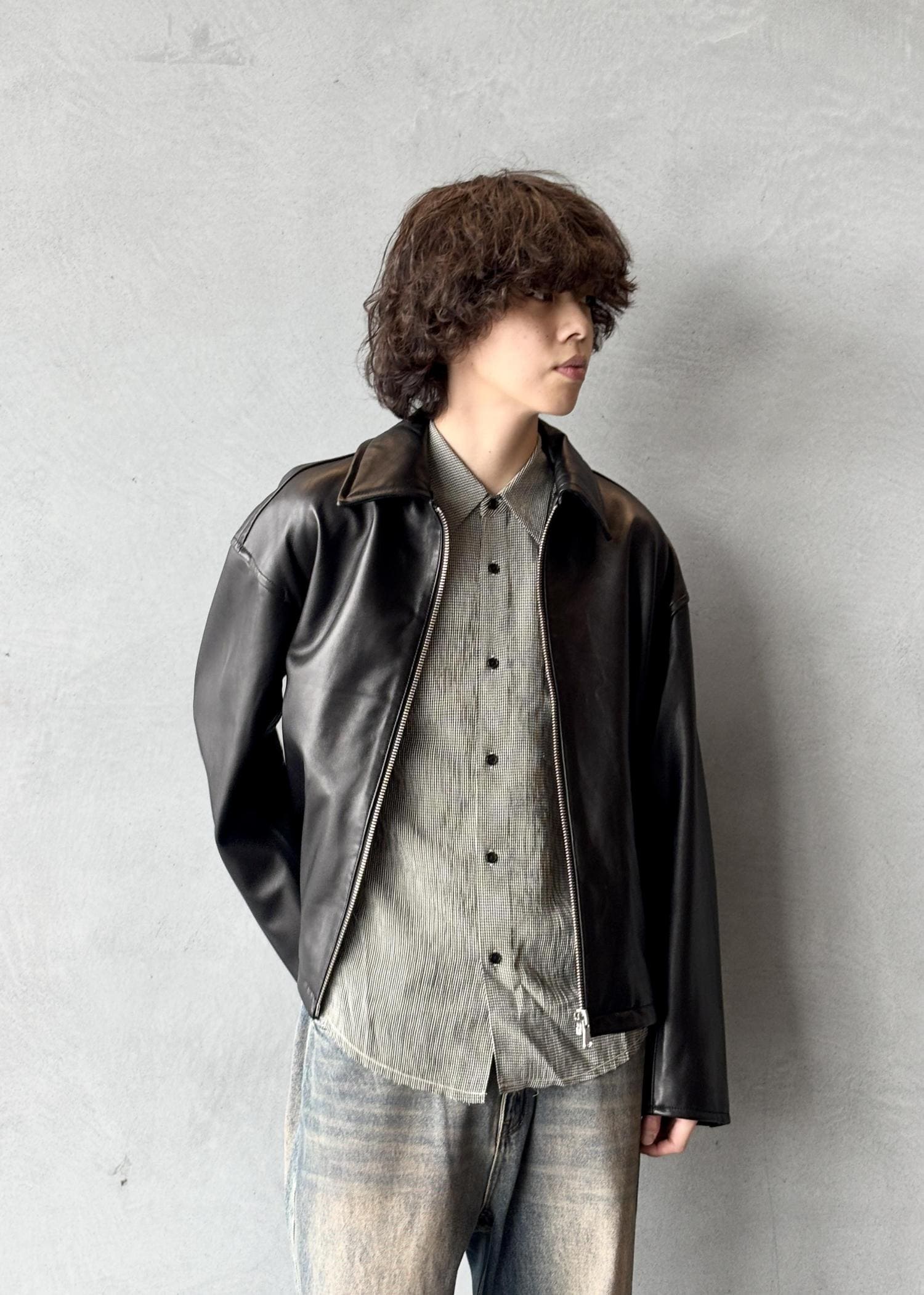 アウターはオリジナルのラムレザージャケット。