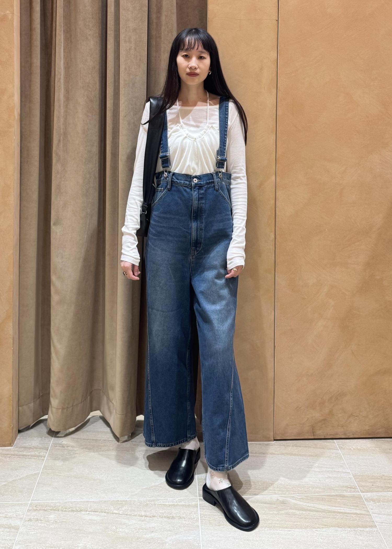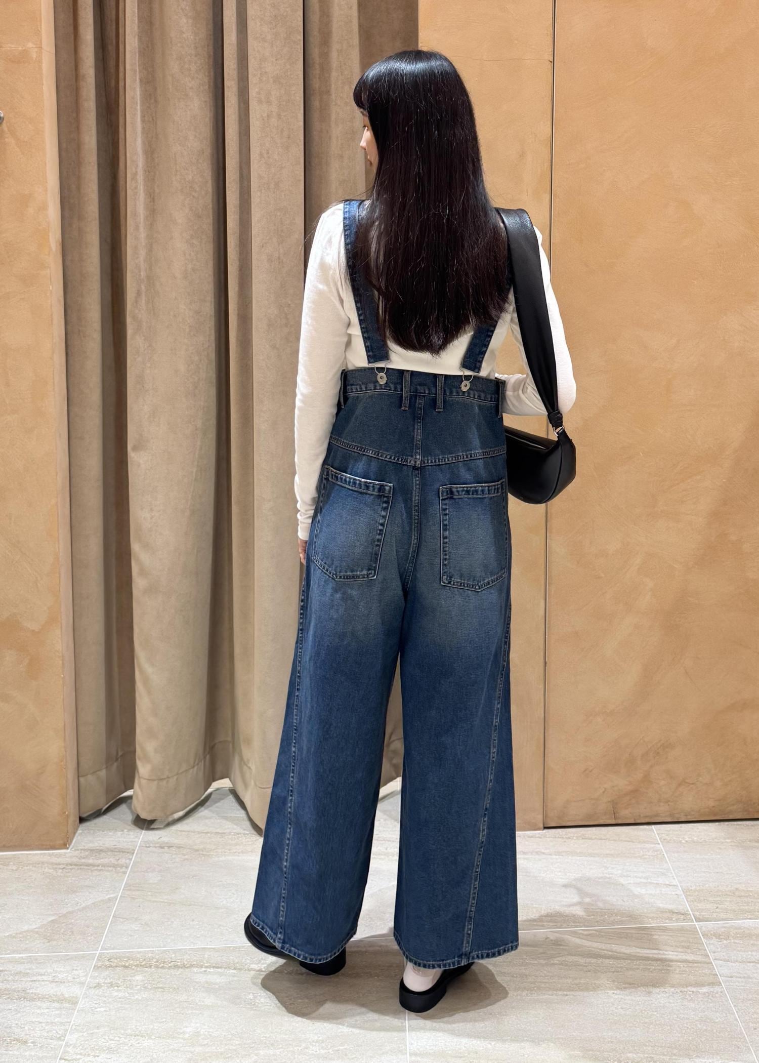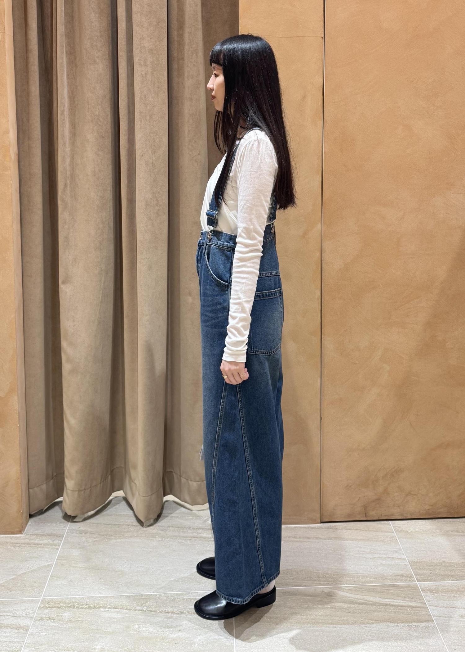 ゆるやかなカーブを描くワイドシルエットが存在感を放つ、主役級デニムサロペットです。