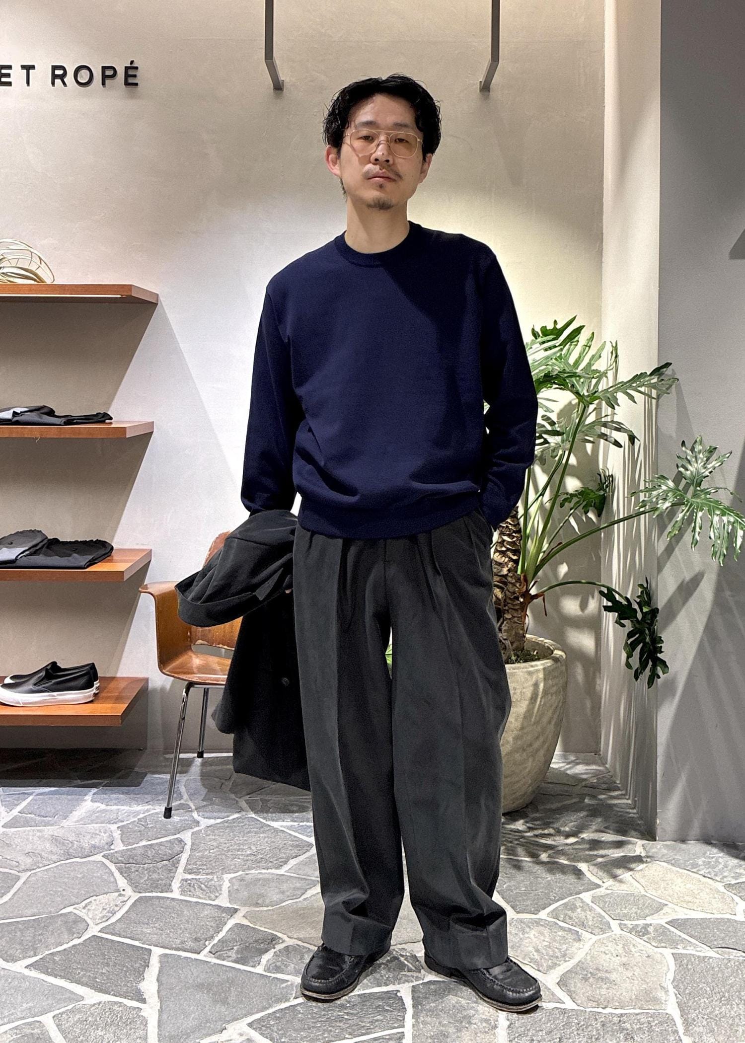 ADAM ET ROPÉ HOMME強撚プレーティングニットプルオーバーネイビー / M¥12,100レビューややゆったりめのサイズ感で、大きめに着たい方は一つ上のサイズがおすすめです。コットンとポリエステルがメインの素材なのでとにかく扱いやすく、インナーから一枚着まで汎用性が高いのも◎