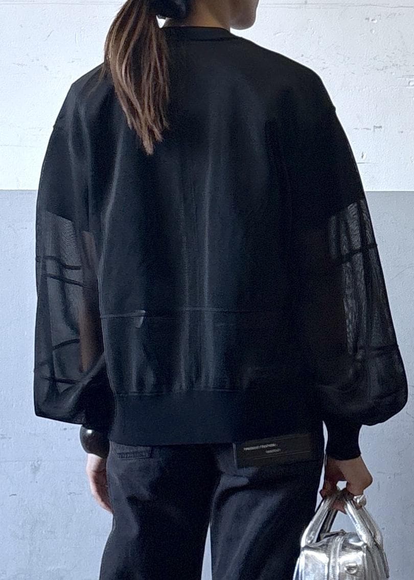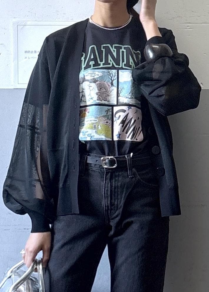 ふわっとした袖のシルエットが特徴的なシアーカーディガンです。シアー素材ですが、チクチク感がなく軽く着られるところが嬉しいポイントです!