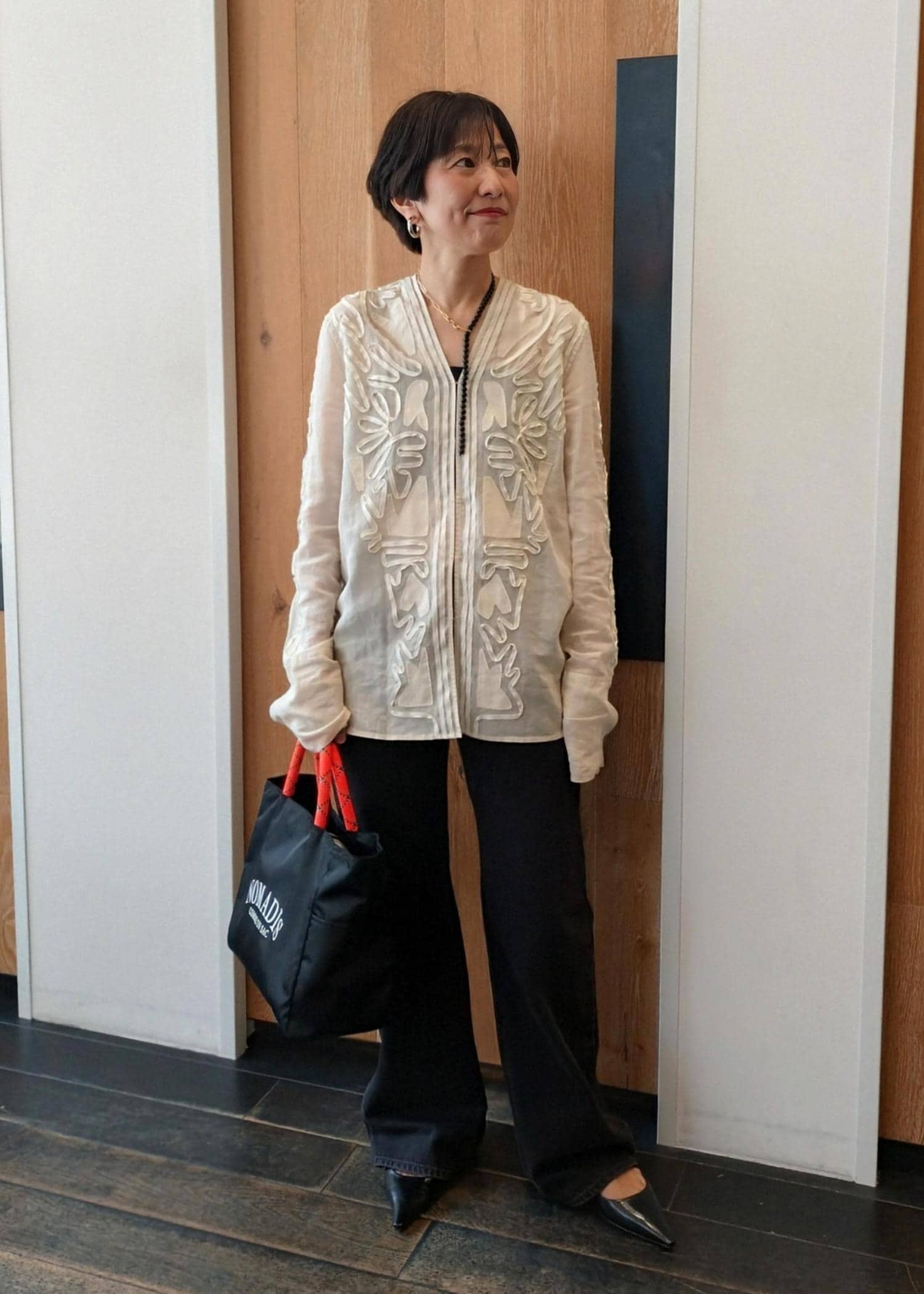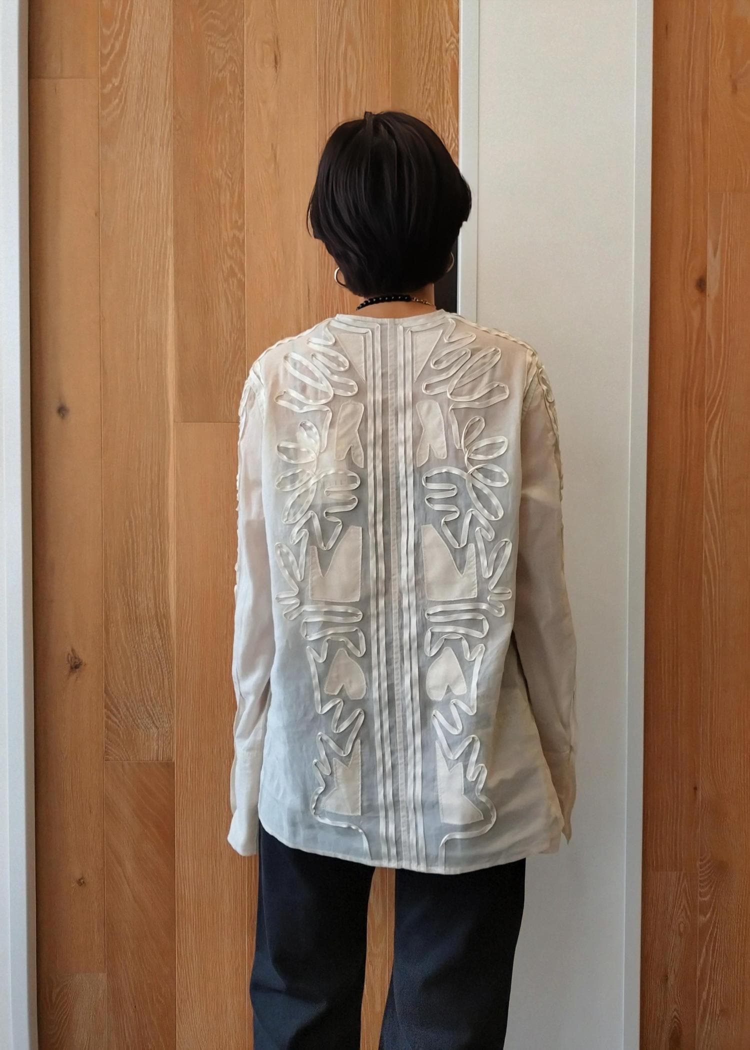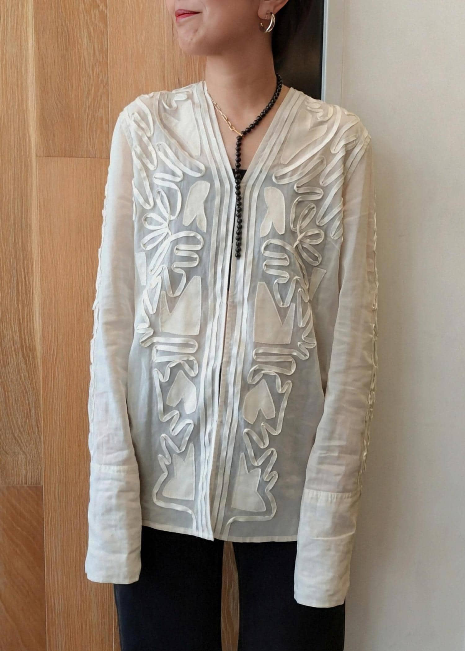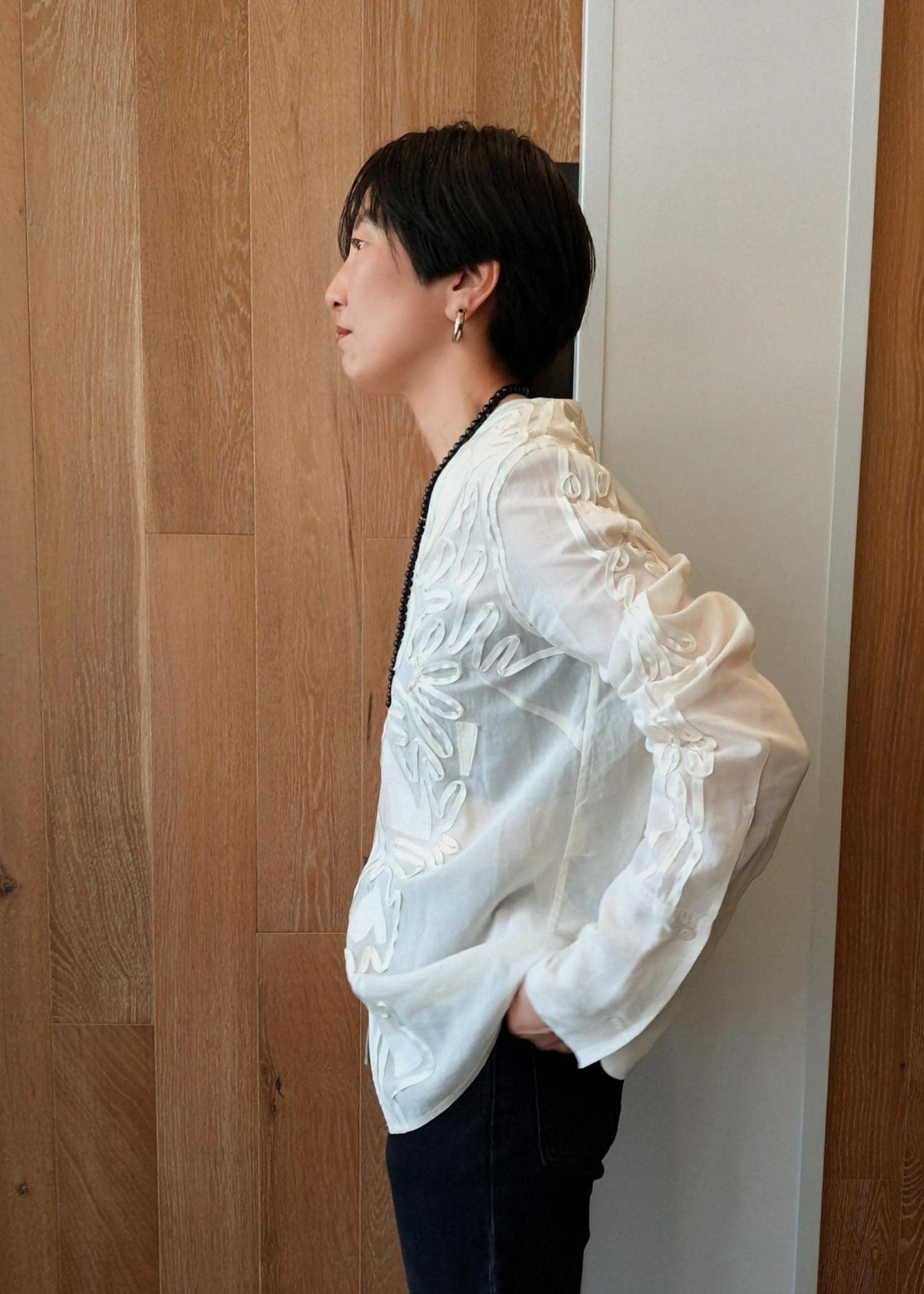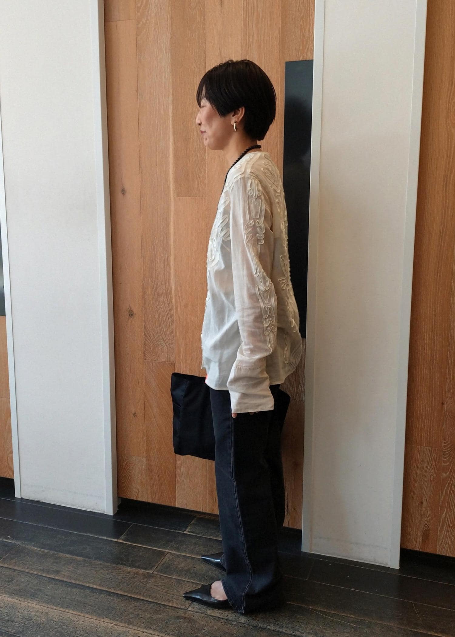 EMOELLE【EMOELLE】ステッチエンブロイダリーブラウスキナリ / F¥24,200レビュー小さなフックで開閉できるシャツブラウスです。