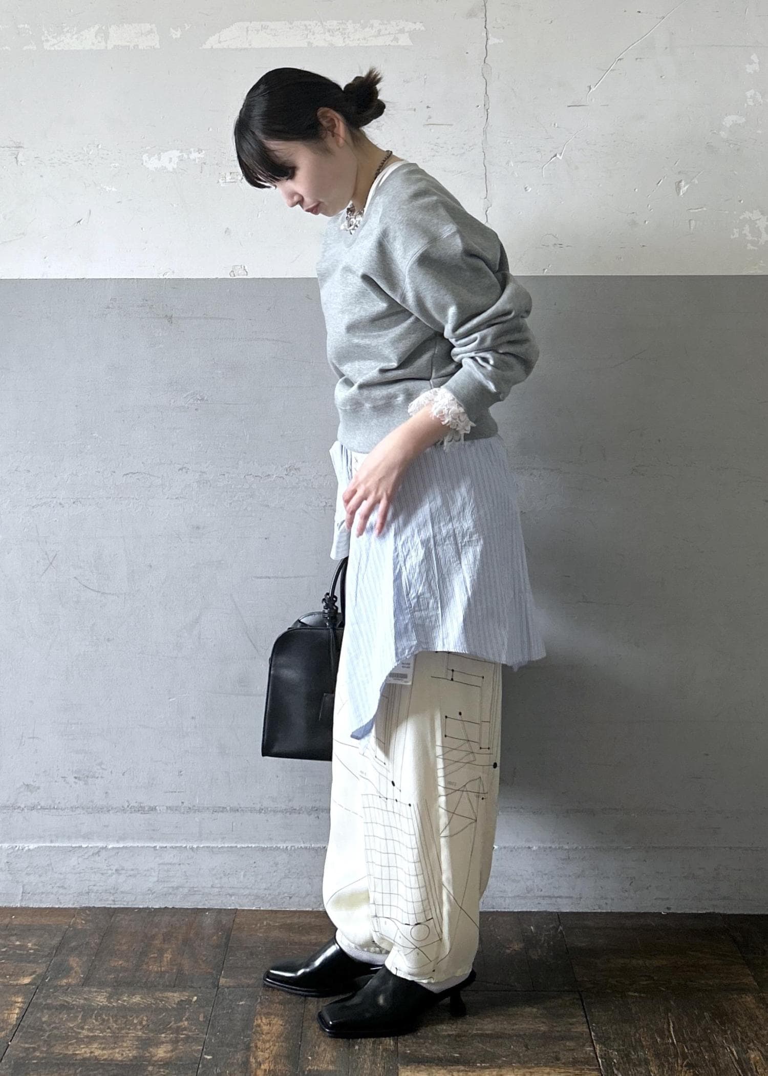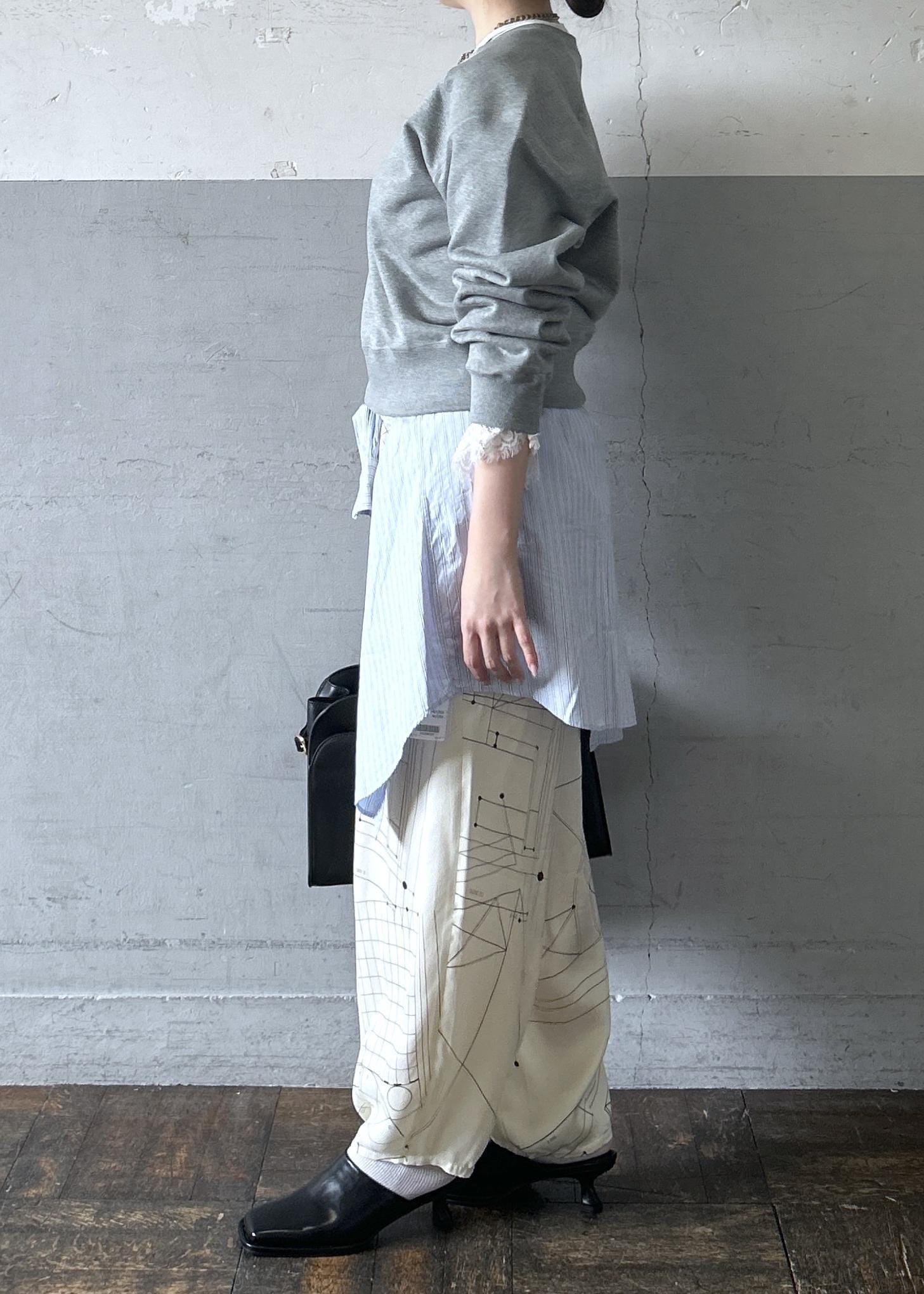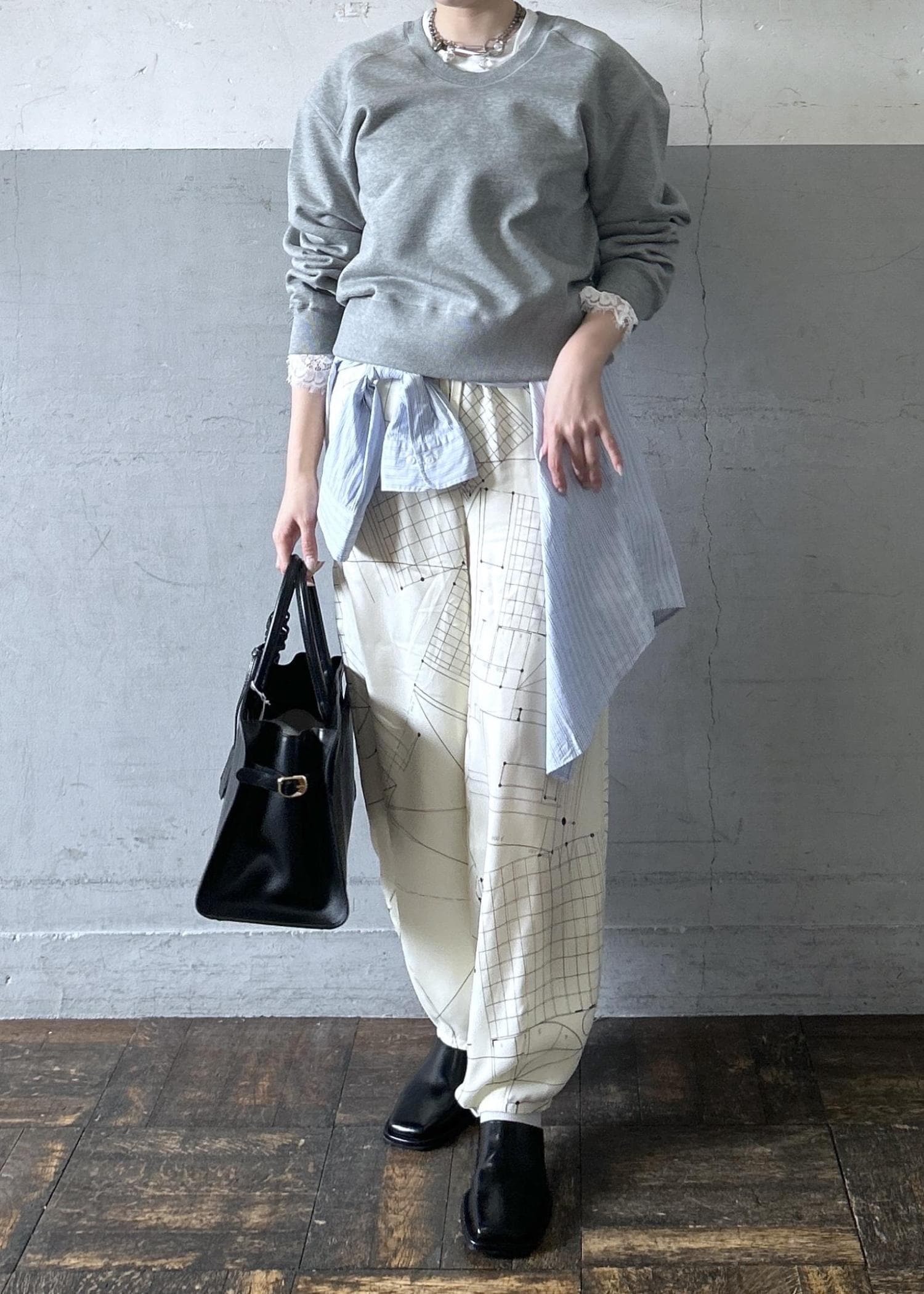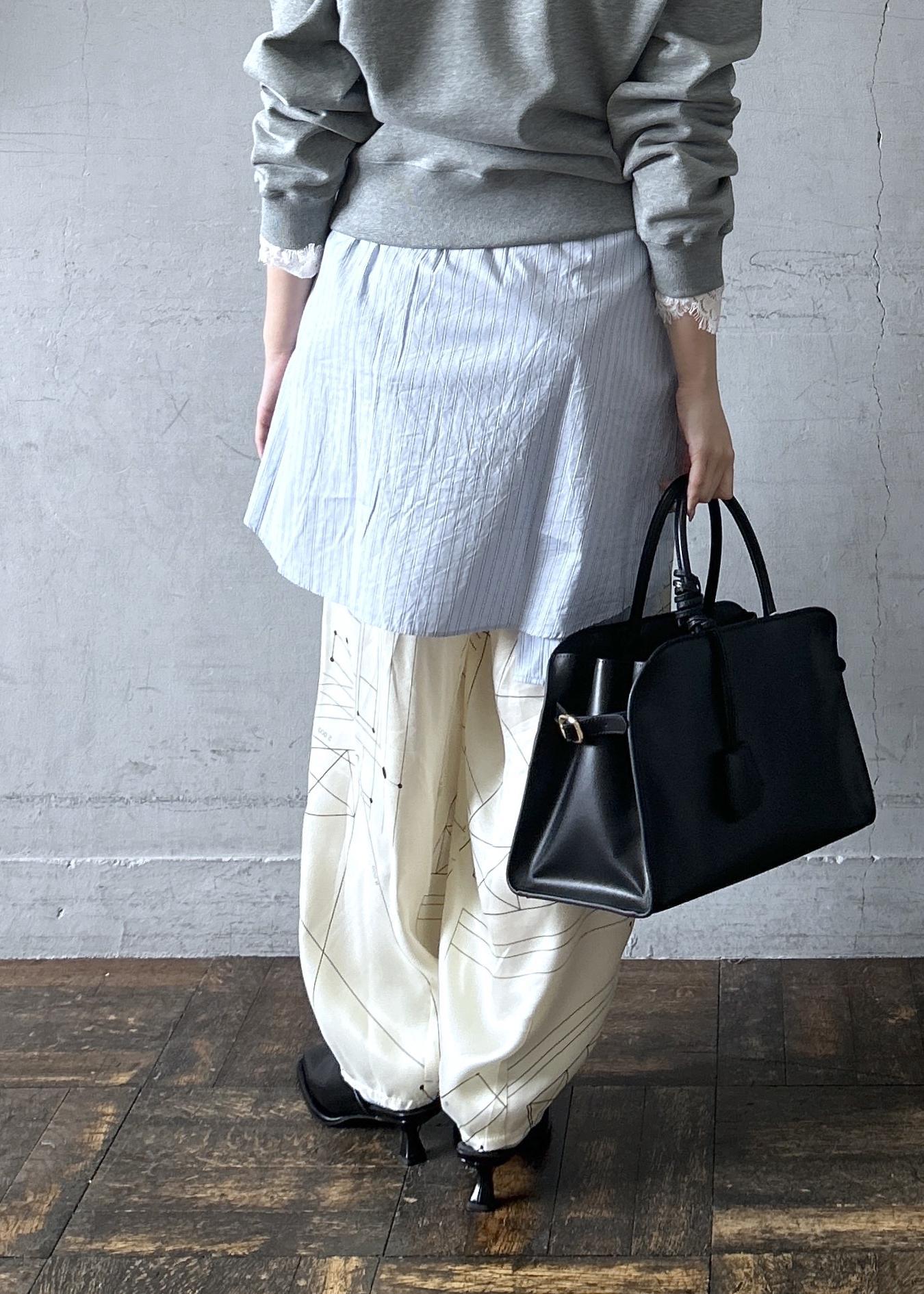 スウェットにワイドめのパンツだと、全体的にゆったりとしたシルエットになる為シャツを巻いたり、ショルダーバッグを身につけたりするとメリハリが出て綺麗です。