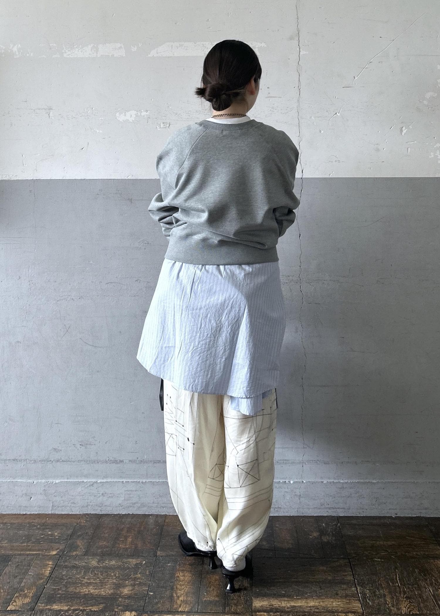 スウェット×シャツコーデ