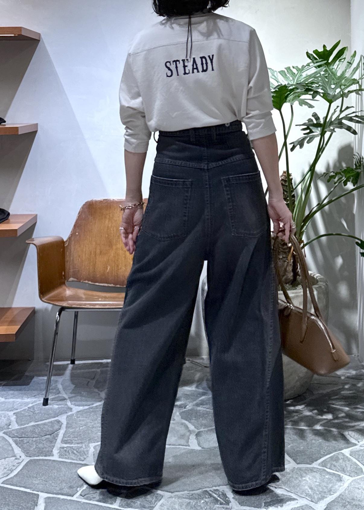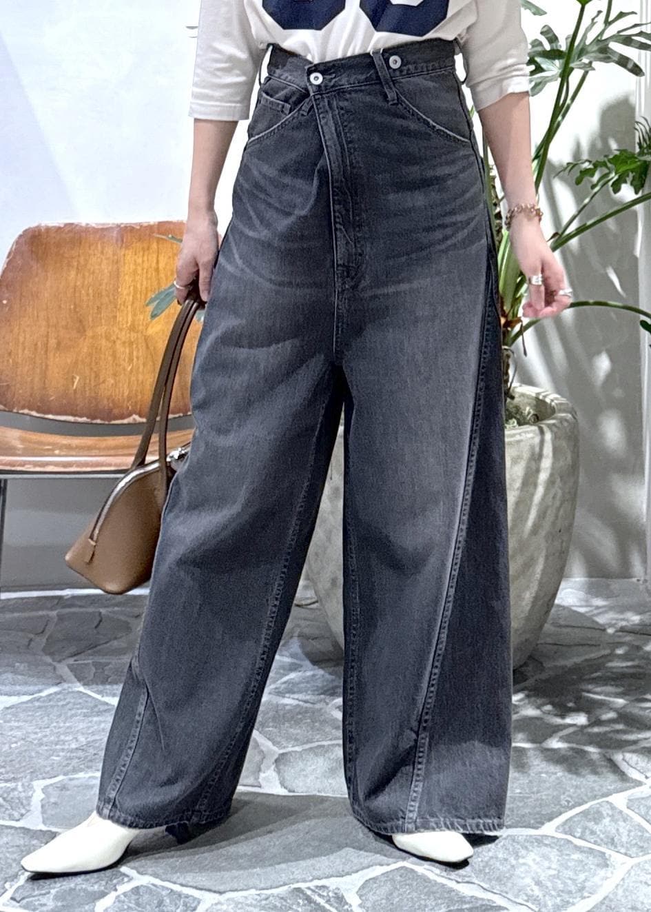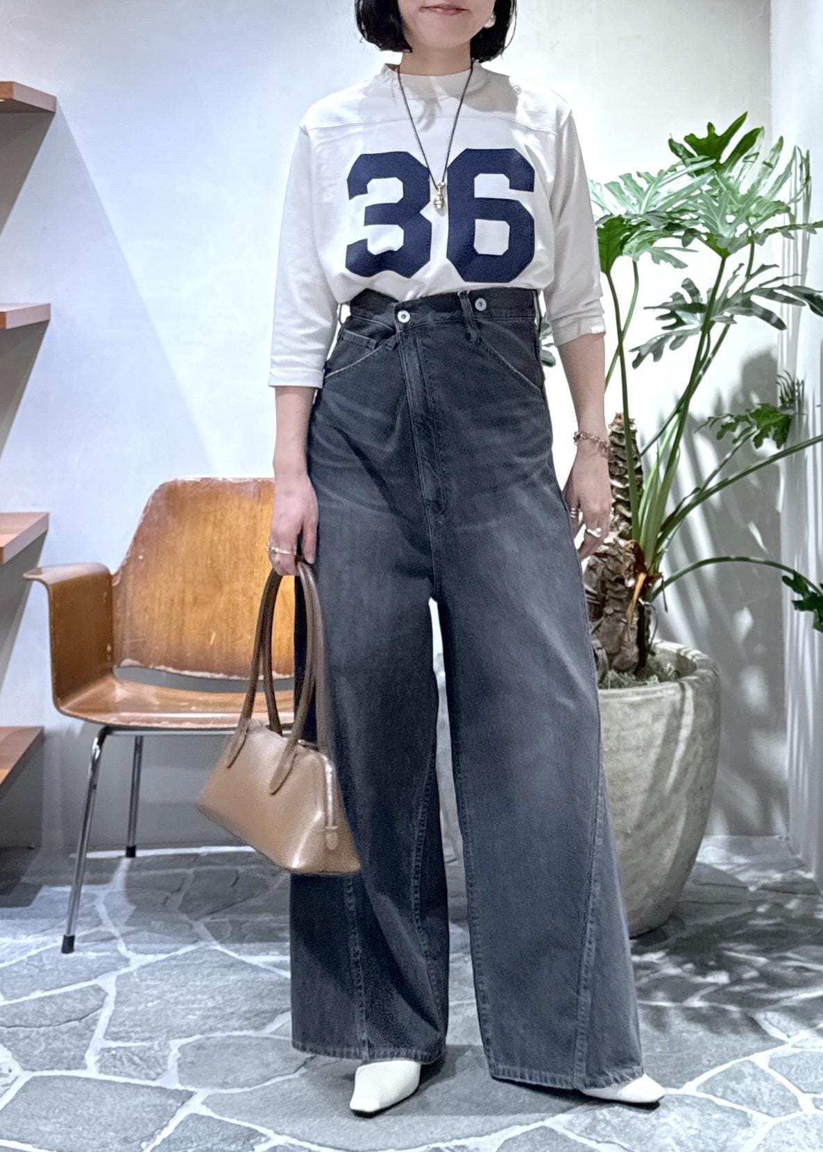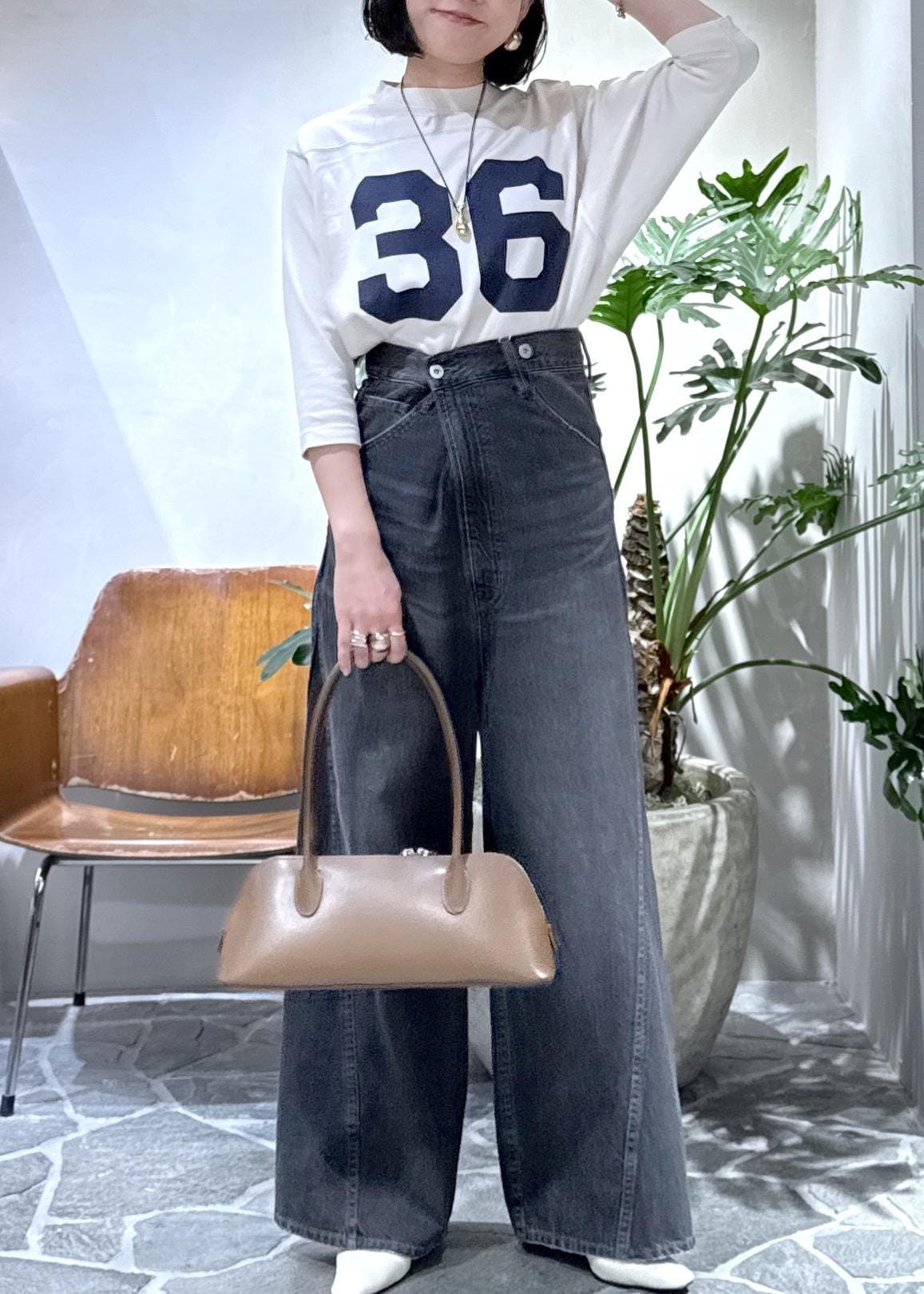 ビッグシルエットのワイドデニムをハイウエストに穿いて、ヒールで合わせました。