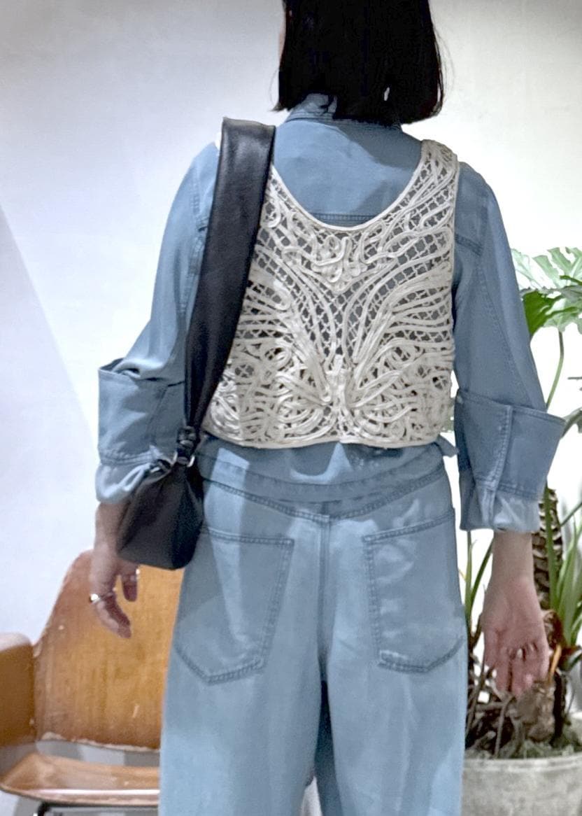 ゆるっとしたシルエットなので、ビスチェをレイヤードしてメリハリをプラス。