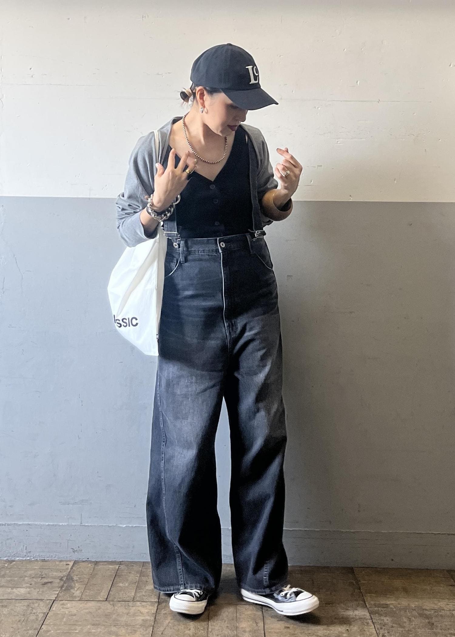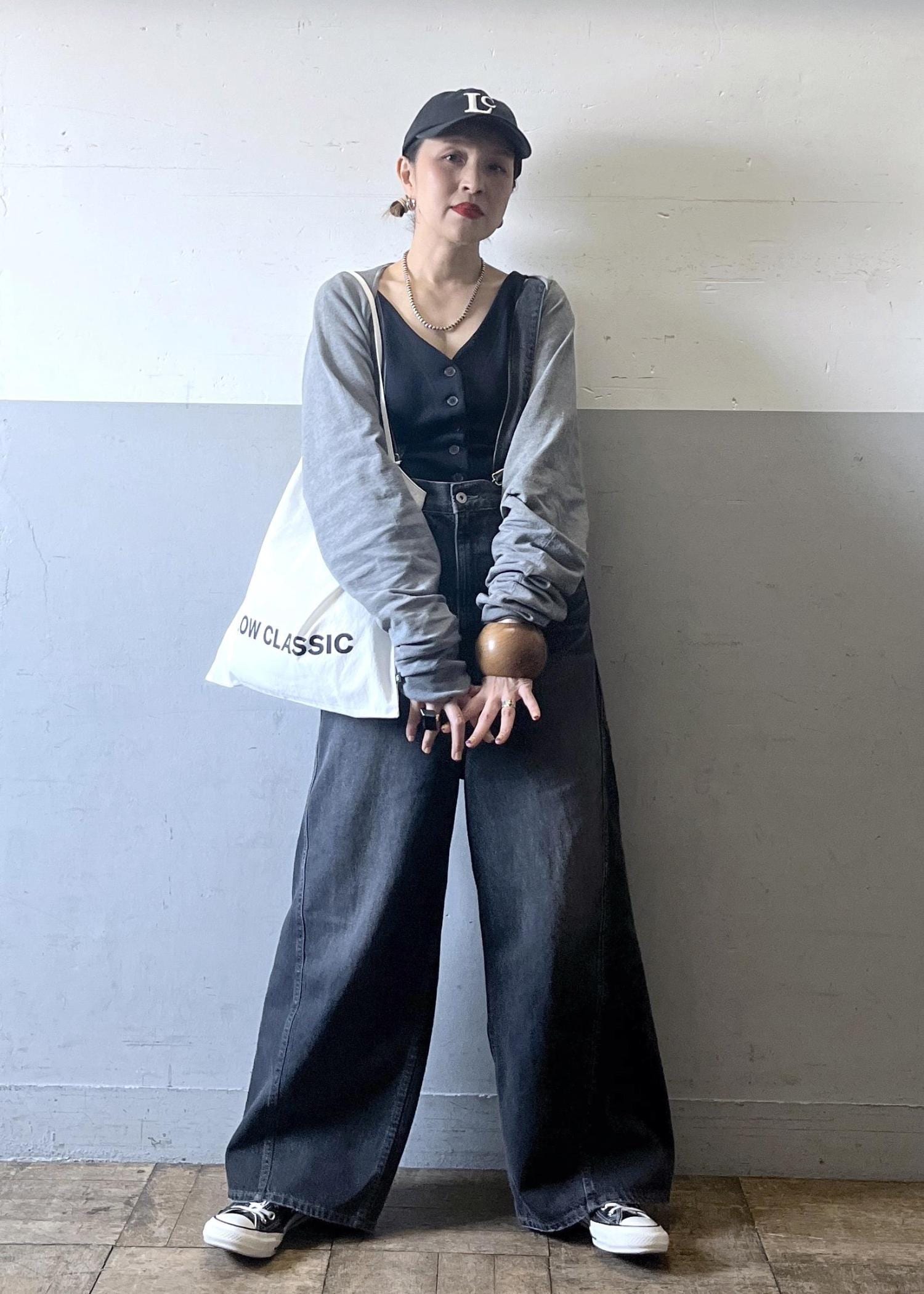 ワイドシルエットのデニムサロペットに、