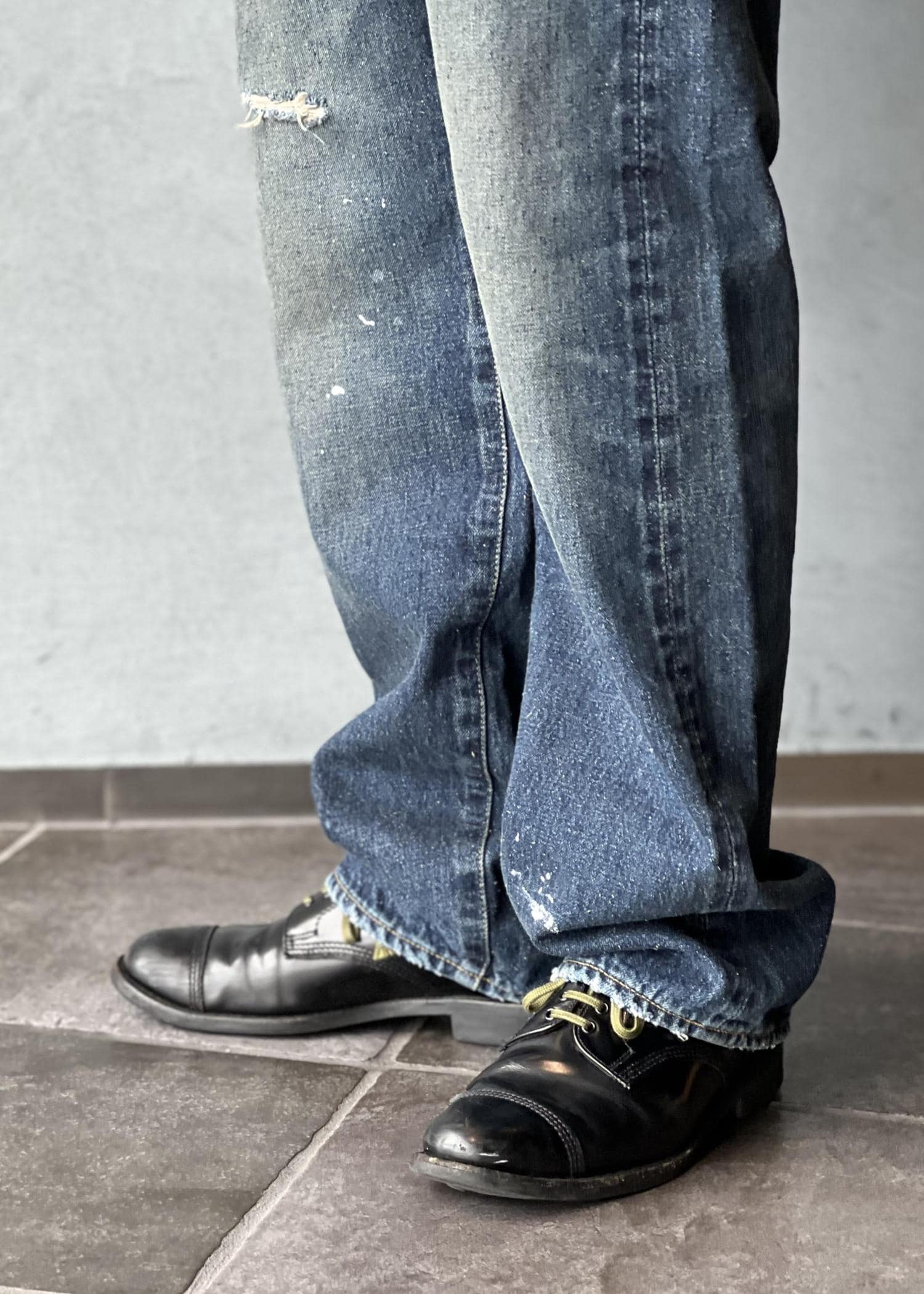 さらに、太もも部分やポケット位置のダメージや裾のペイントは、着用者の実際の使用感をダイレクトに感じられる細やかなディテールとして本別注のポイントの一つです。