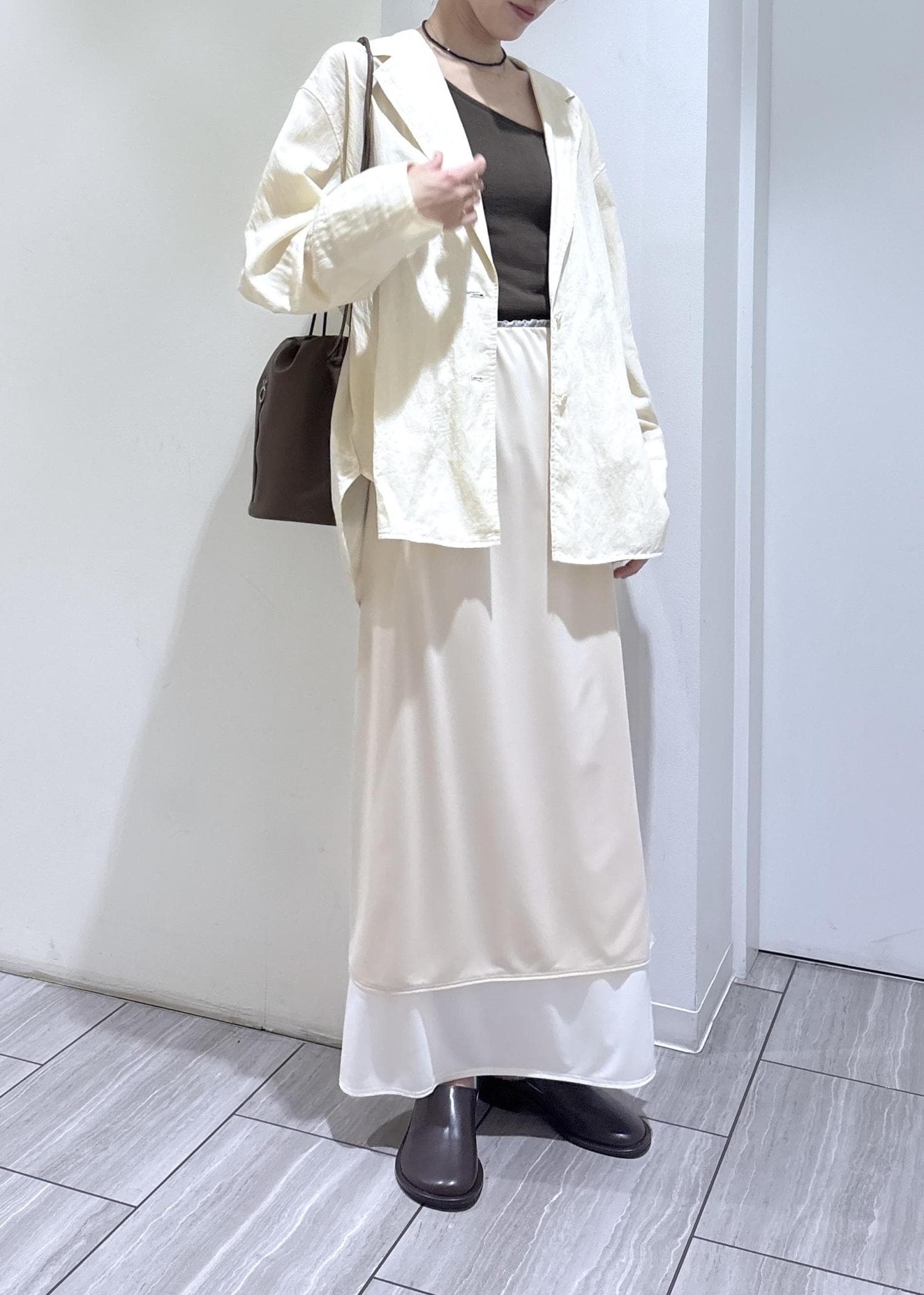 本日はおすすめのバイカラースカートをニュアンスカラーでまとめたスタイリングです。