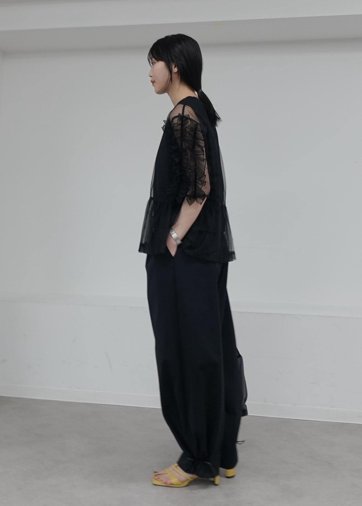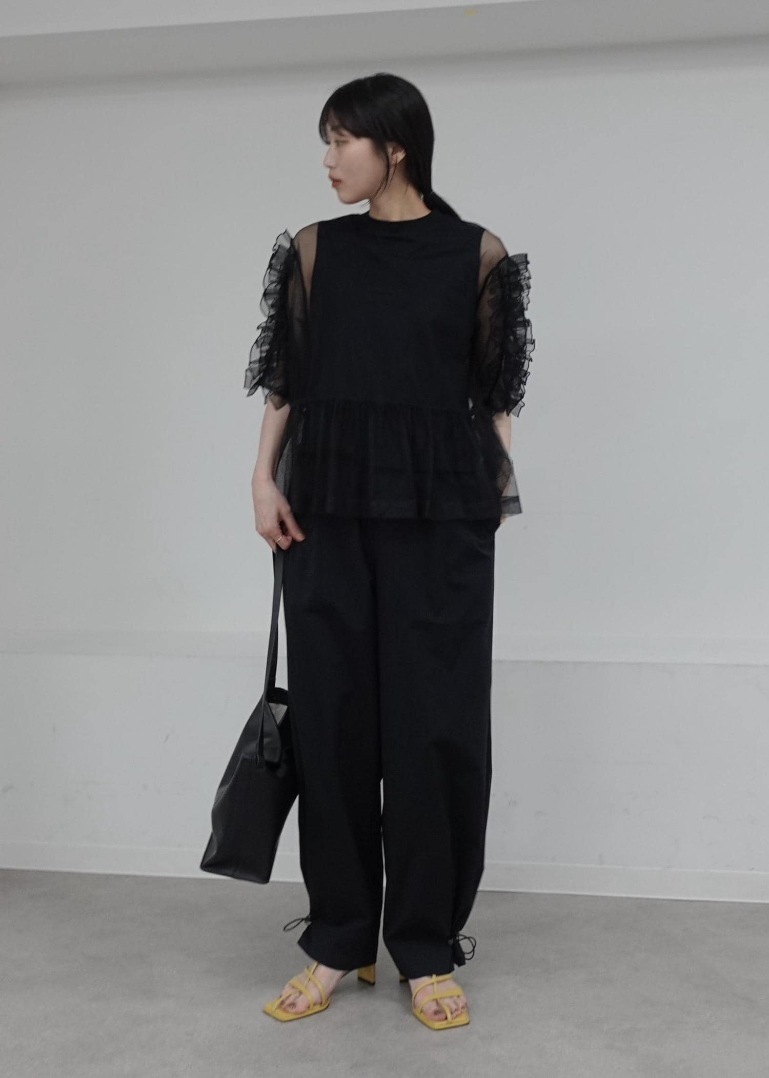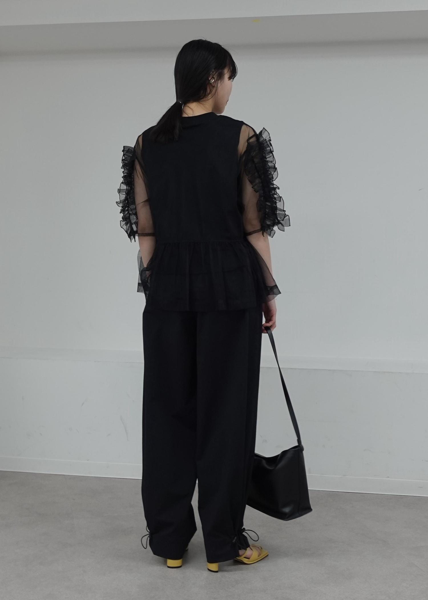予約ADAM ET ROPÉ FEMME【サステナブル】フリルギャザーチュールトップスブラック / F¥14,300レビュー一枚で決まってくれるトップス。ふわっとしたシルエット、シアー感が程よく女性らしくかわいらしくみせてくれます。