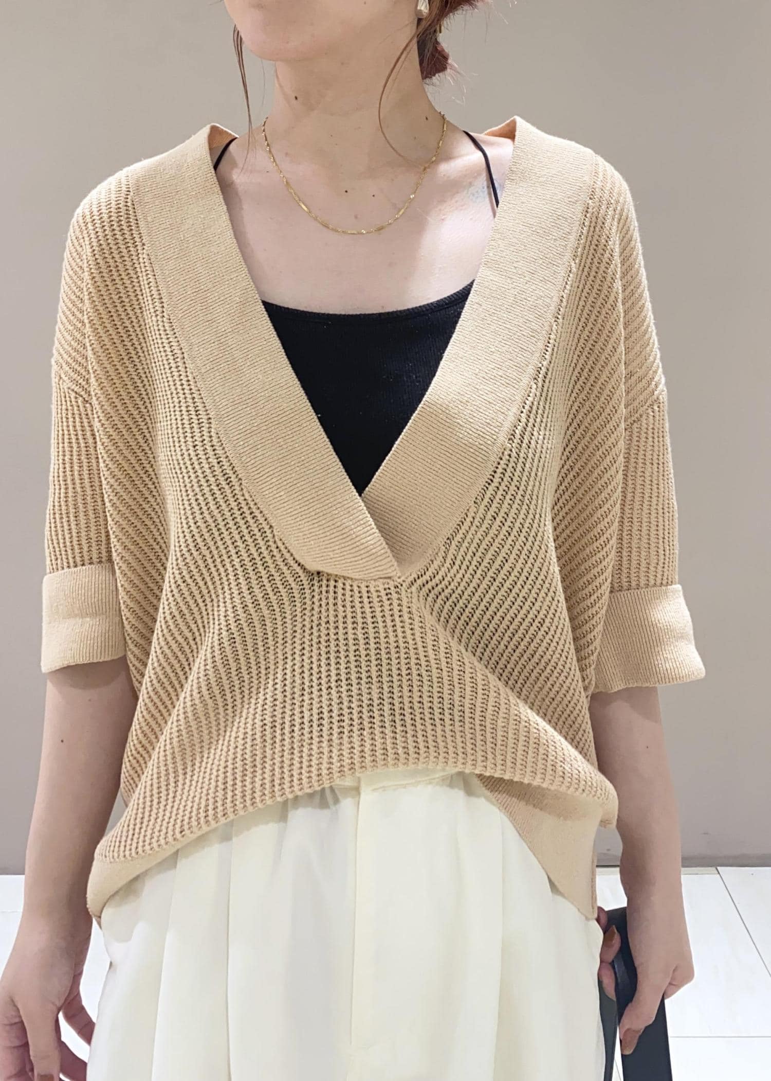 深めのVネックが特徴的で、キャミソールやロゴTをレイヤードしても可愛いですよね♡