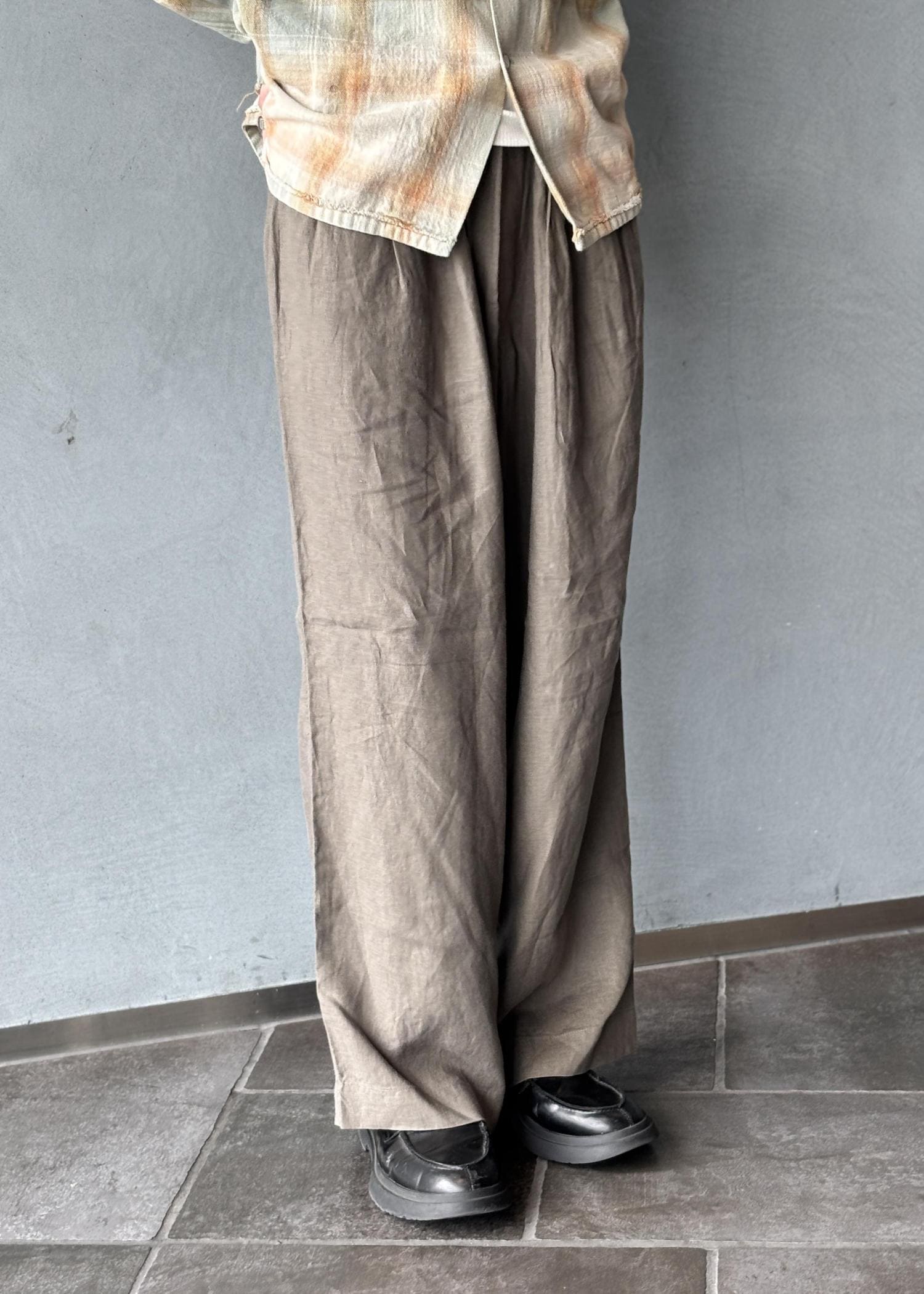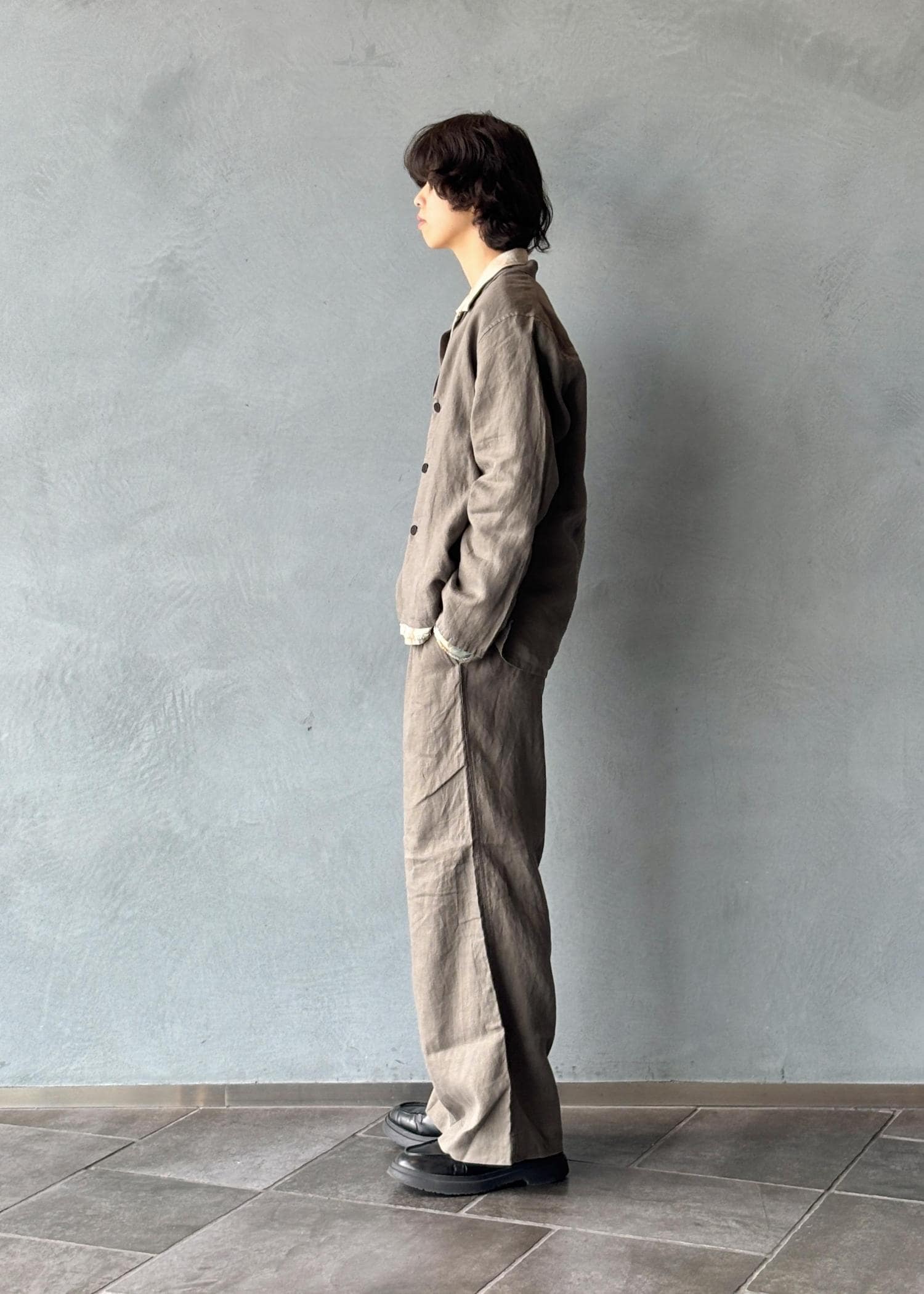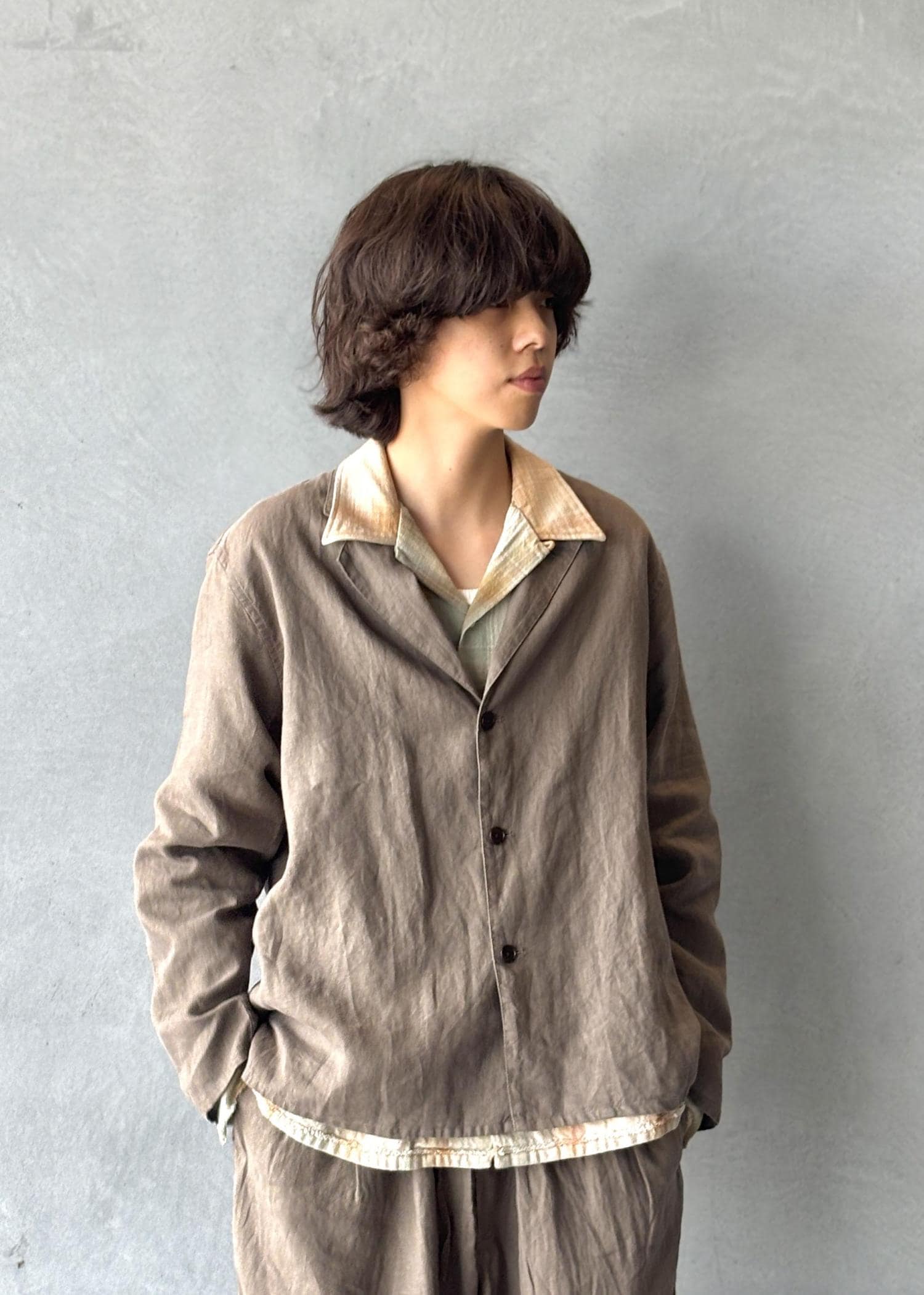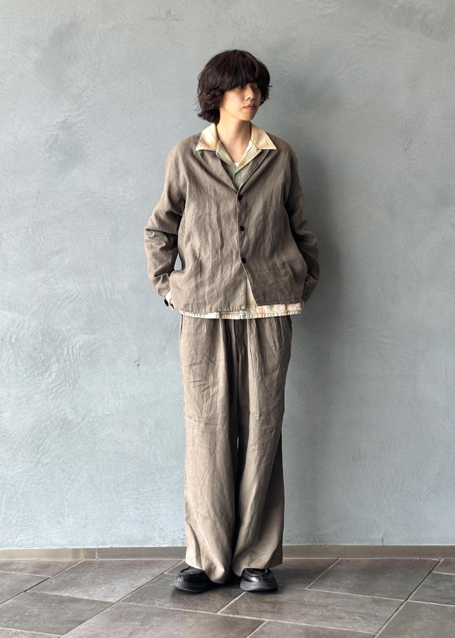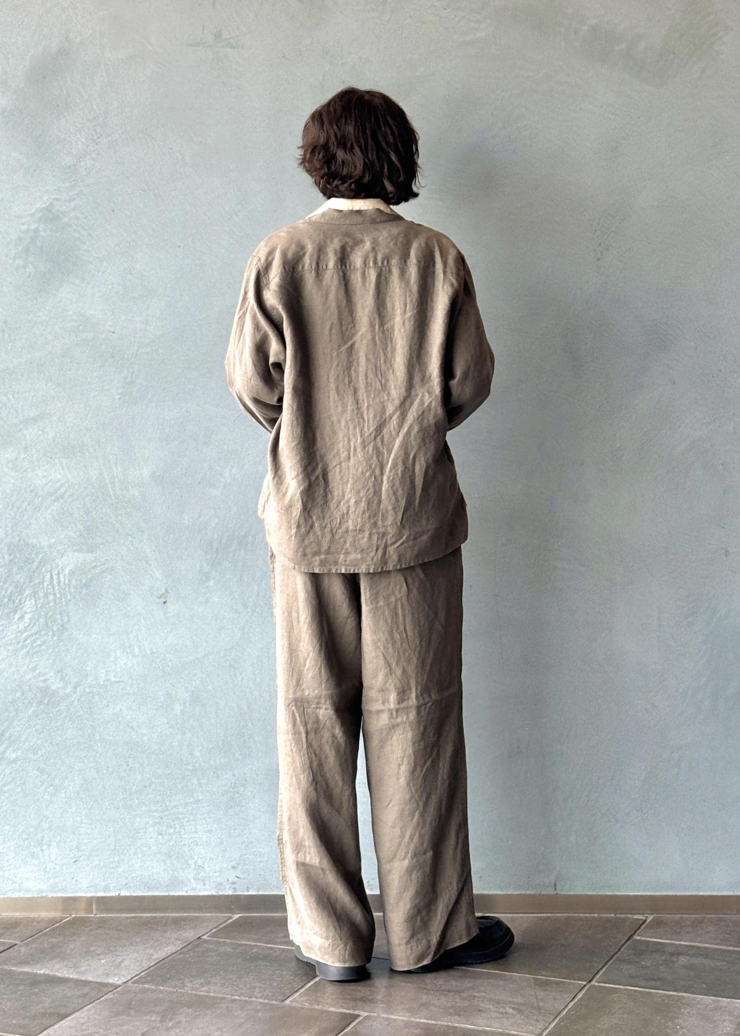 オリジナルのリネンセットアップをベースに、全体を落ち着いたトーンでまとめたスタイリング。リネン特有の軽やかさと柔らかい質感により、リラックス感のある着心地と自然な抜け感を演出しています。