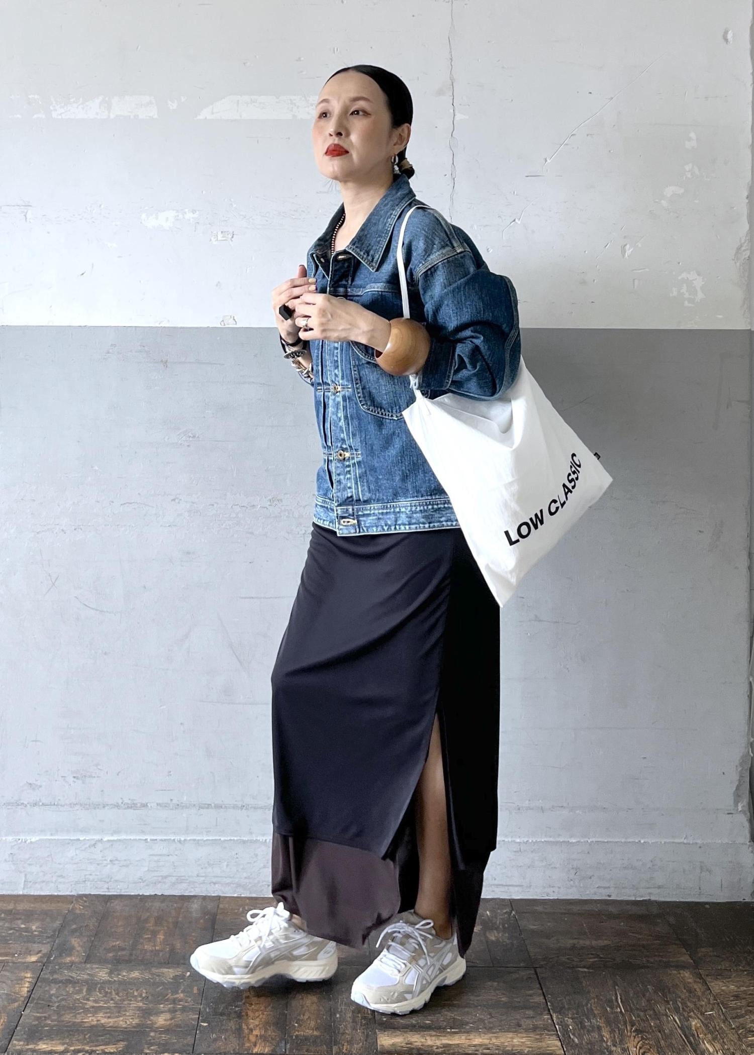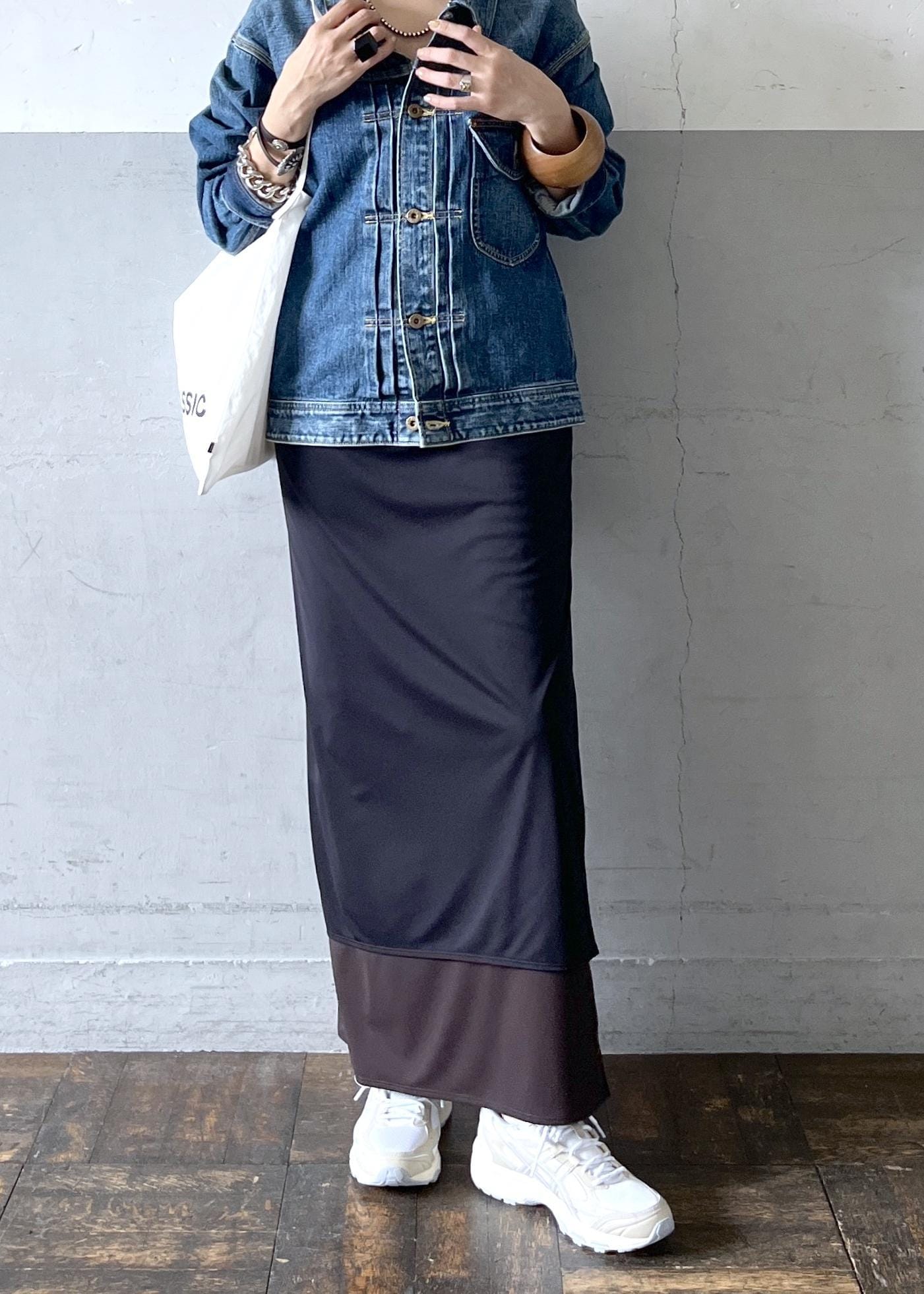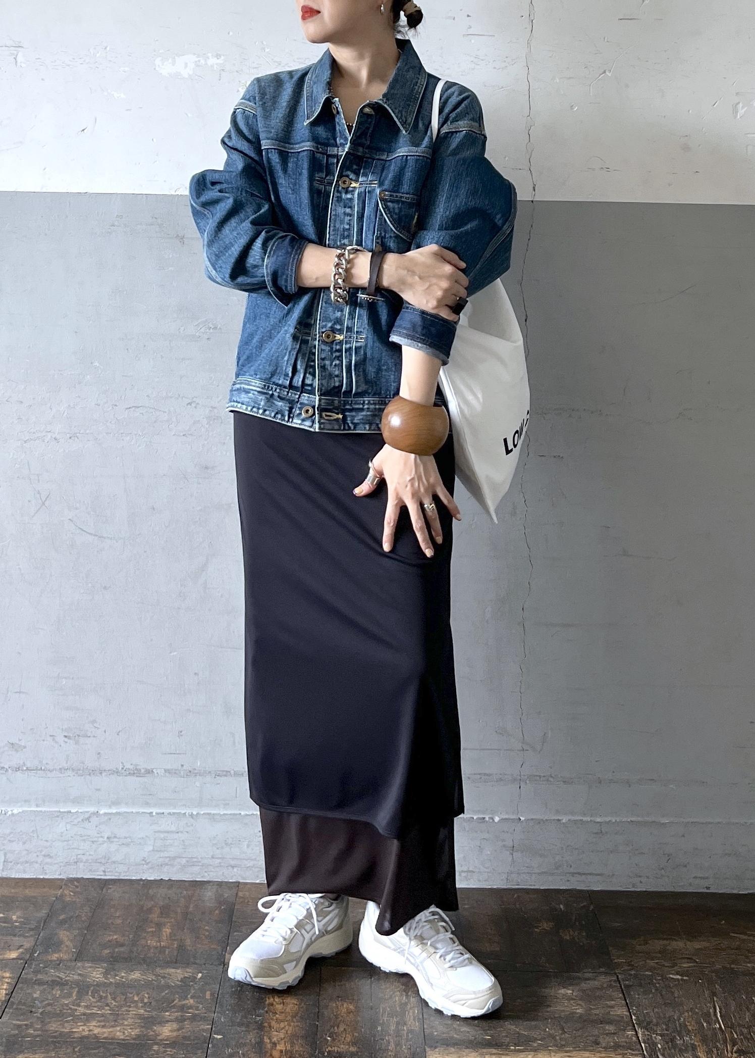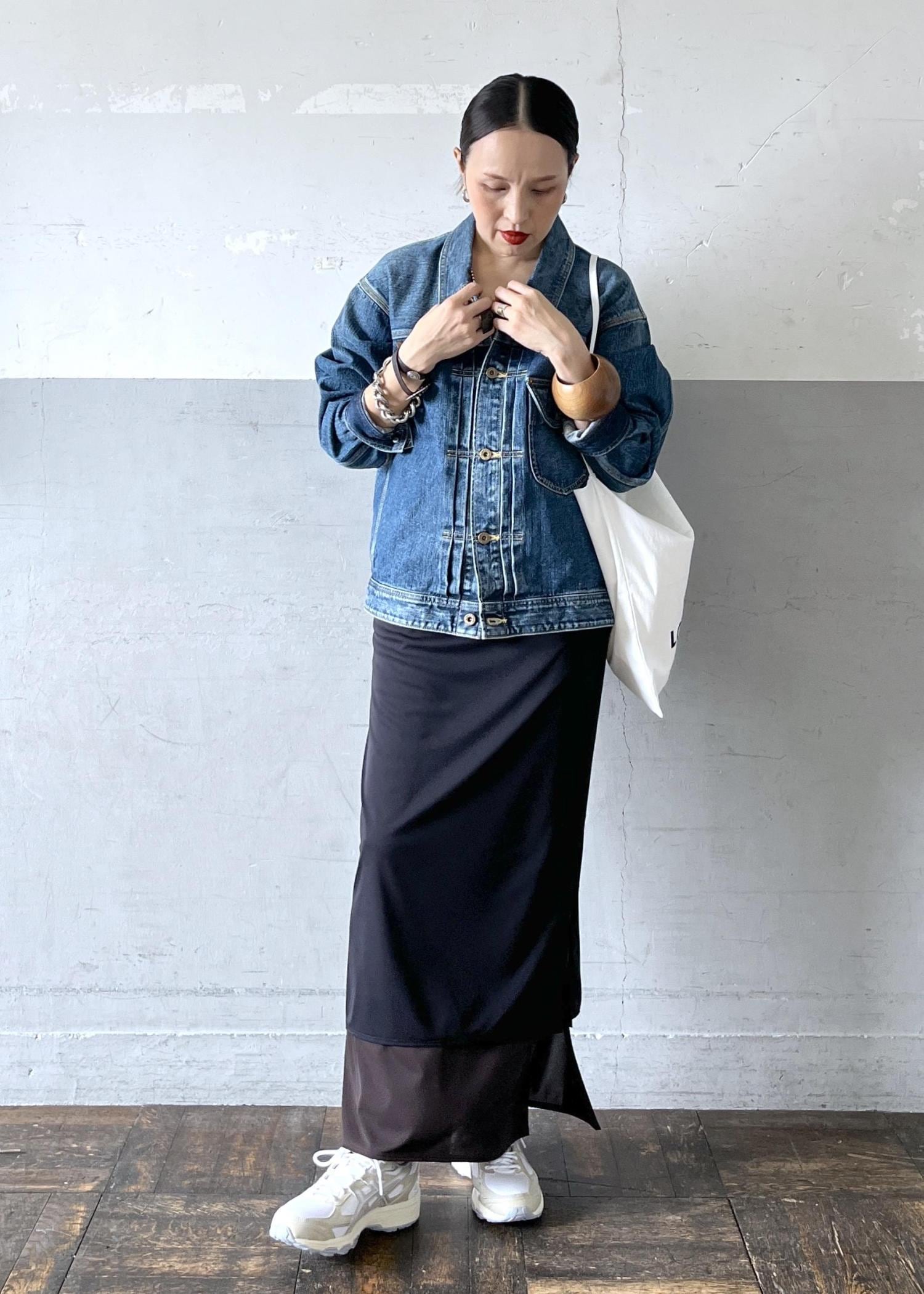 レイヤードデザインのロングスカートを合わせたシンプルスタイル。