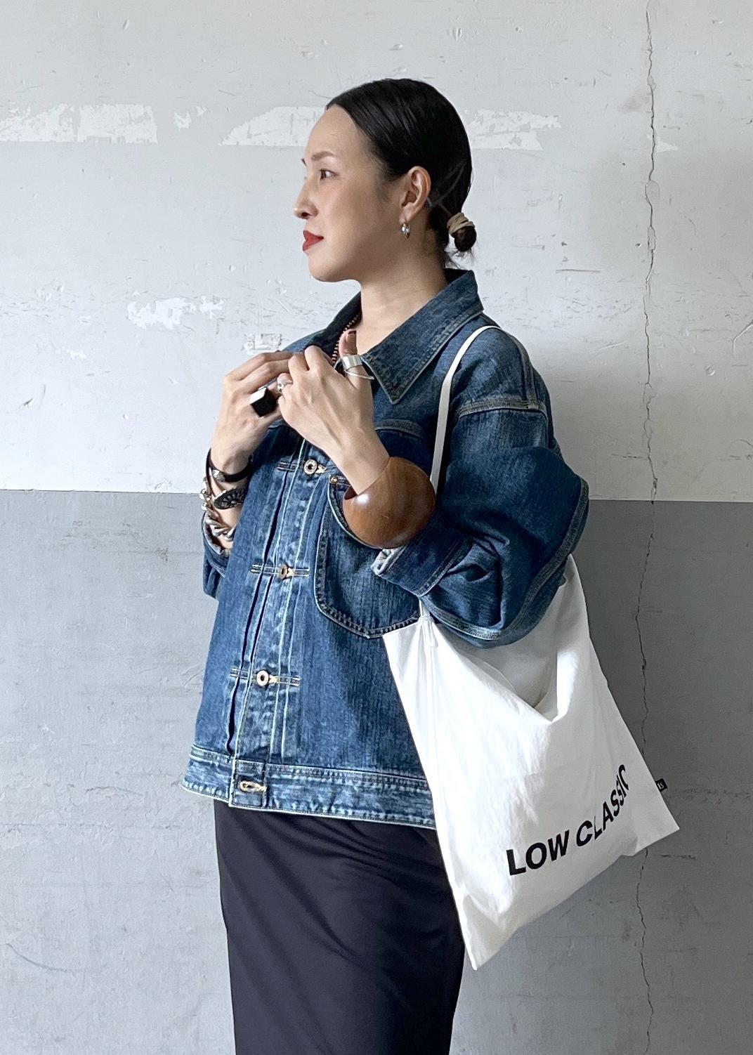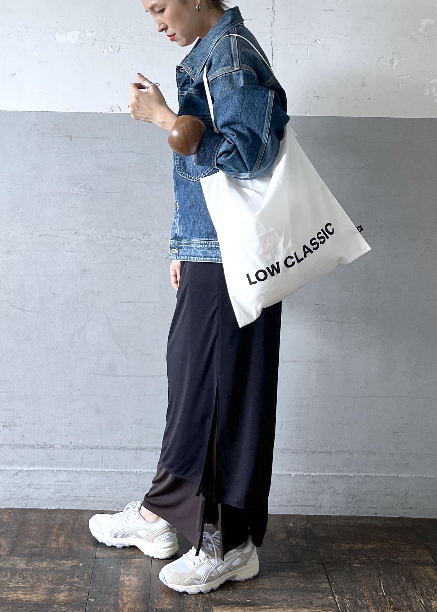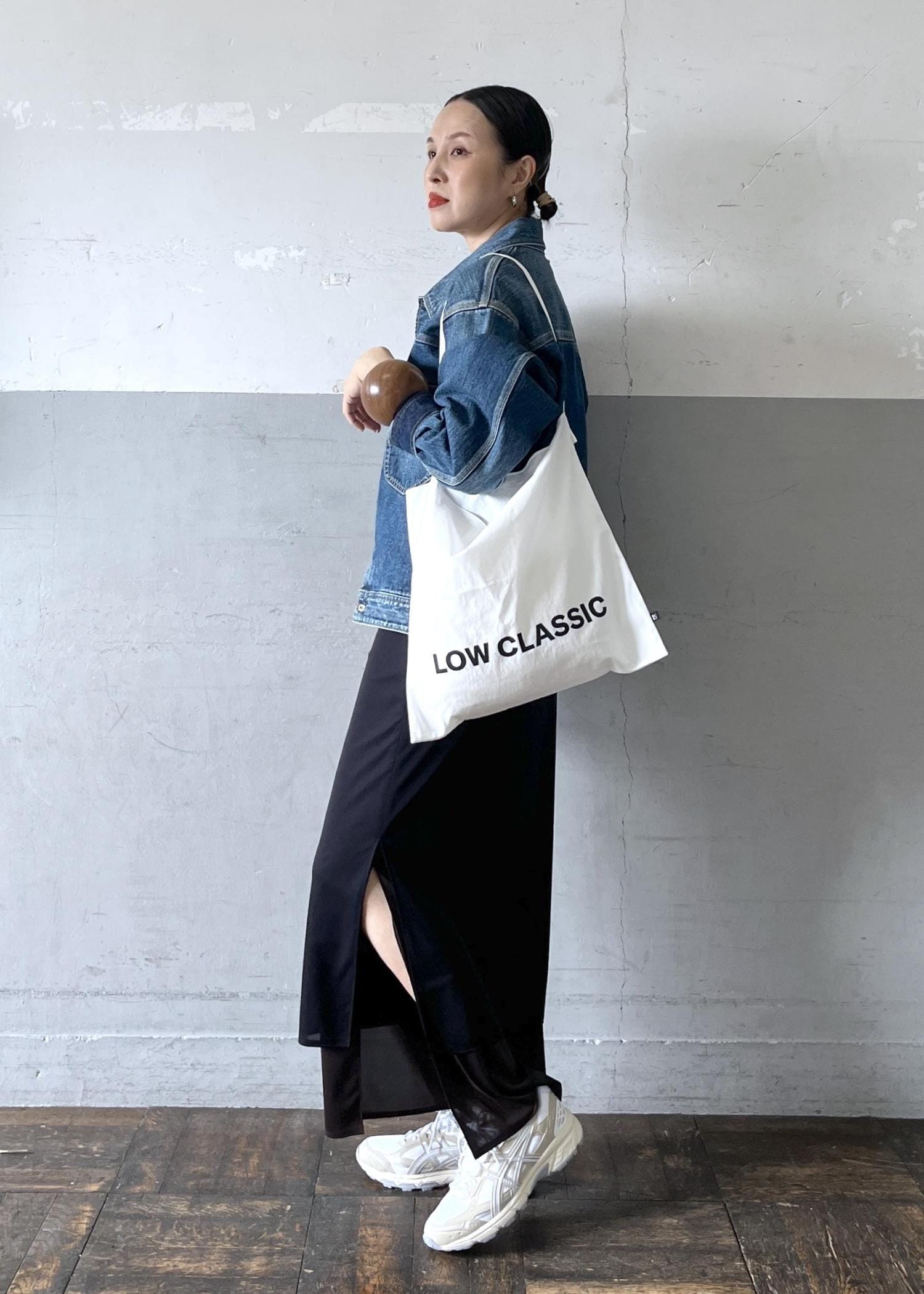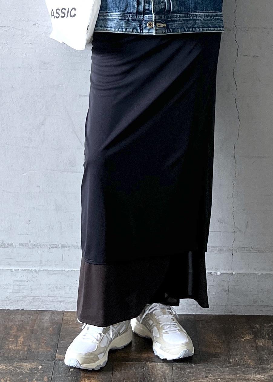 レイヤードデザインのロングスカートを合わせたシンプルスタイル。
