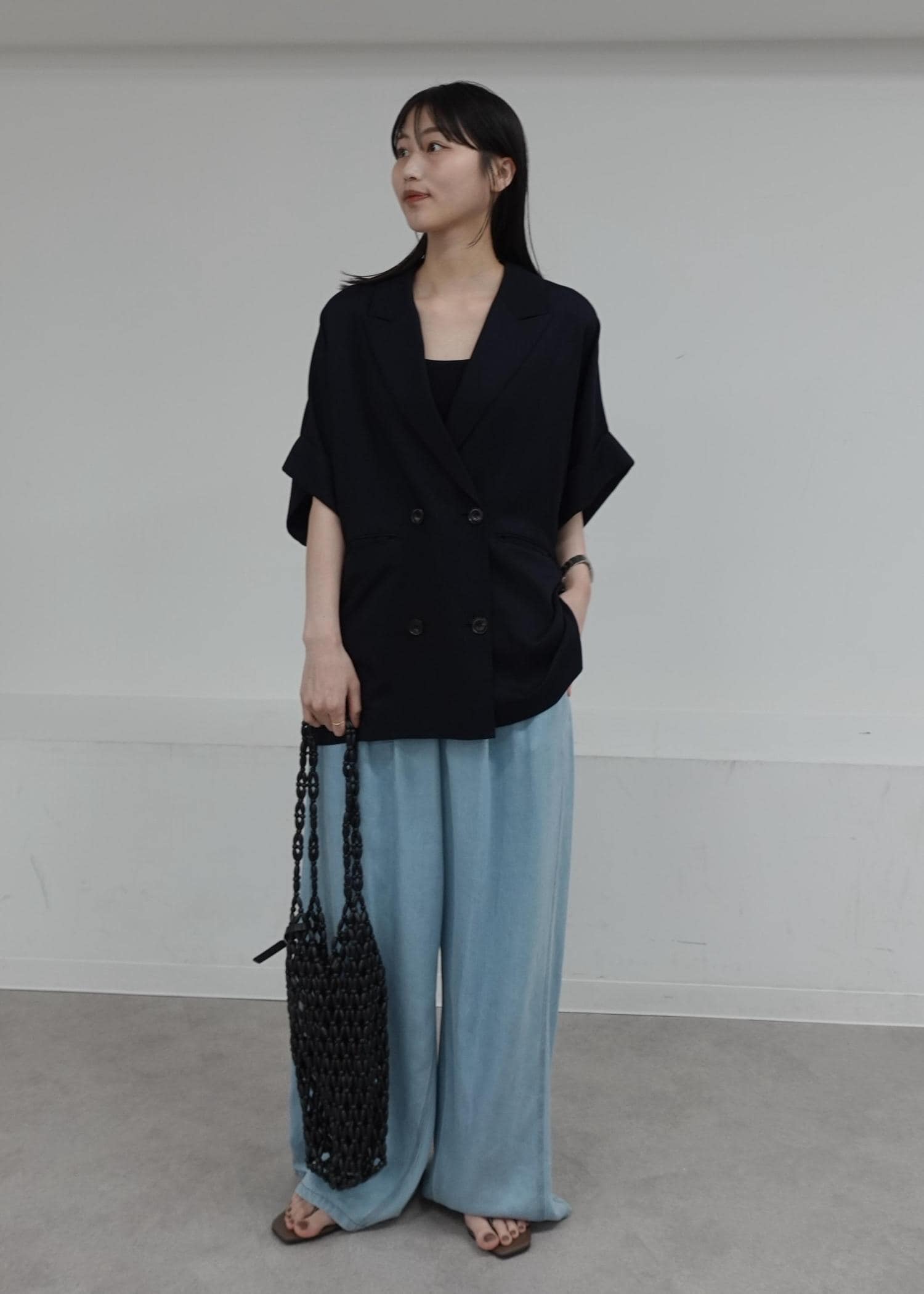 存在感のある太めのヒールサンダルを合わせて、より大人っぽく仕上げました♪