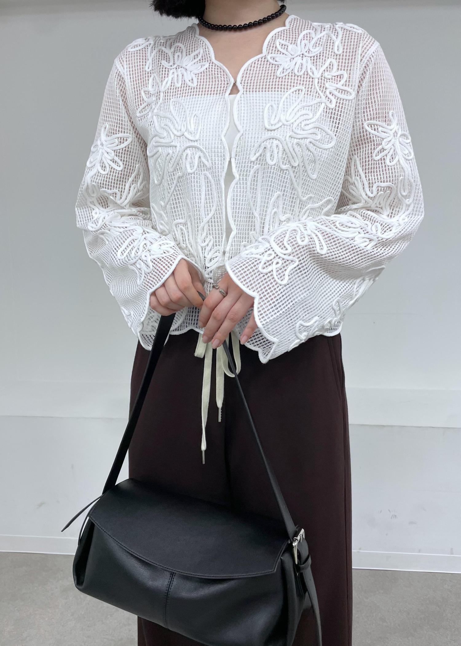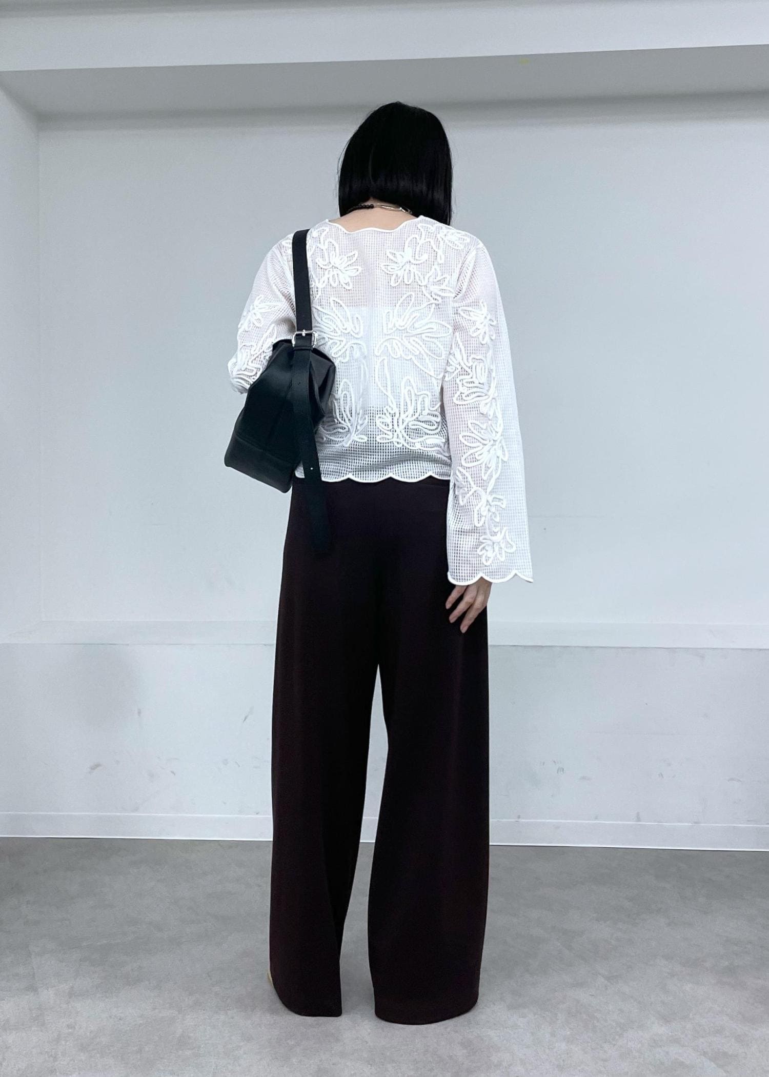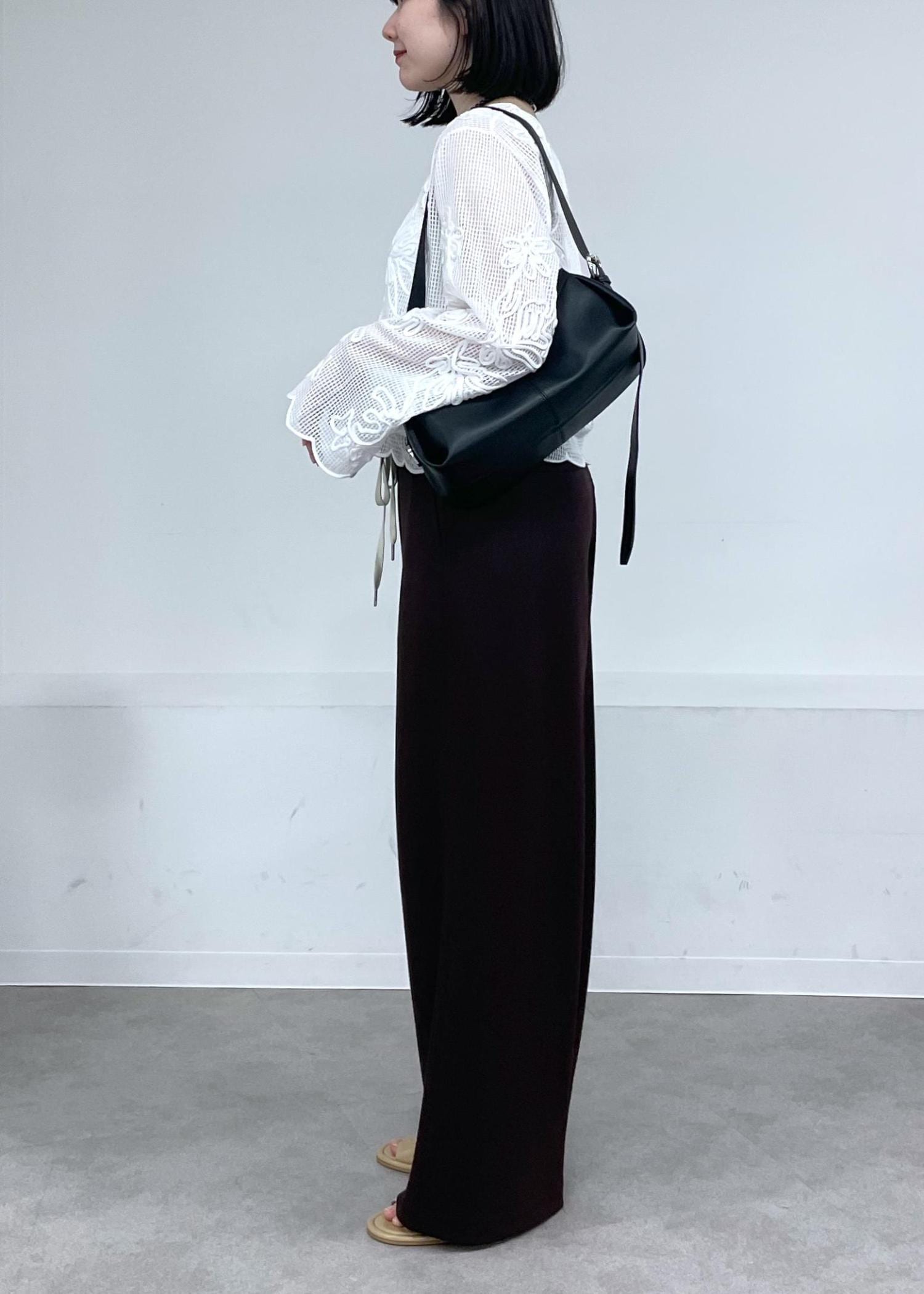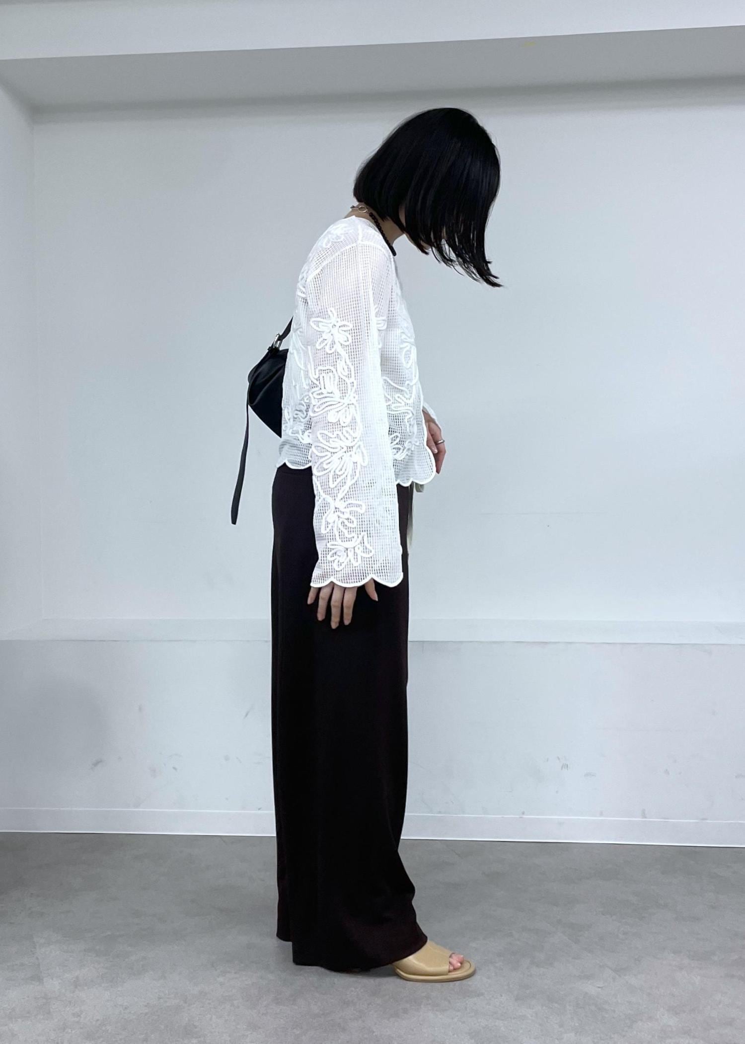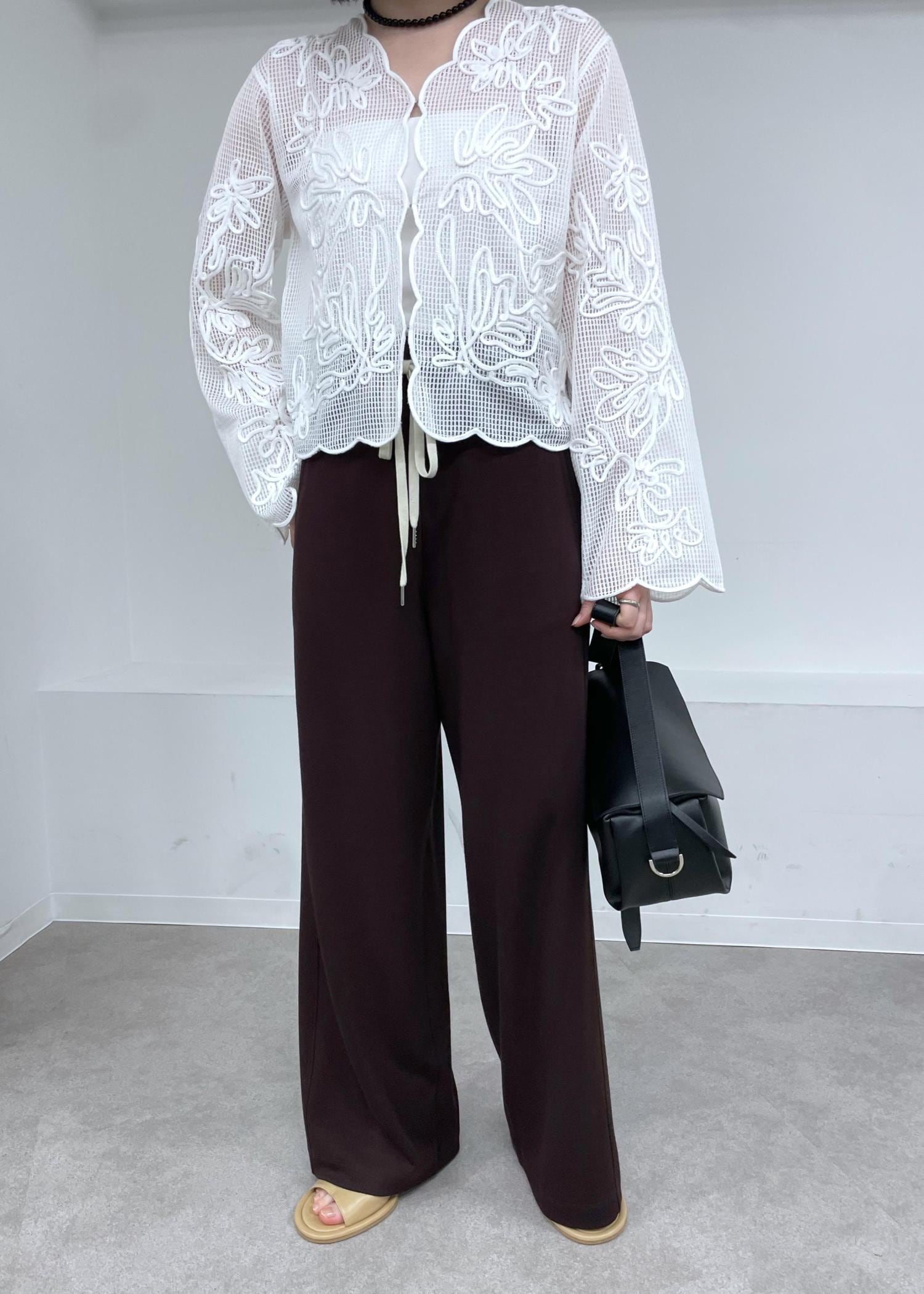 華やかなラインアートや裾の丸いラインがポイントなブラウスに、柔らかな素材感が魅力的なジャージパンツを合わせて、カジュアルコーデにしました◎
