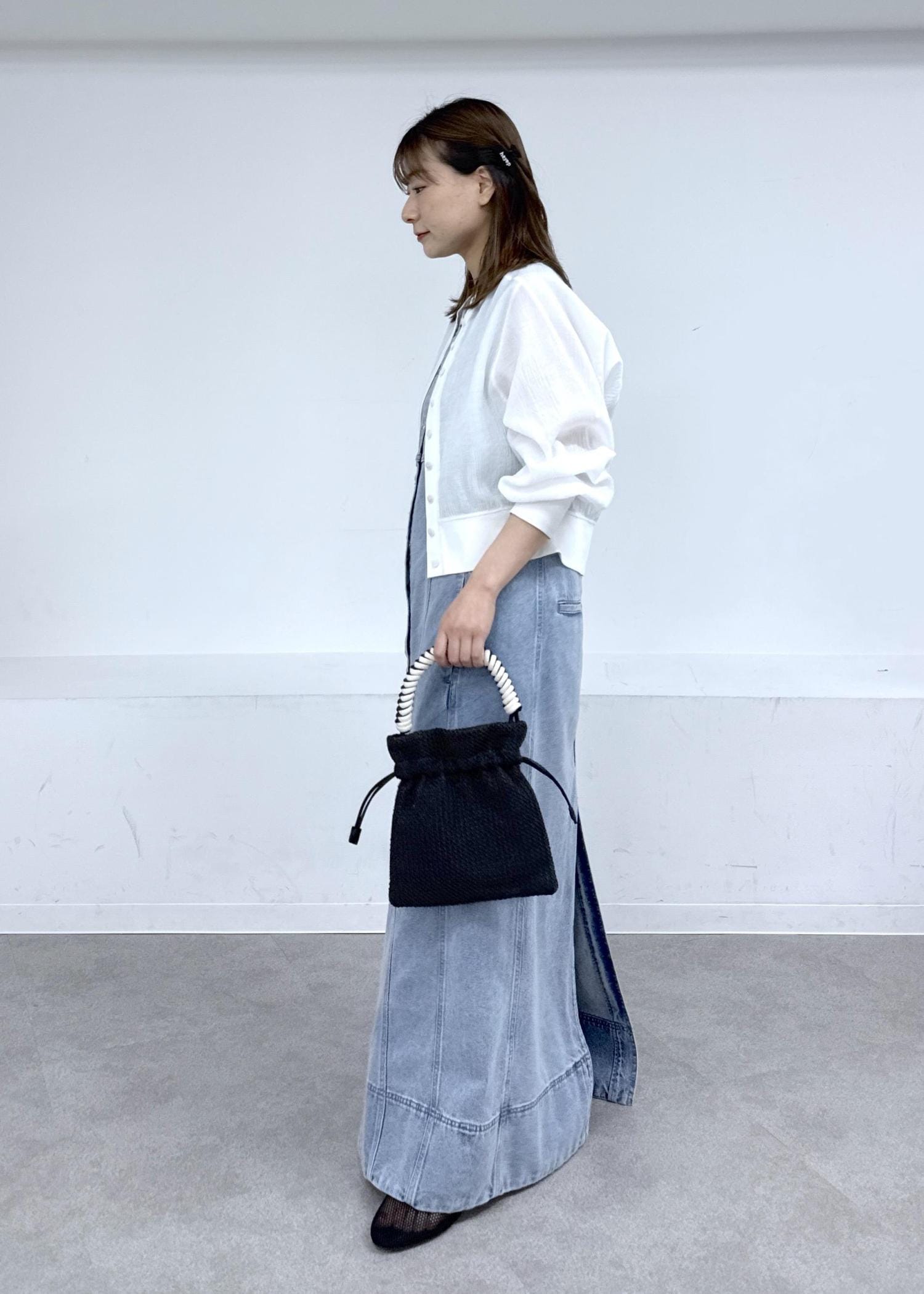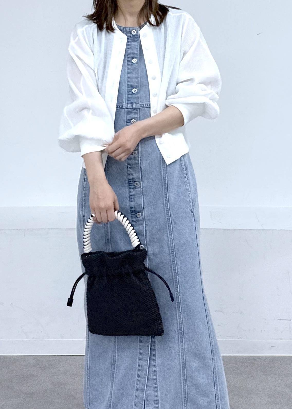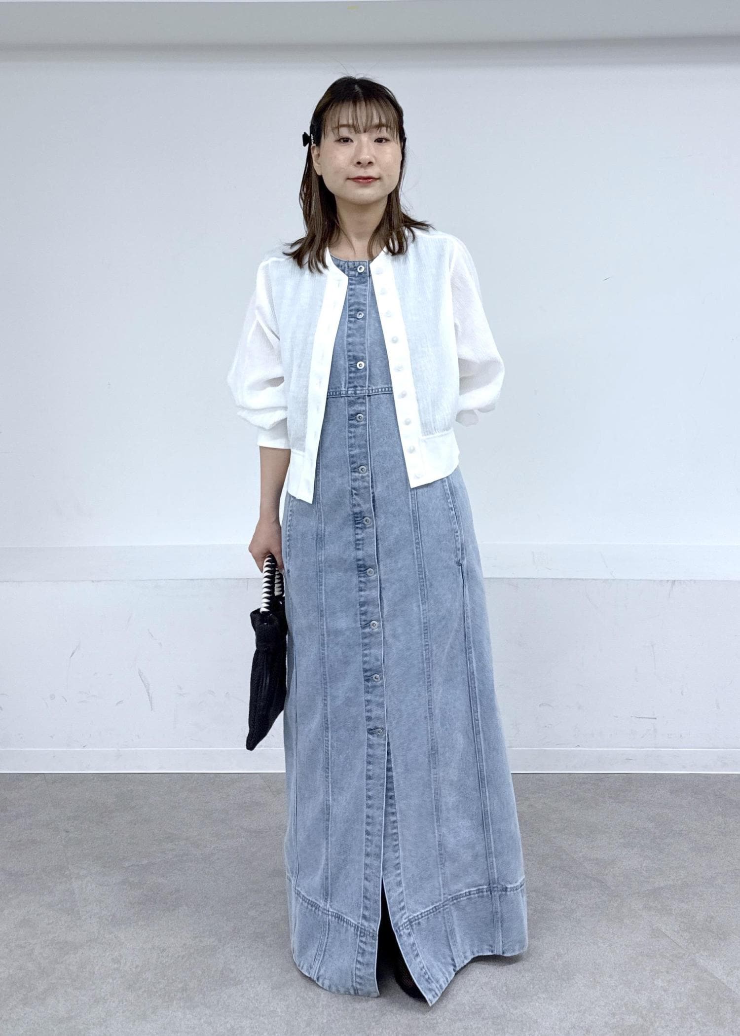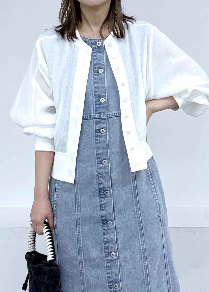 デニムワンピースにコンパクトなカーディガンで