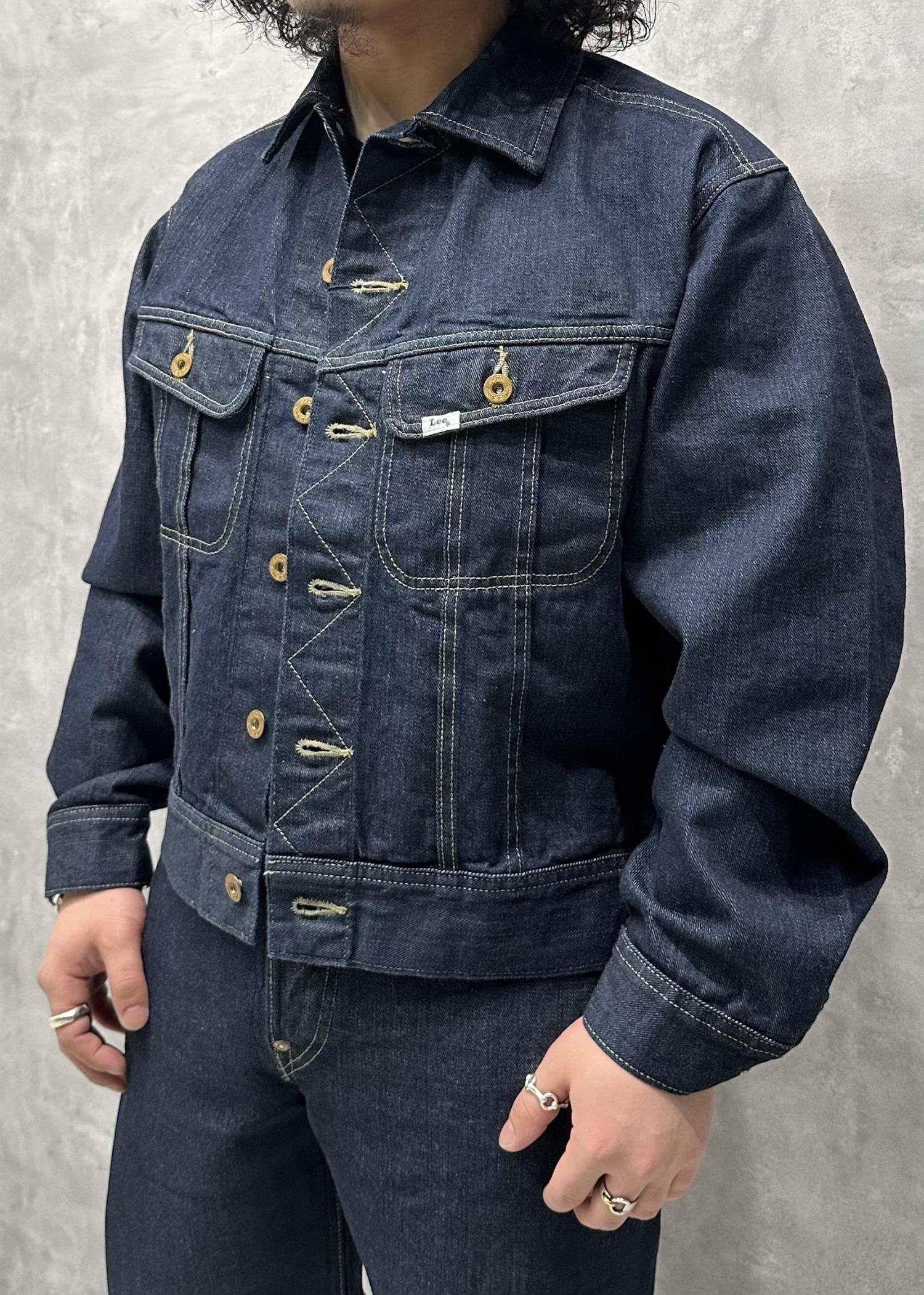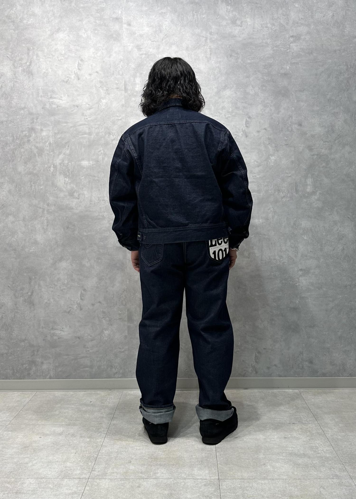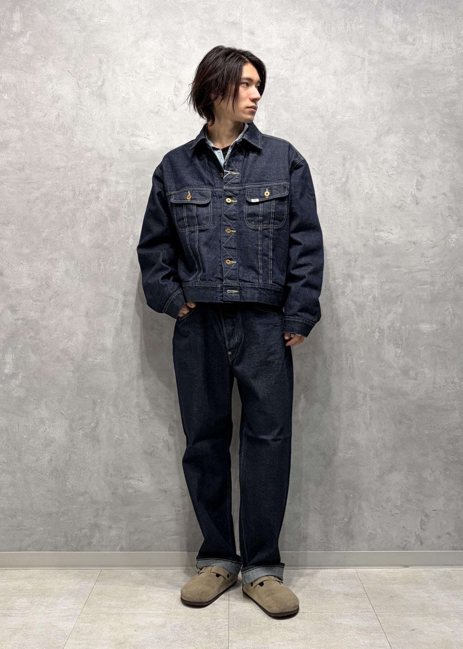 1948 年に意匠が整ったとされる「101-J RIDERS JACKET」をモチーフにパンツと同時期に制作されていた“COWBOY”のドーナッツボタンを使用した古着市場でも非常に稀有なモデルを再現。