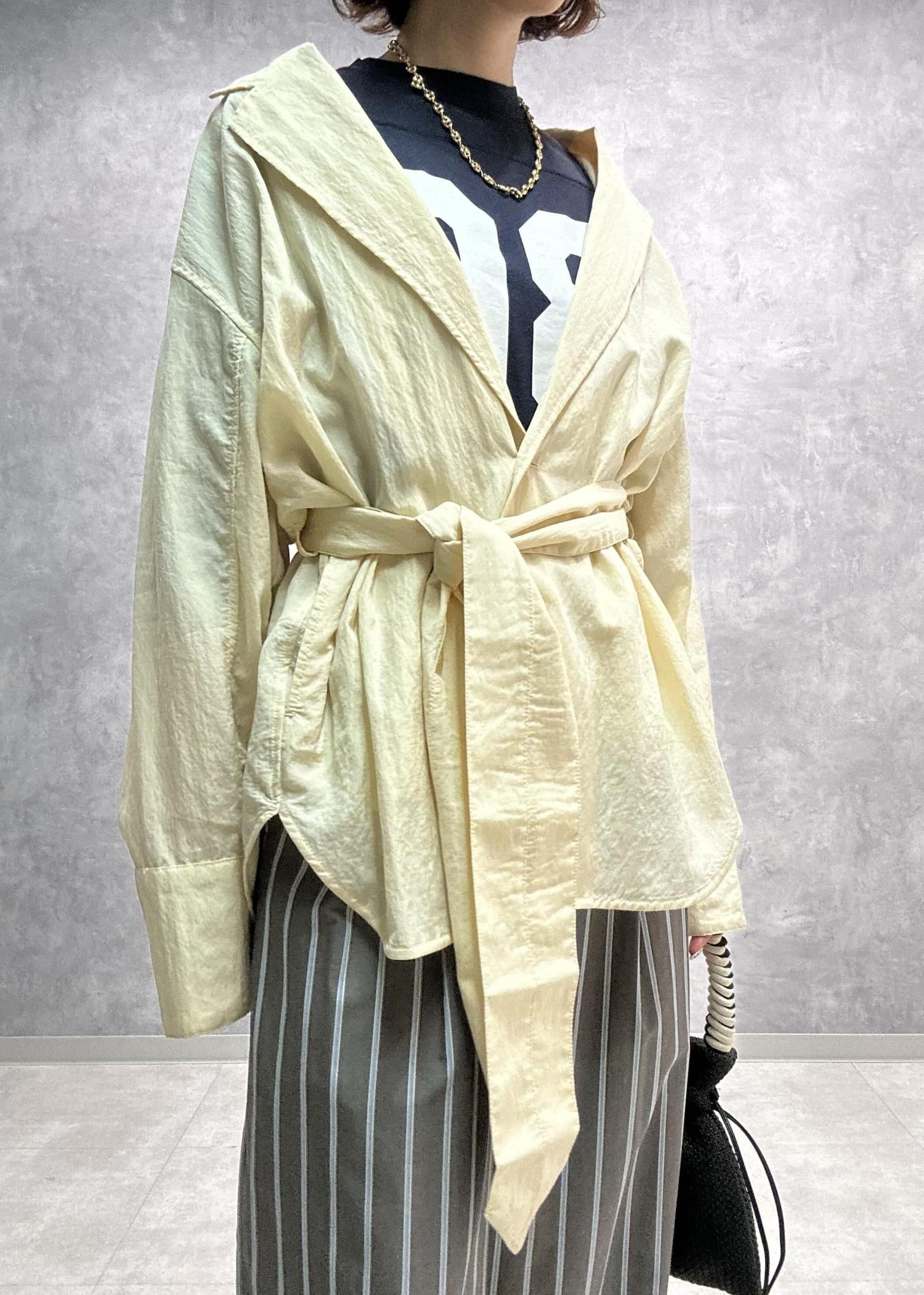 ウエストのリボンと程よい光沢感が女性らしいジャケットです。