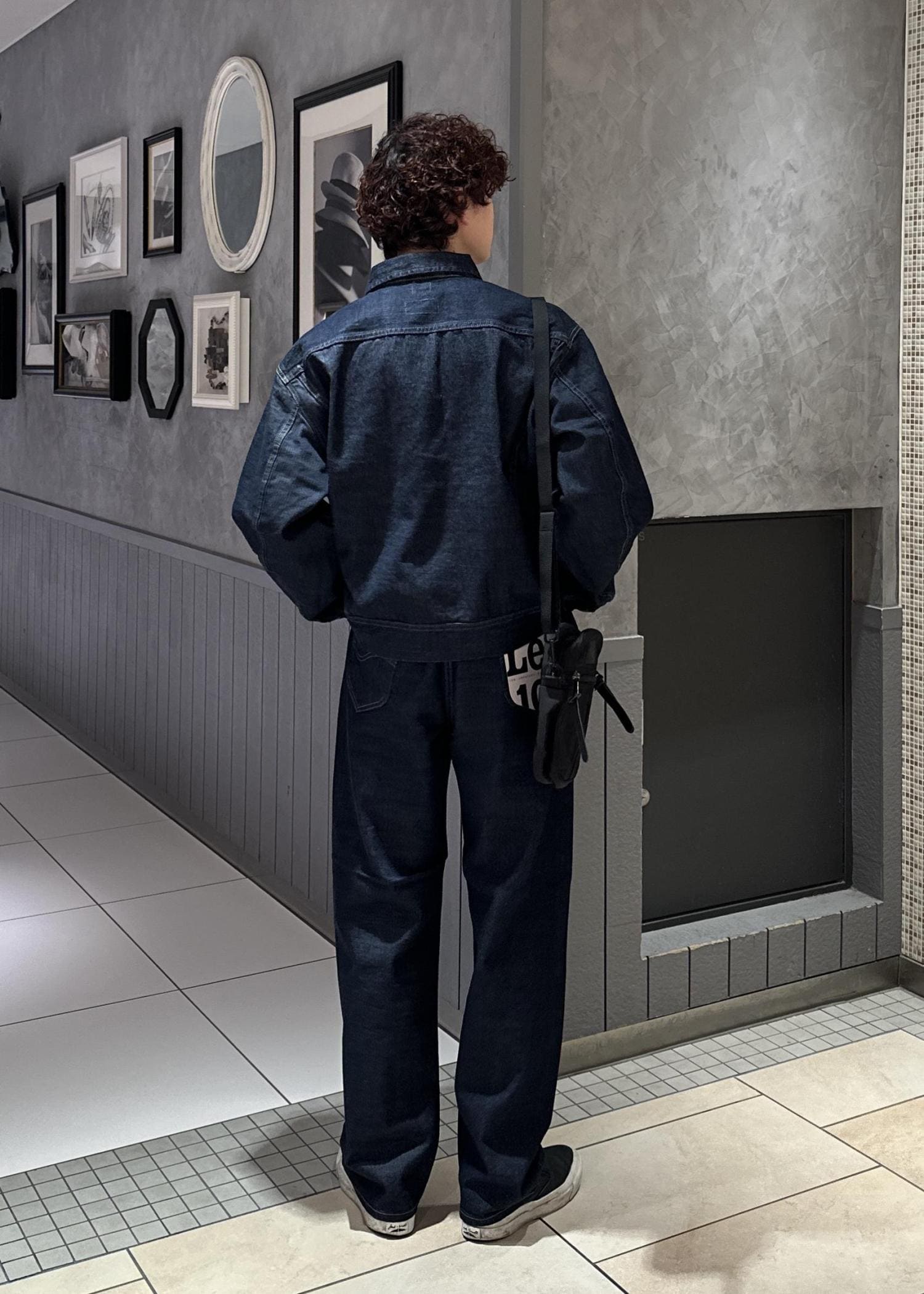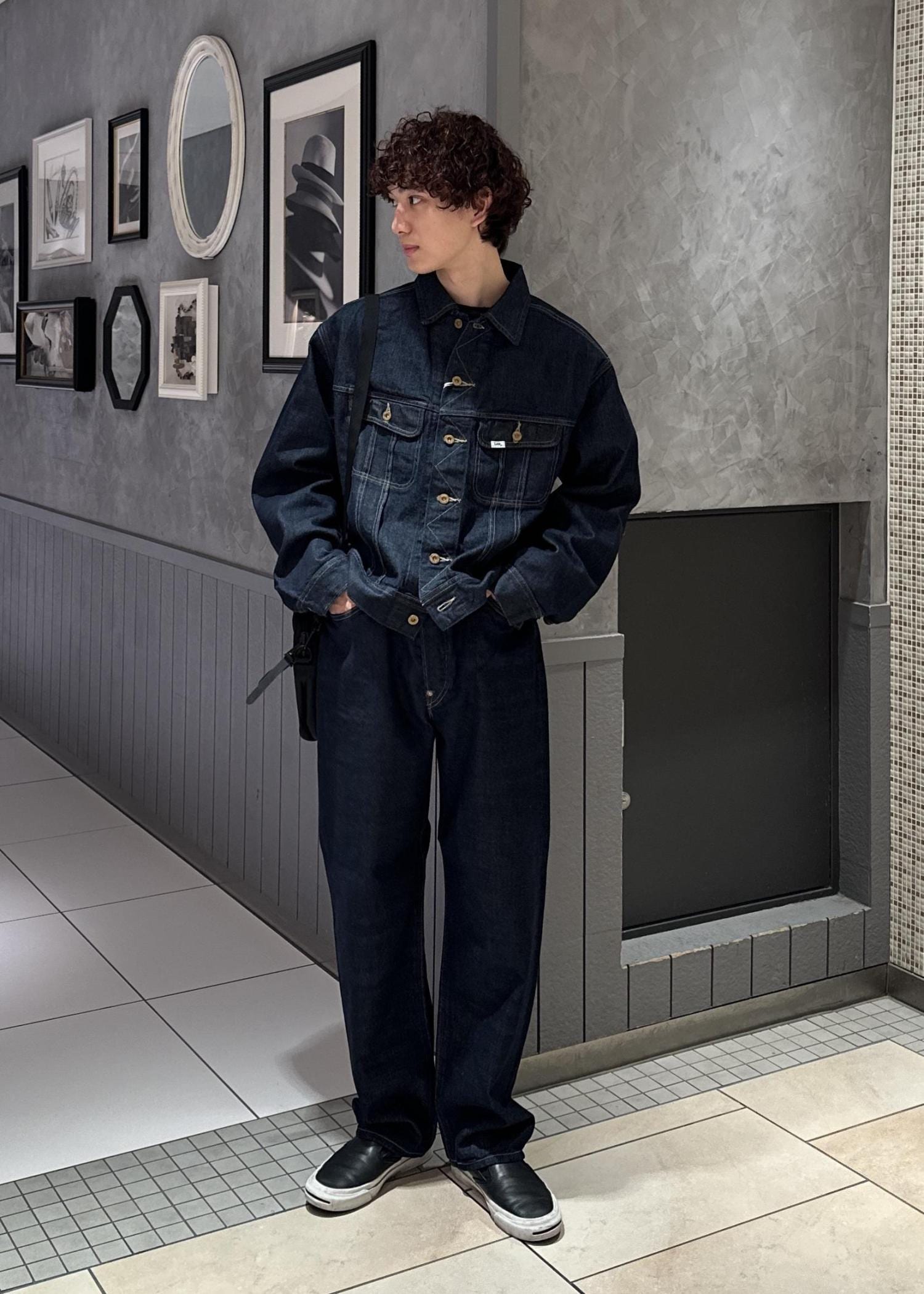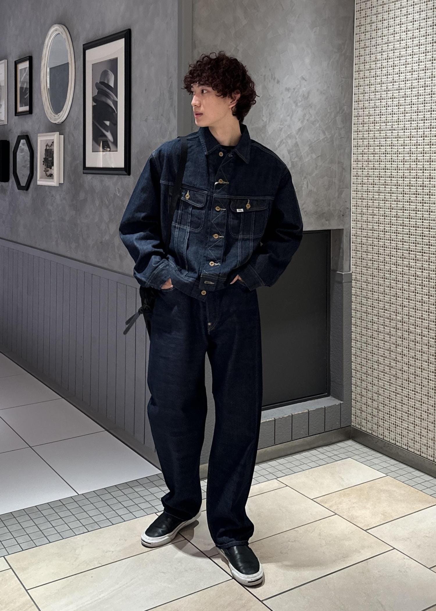 Lee、MARKAWAREとADAM ET ROPÉ よるトリプルコラボレーションモデルのセットアップを使ったコーデ。黒のバッグと靴で落ち着いた印象に仕上げました。