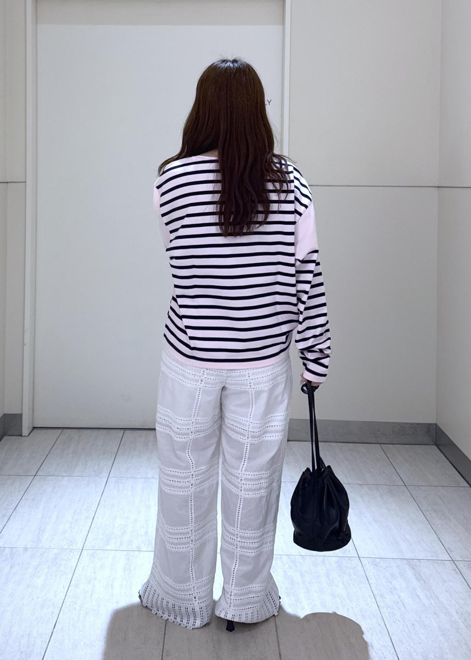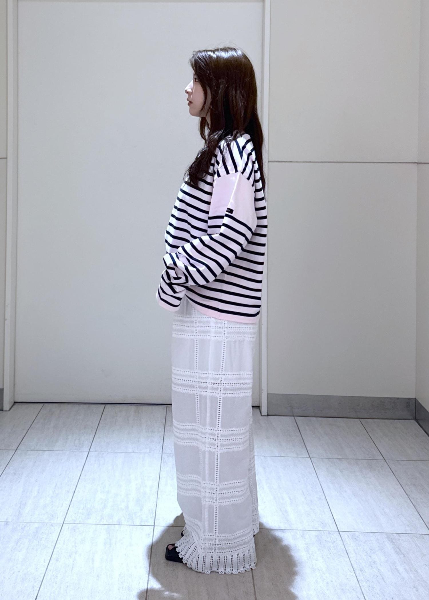 ウエストはゴムで裏地も付いているのでので透け感も気になりません。ヒール合わせてだと低身長さんでも着れます◎
