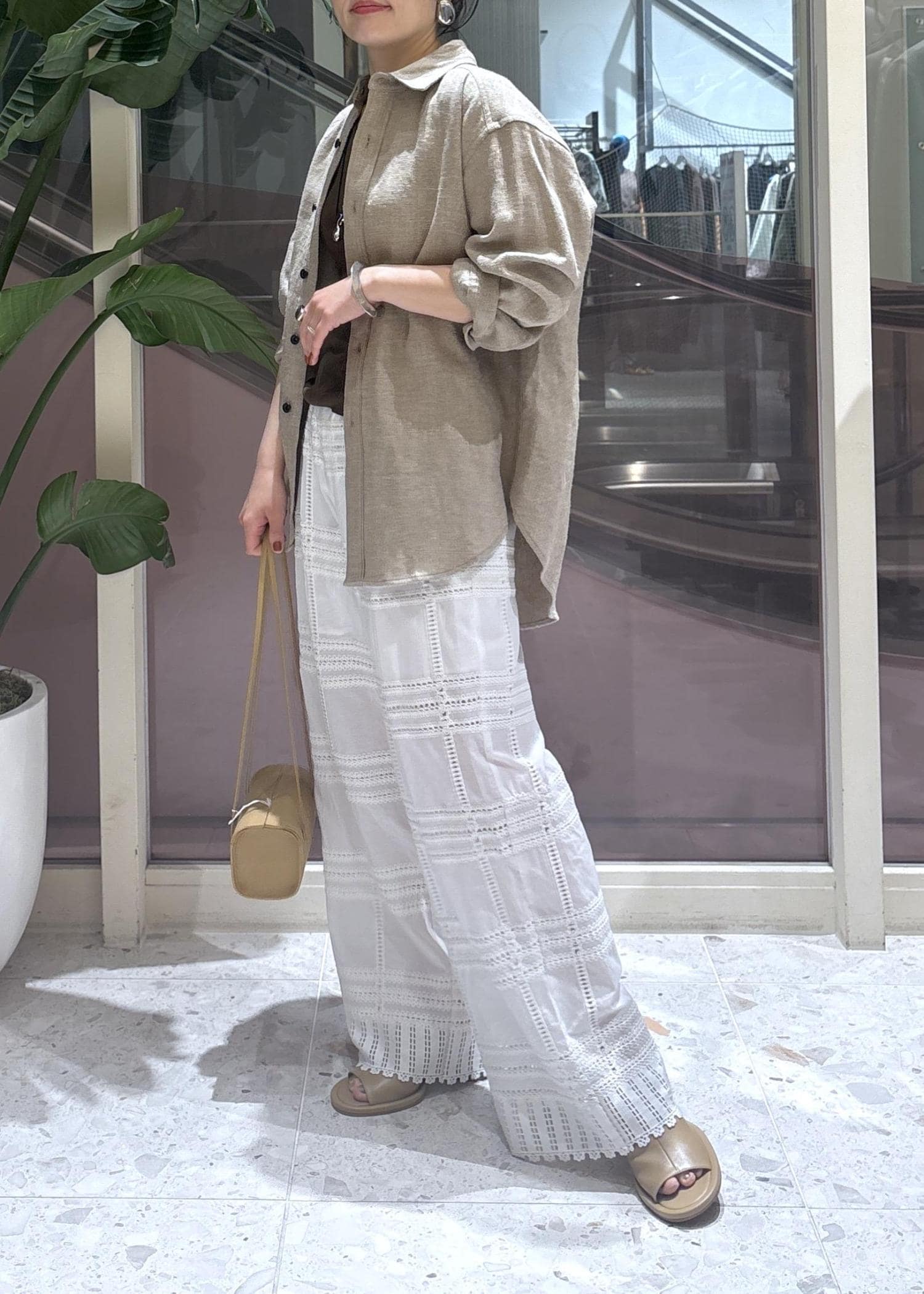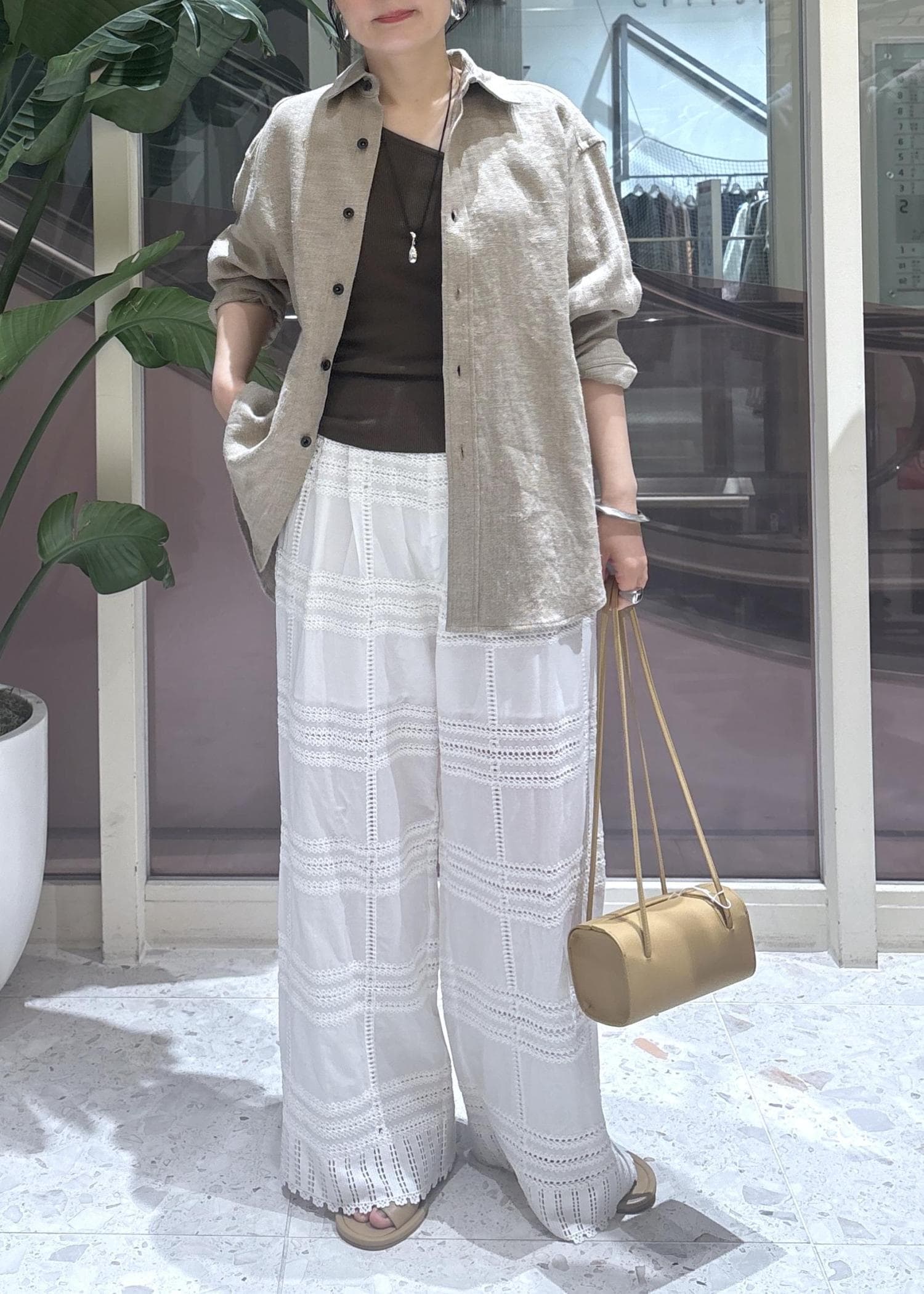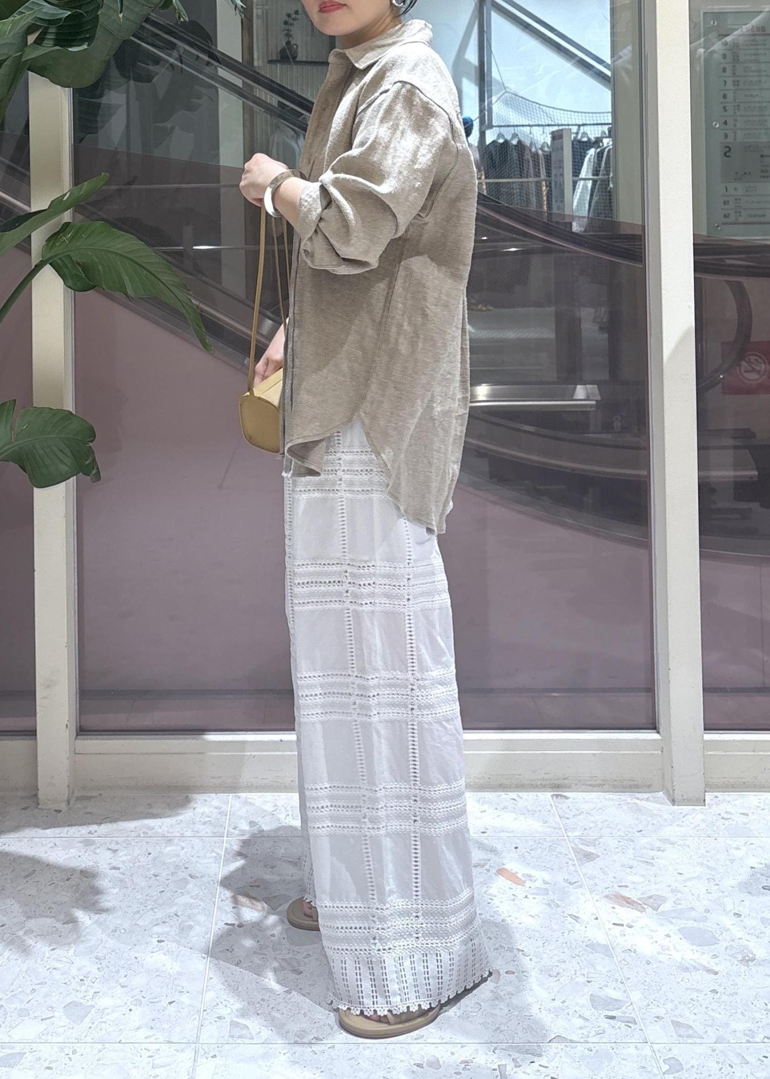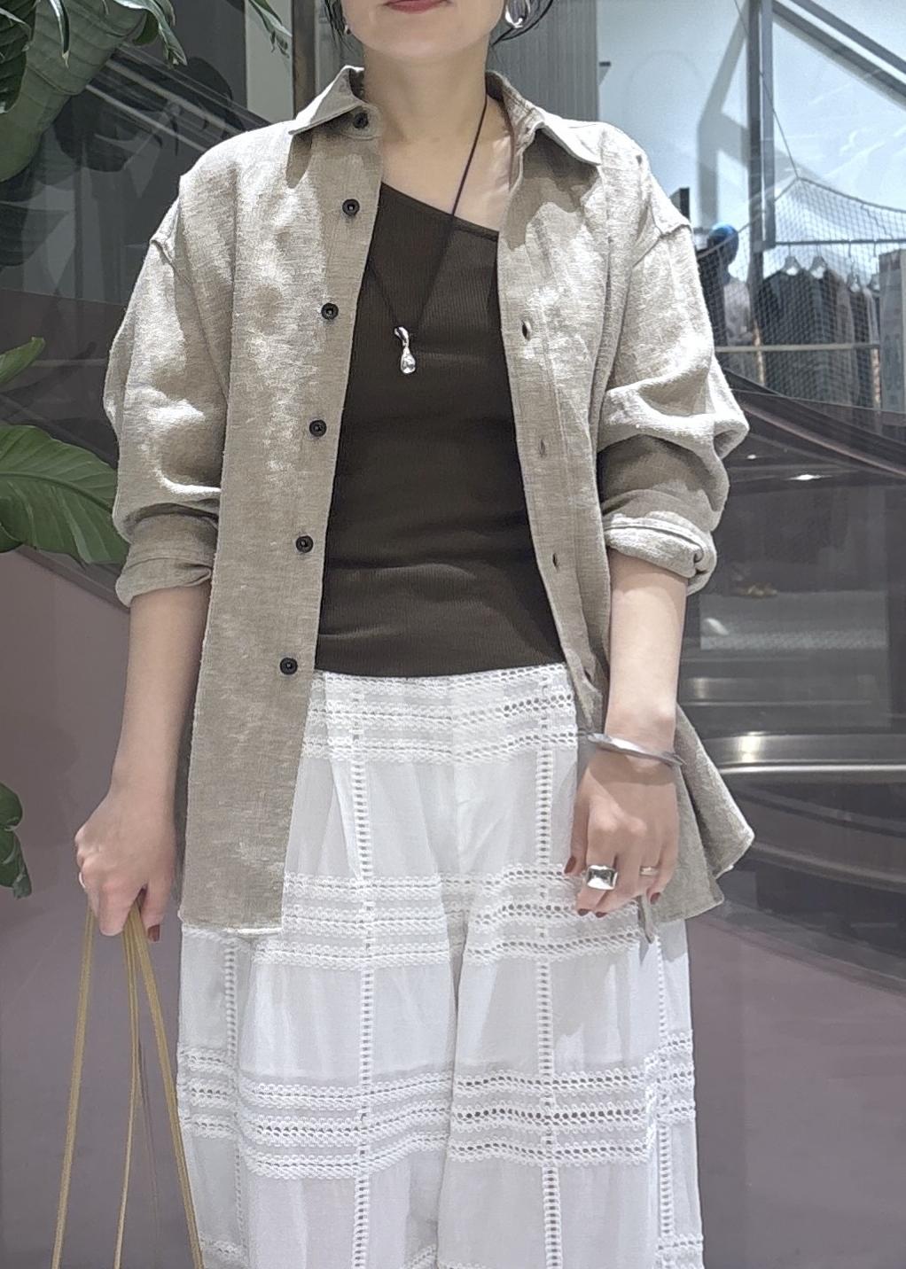 デニムシャツと合わせたりスウェットと合わせたりイメージは広がりますが、ちょっと大人っぽくリラックスした雰囲気にしてみました。