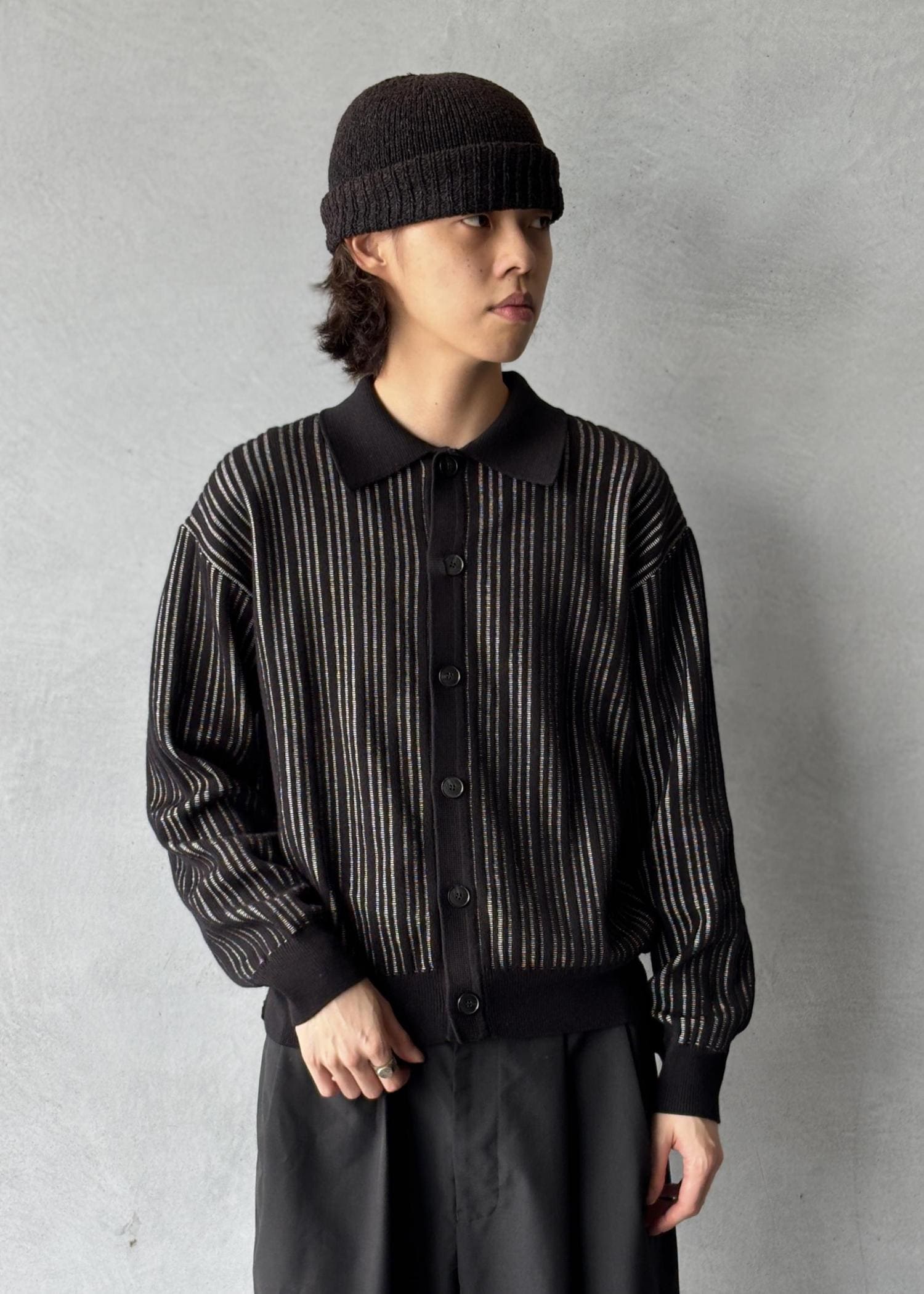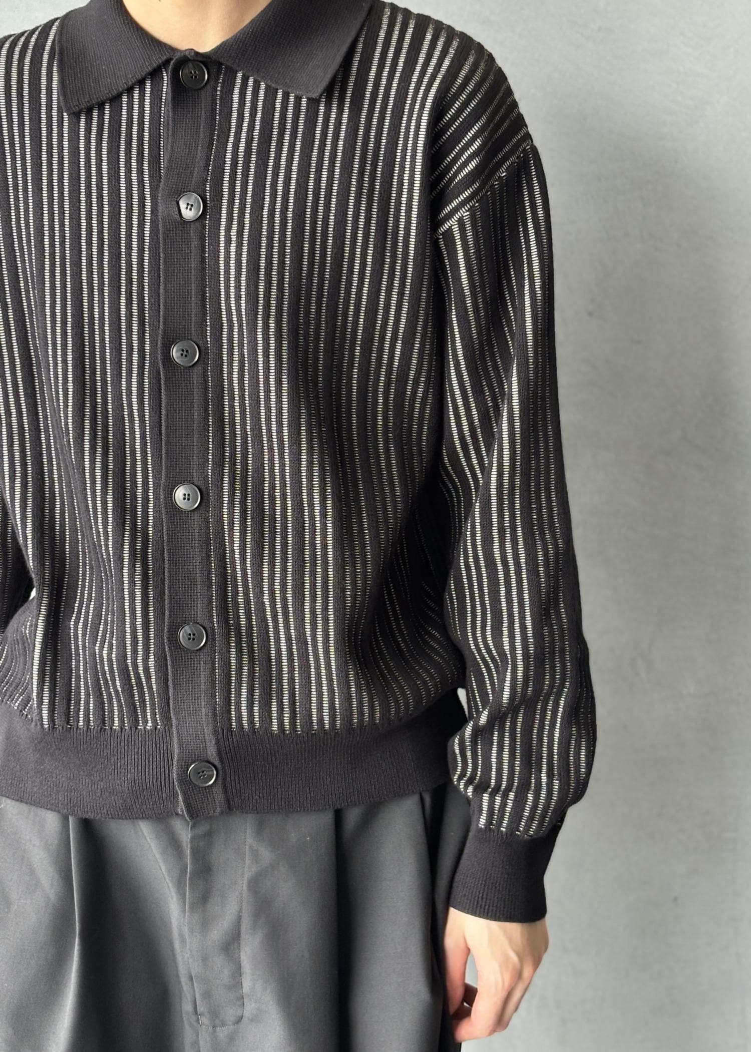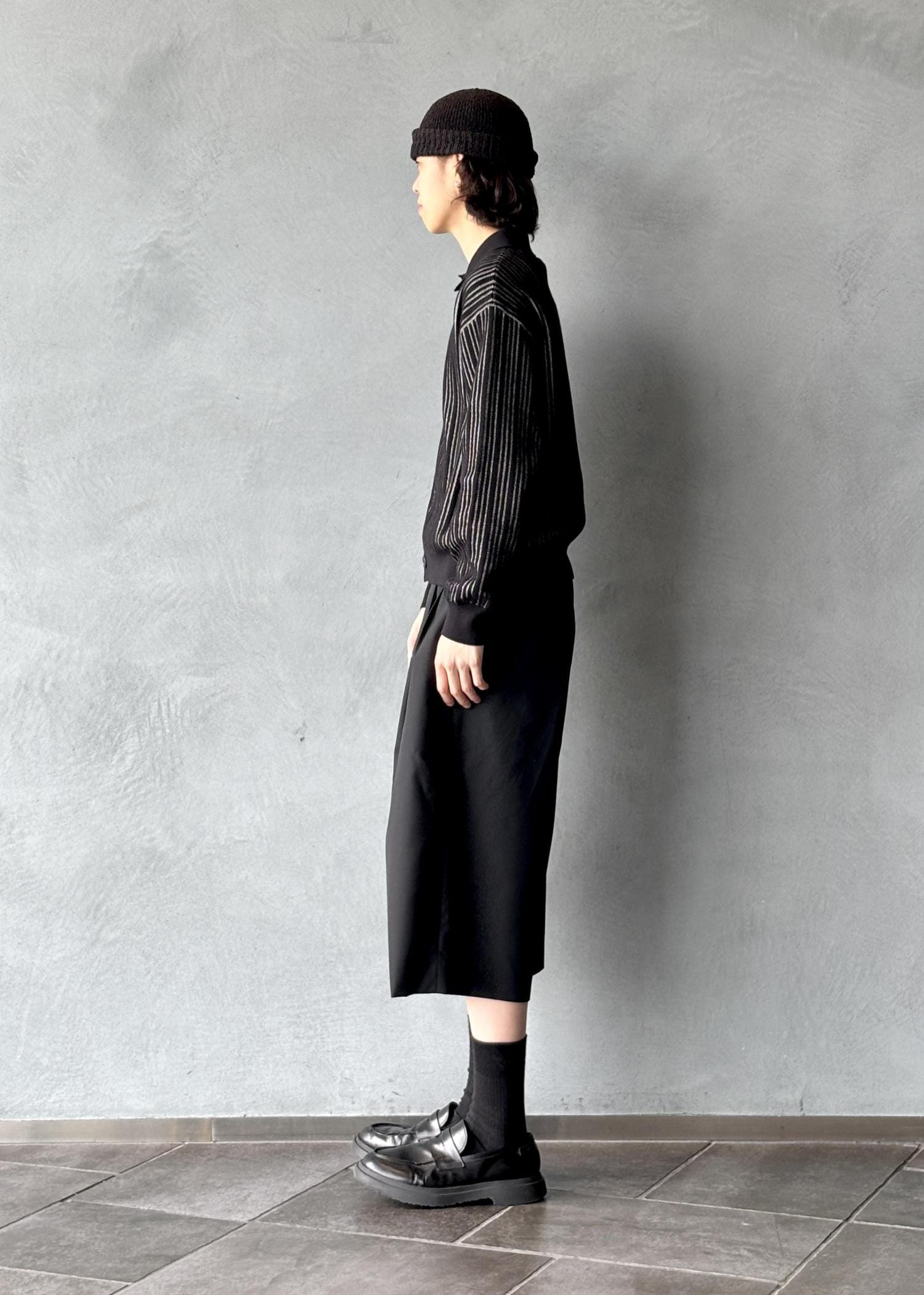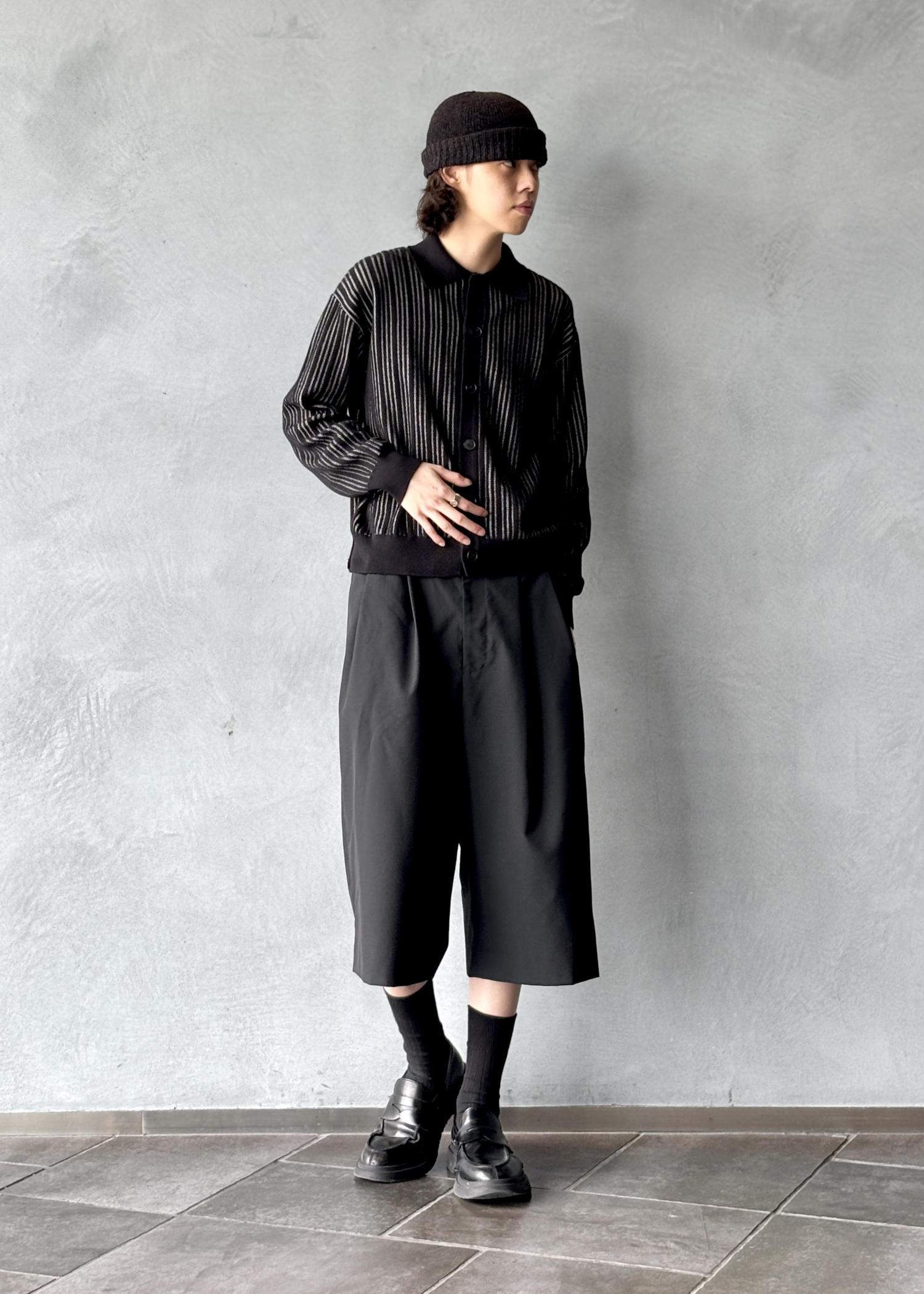 mfpenのニットカーディガンを主役に、ブラックで統一した大人なスタイリング。シックでモードな雰囲気を持ちながらも、素材感やシルエットで軽さを意識し、春らしいバランスに仕上げています。