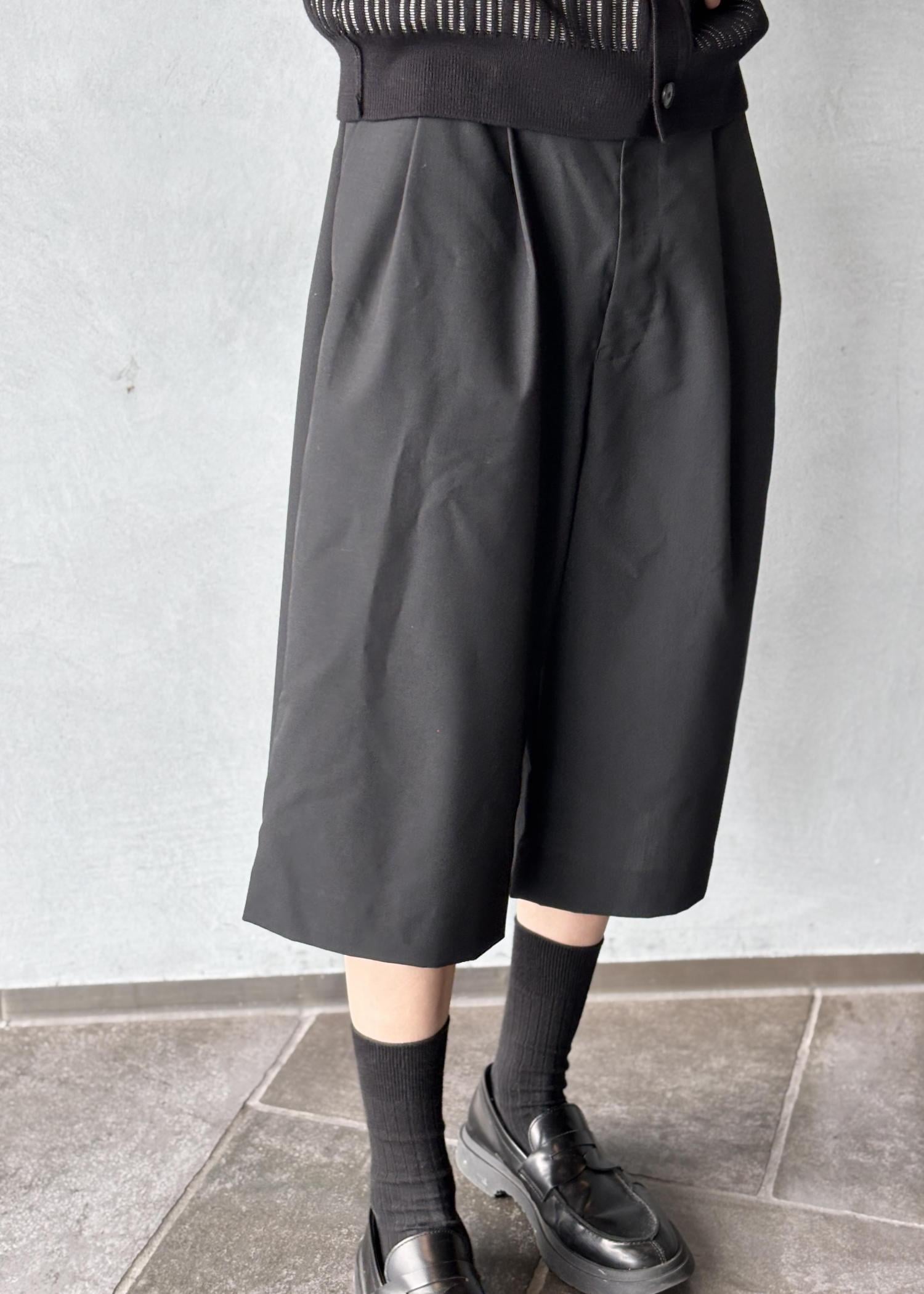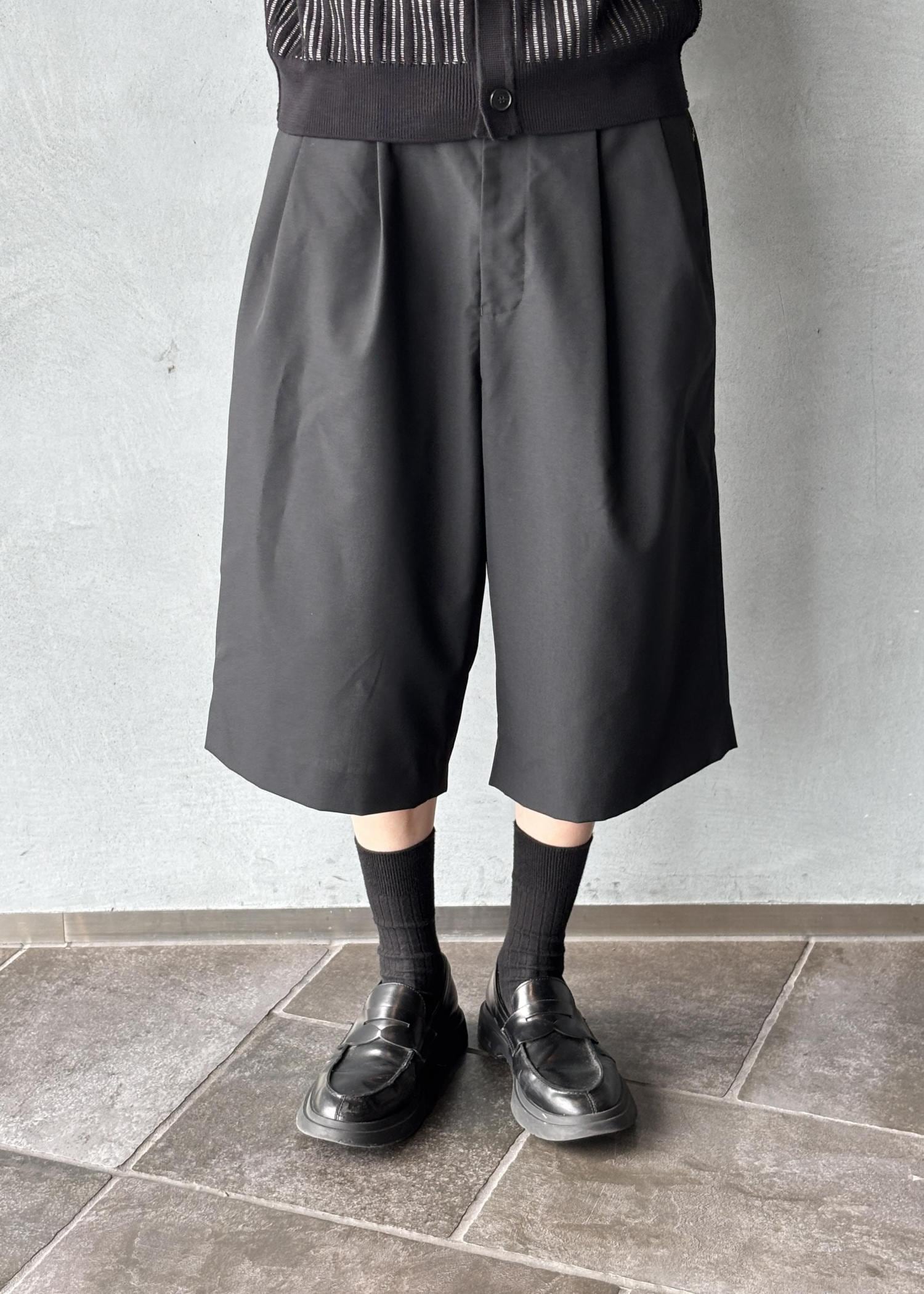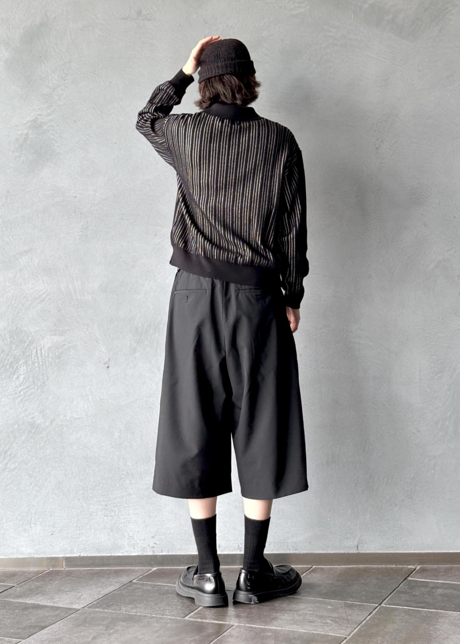 ショーツにはADAM ET ROPÉの膝下丈のモデルを合わせ、落ち着いた印象と抜け感をプラス。程よくゆとりのあるシルエットと涼しげな素材感が、ブラックコーデでも重く見えすぎないポイントです。