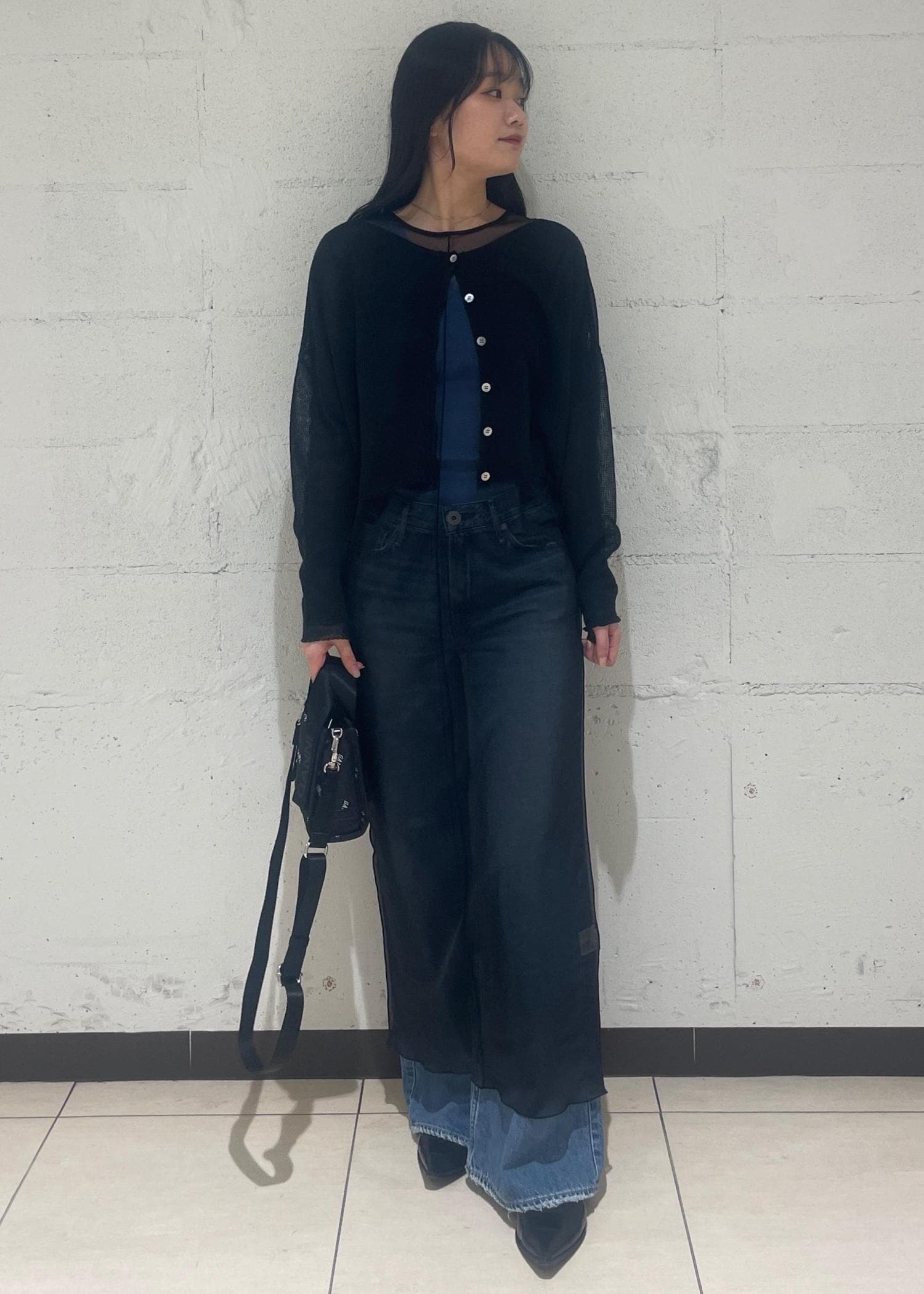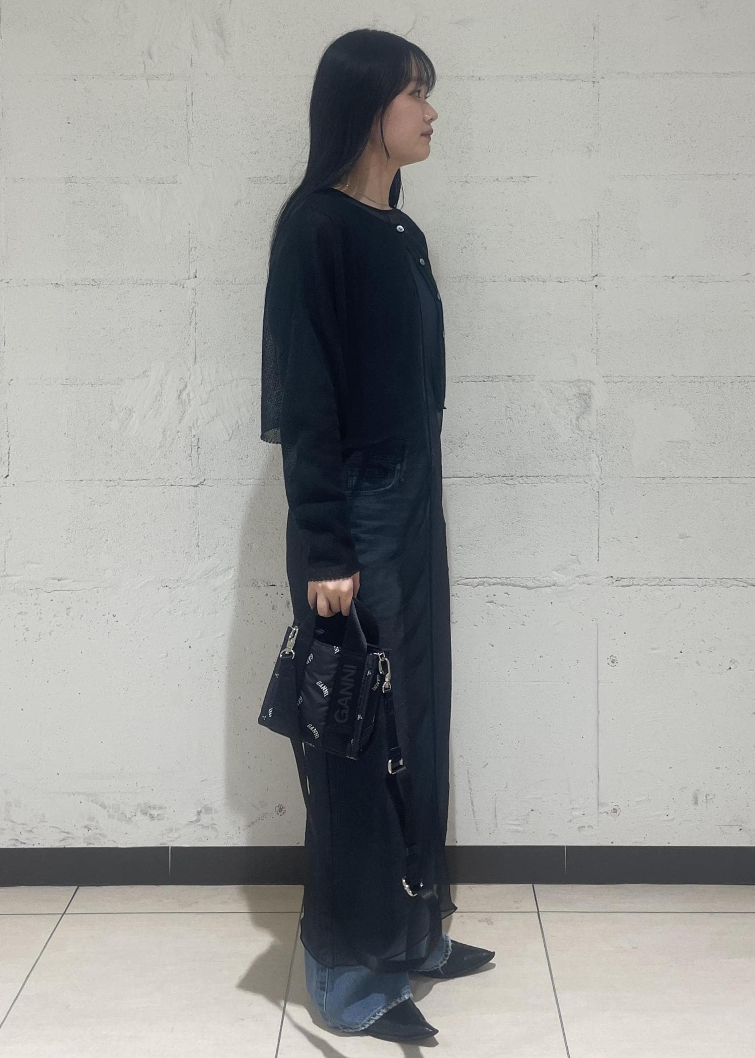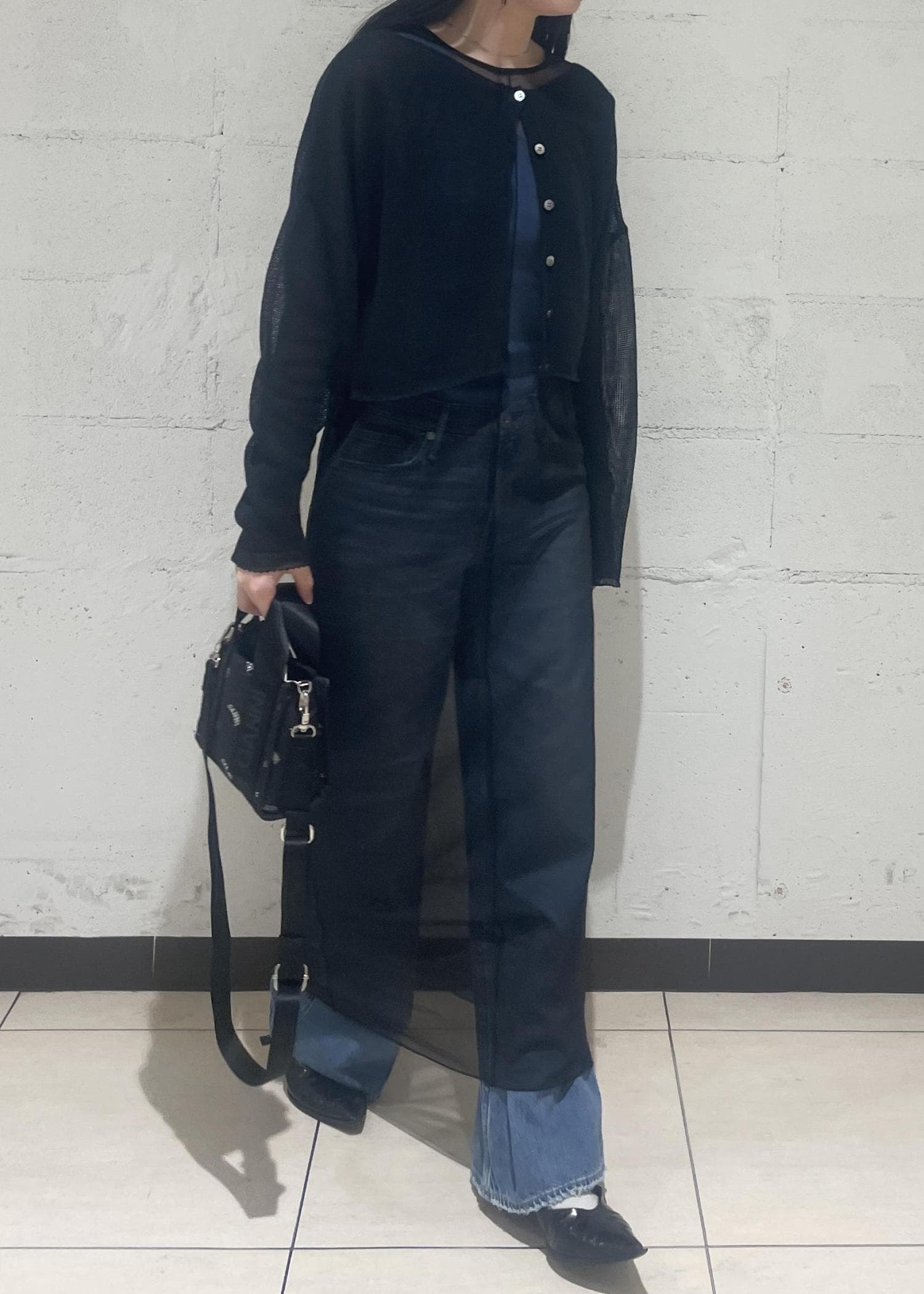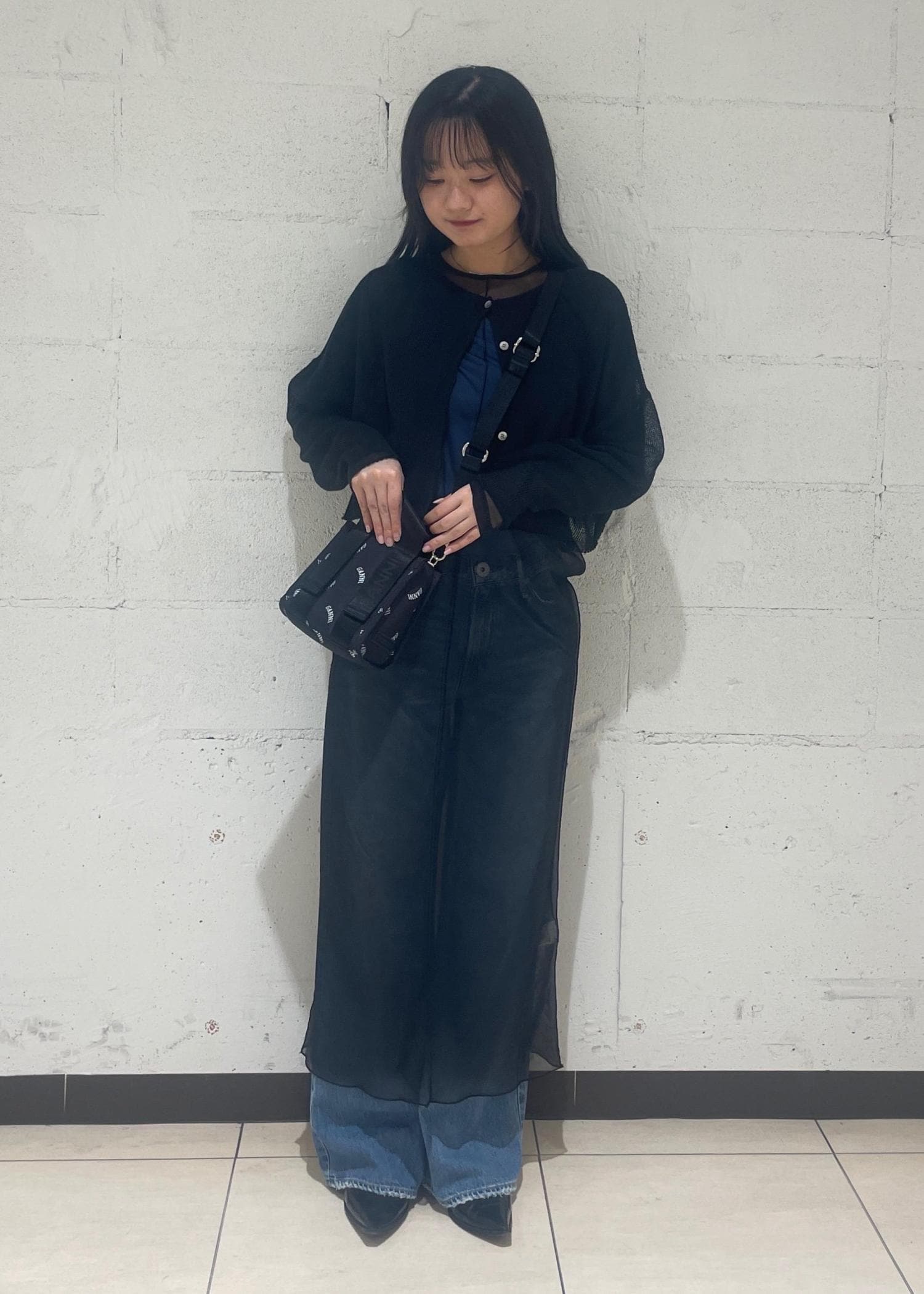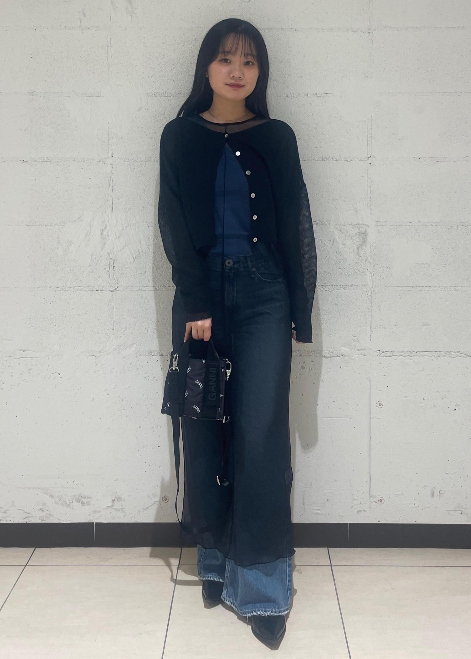 程よい透け感がレイヤードのスタイリングにぴったりだったので、シアーのワンピースと合わせました