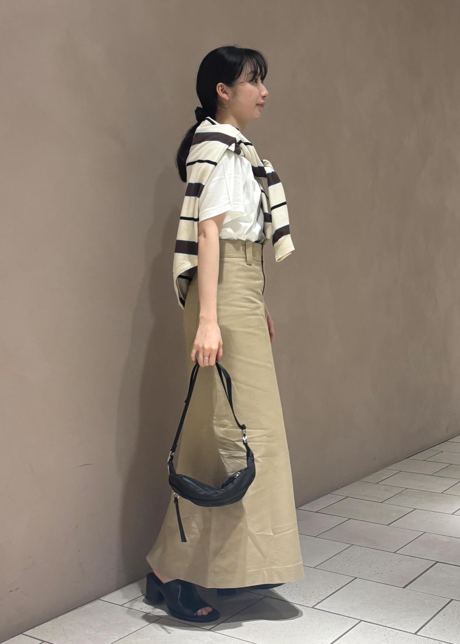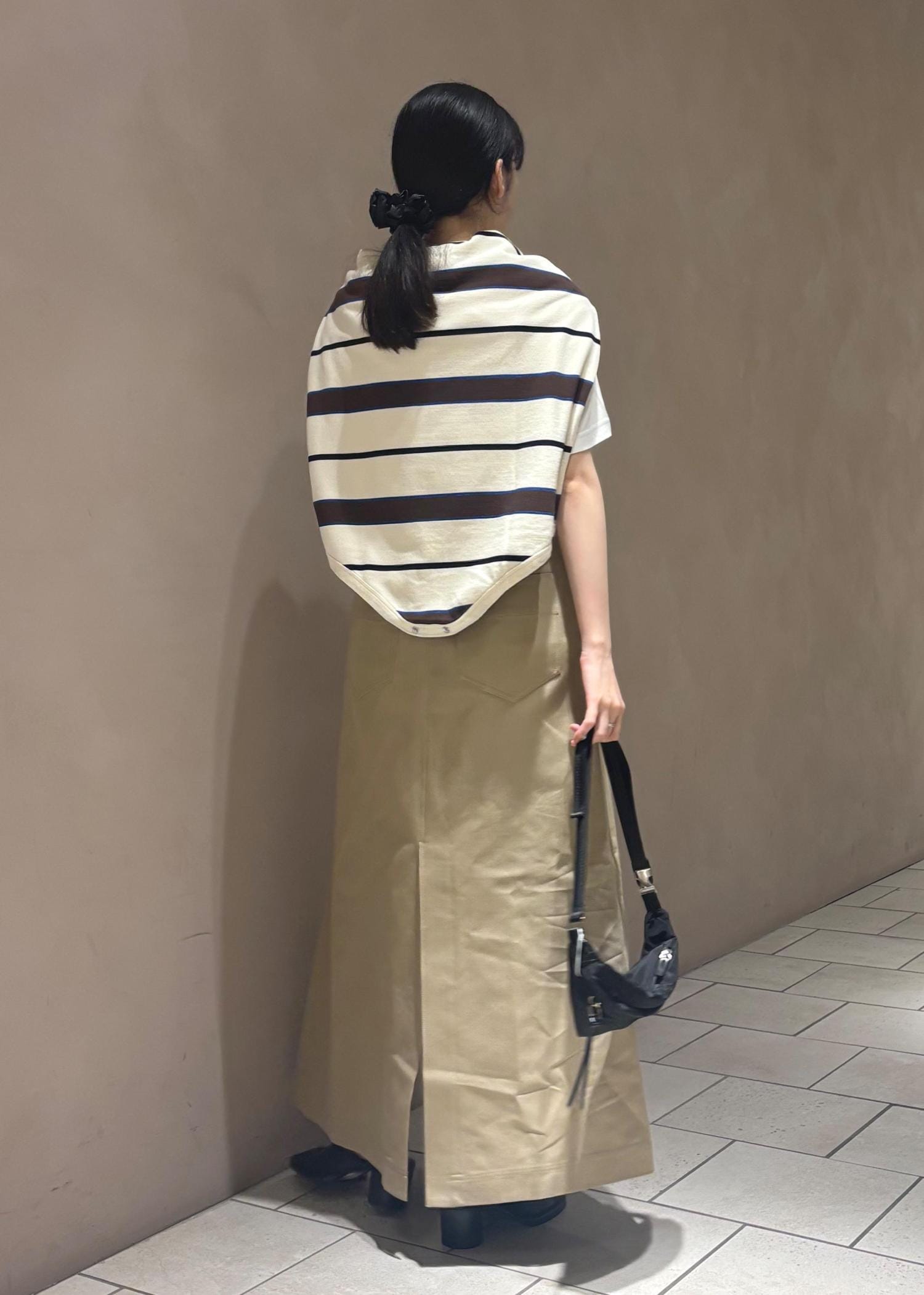 柄のあるトップスを肩がけすることで
