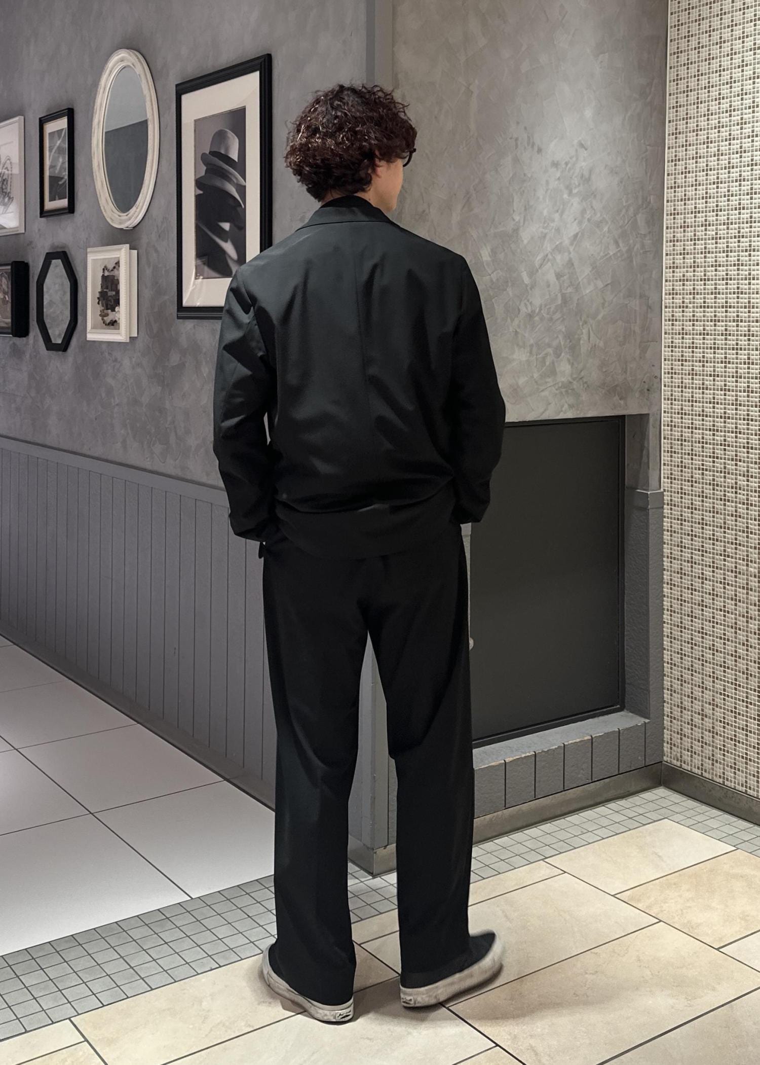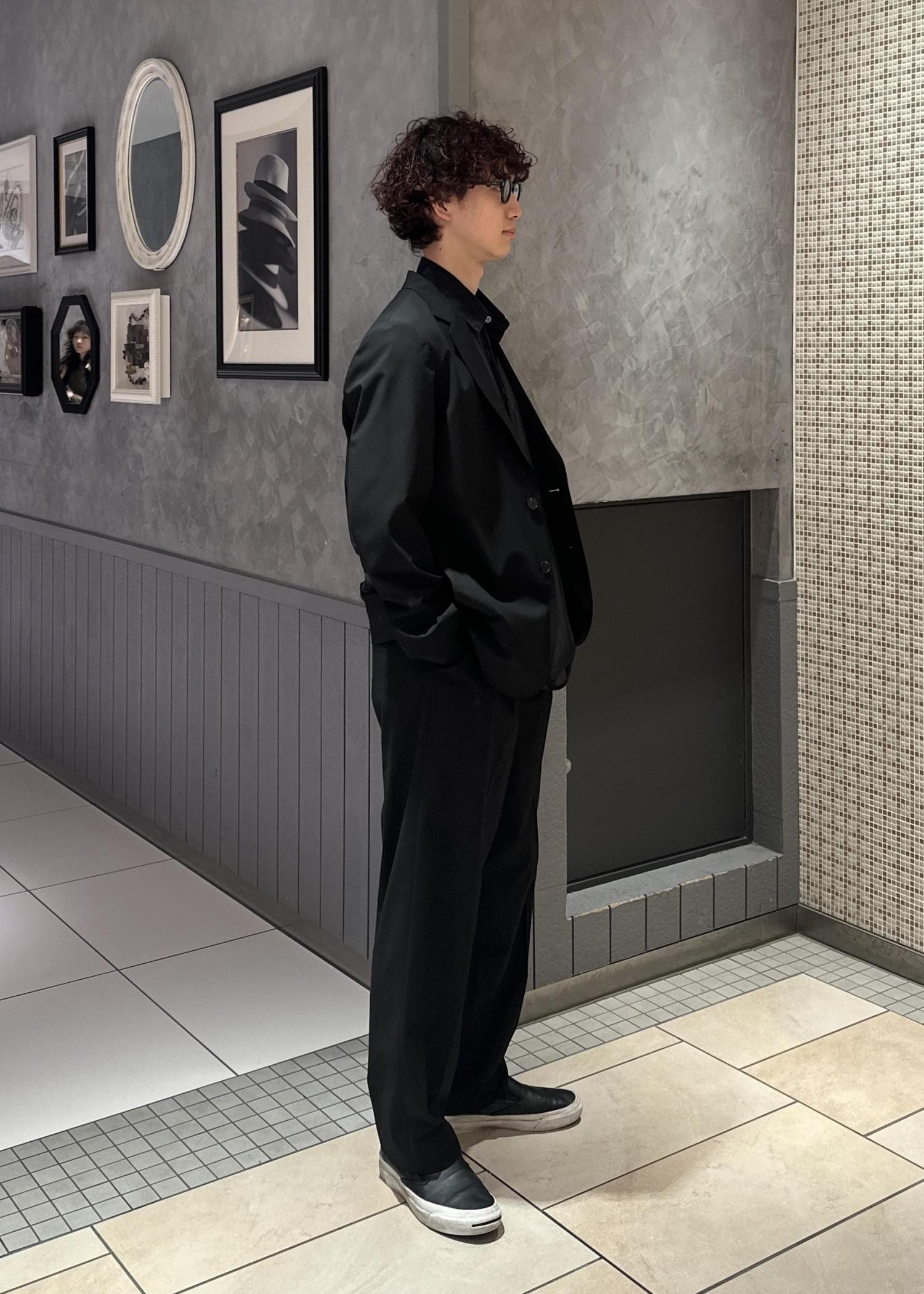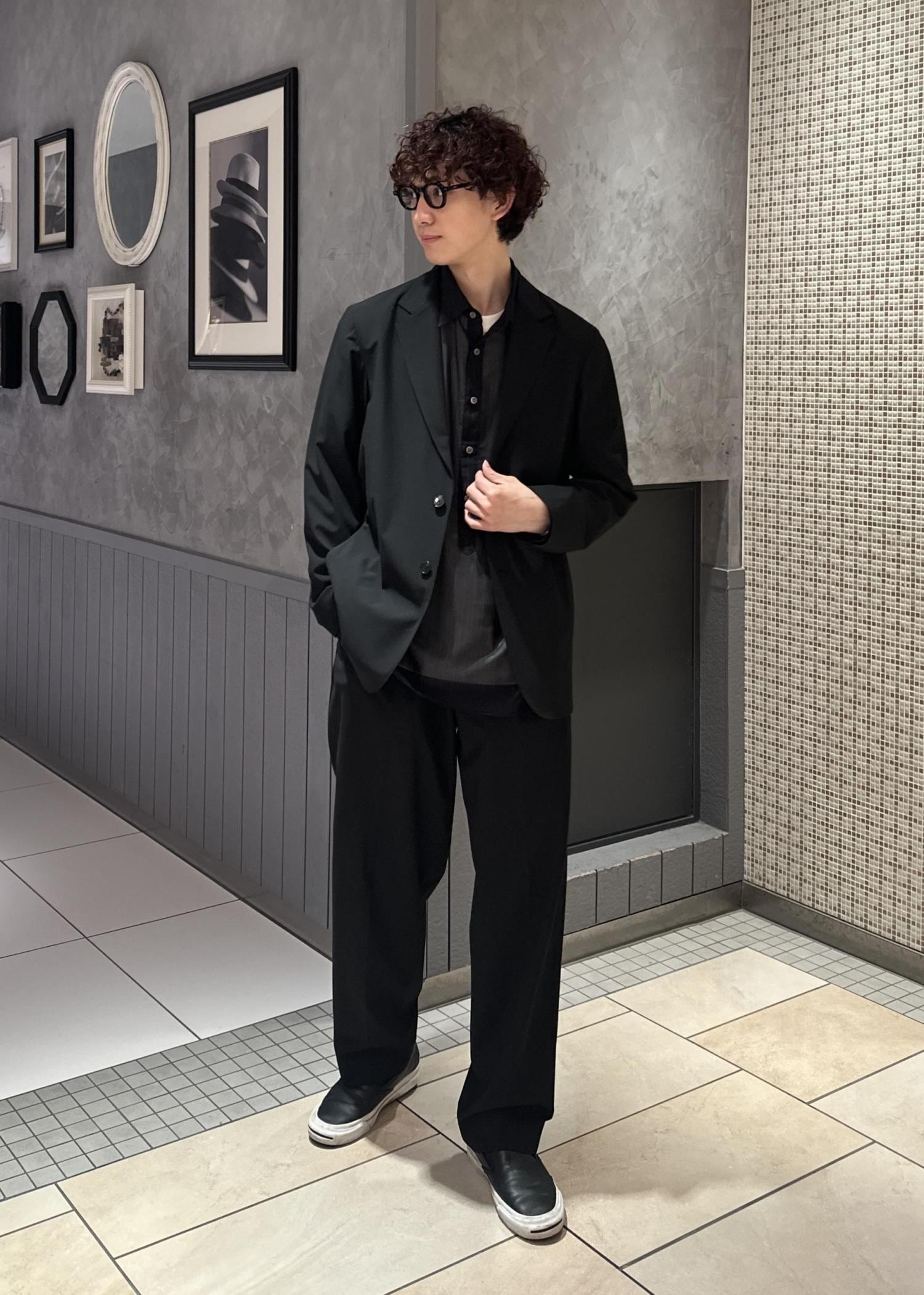 黒のスタイリッシュなセットアップにシアーのストライプシャツを合わせてみました。少し大きめに着て、カッチリした印象を少し崩して普段使いに馴染むように着てみました。オールブラックでも柄を取り入れたり、見た目で素材感が違うようなものを合わせてみると良い感じになります。是非真似してみてください。