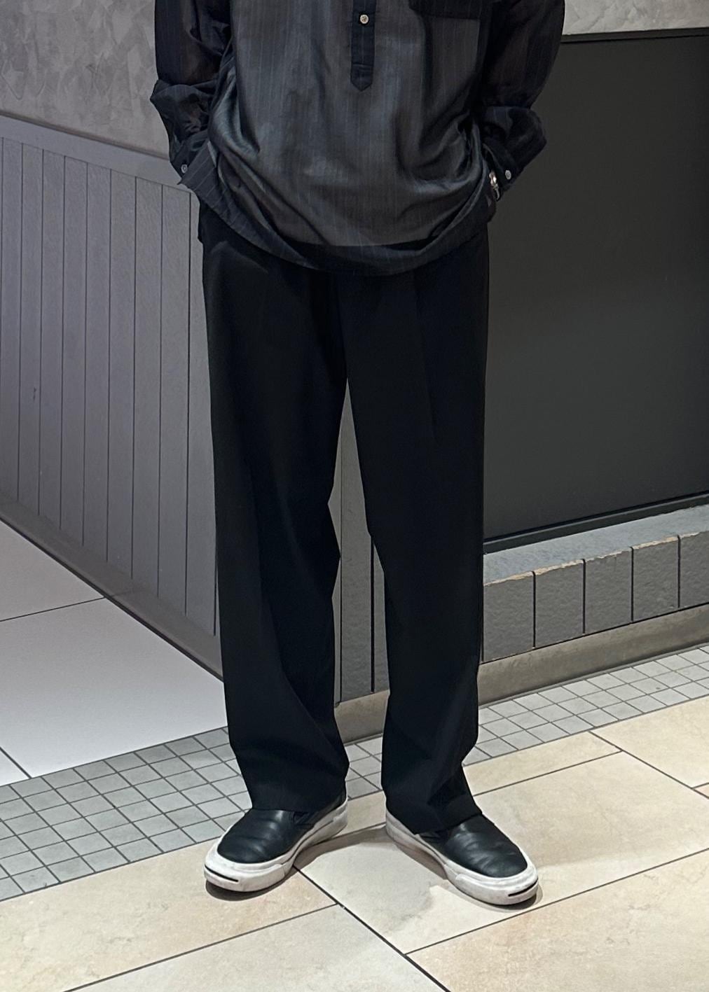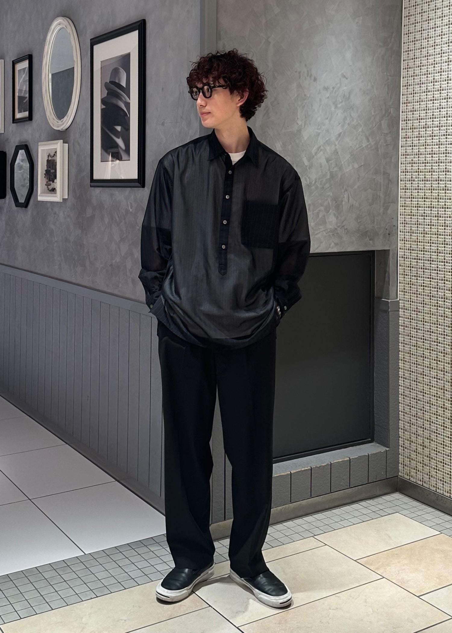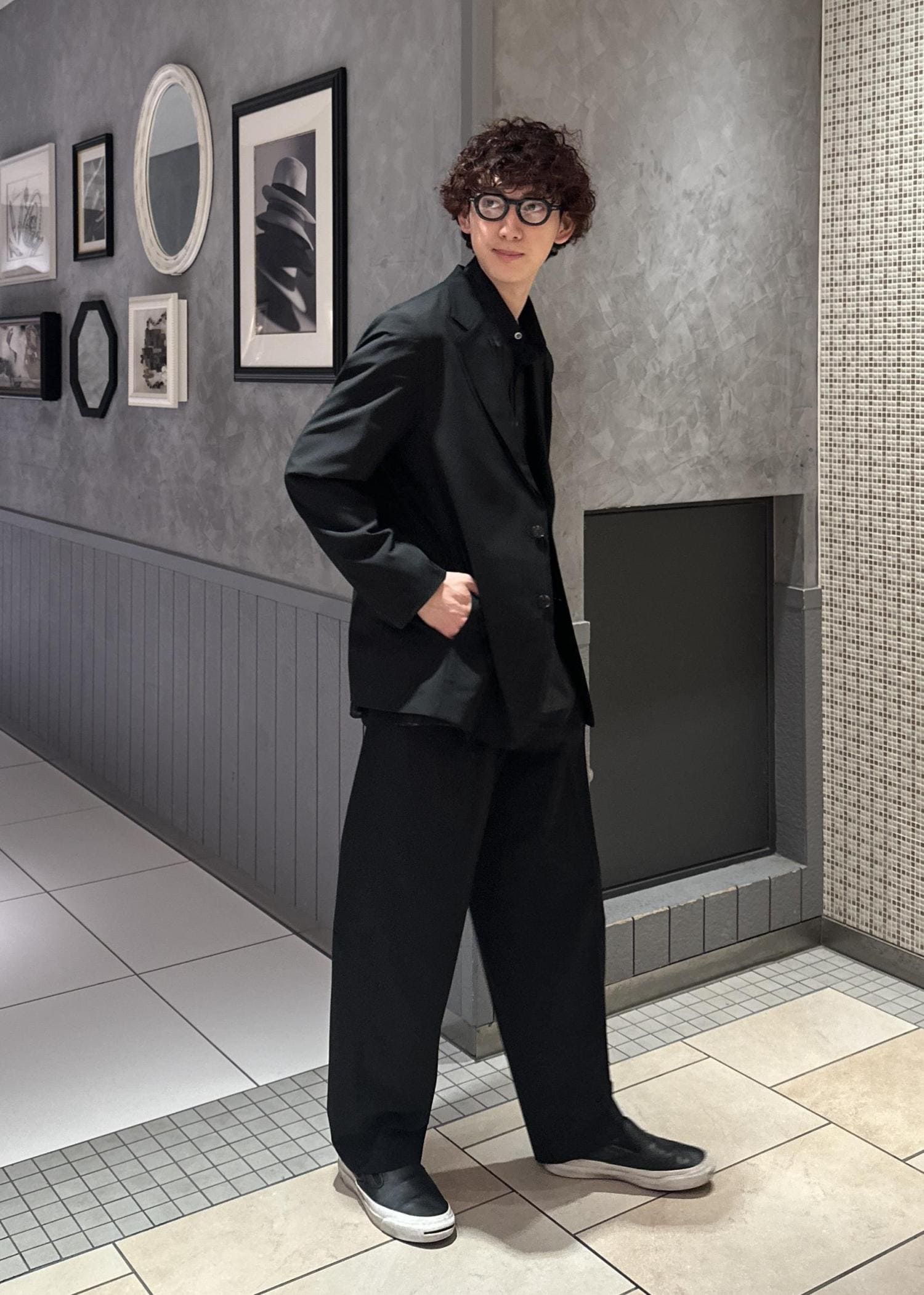 黒のスタイリッシュなセットアップにシアーのストライプシャツを合わせてみました。少し大きめに着て、カッチリした印象を少し崩して普段使いに馴染むように着てみました。オールブラックでも柄を取り入れたり、見た目で素材感が違うようなものを合わせてみると良い感じになります。是非真似してみてください。