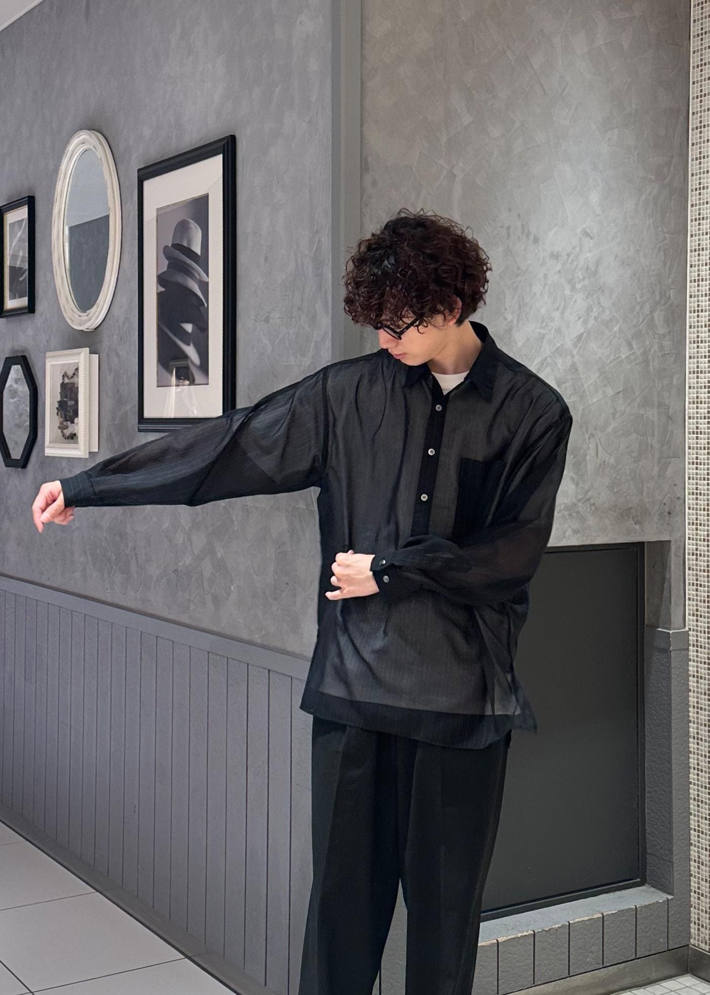 シアー素材の長袖シャツ。ルーズなシルエットでリラックス感があります。程よい透け感とうるさくない柄なので大人っぽい。夏でも着れる長袖で一枚でも、重ね着でもおすすめです。