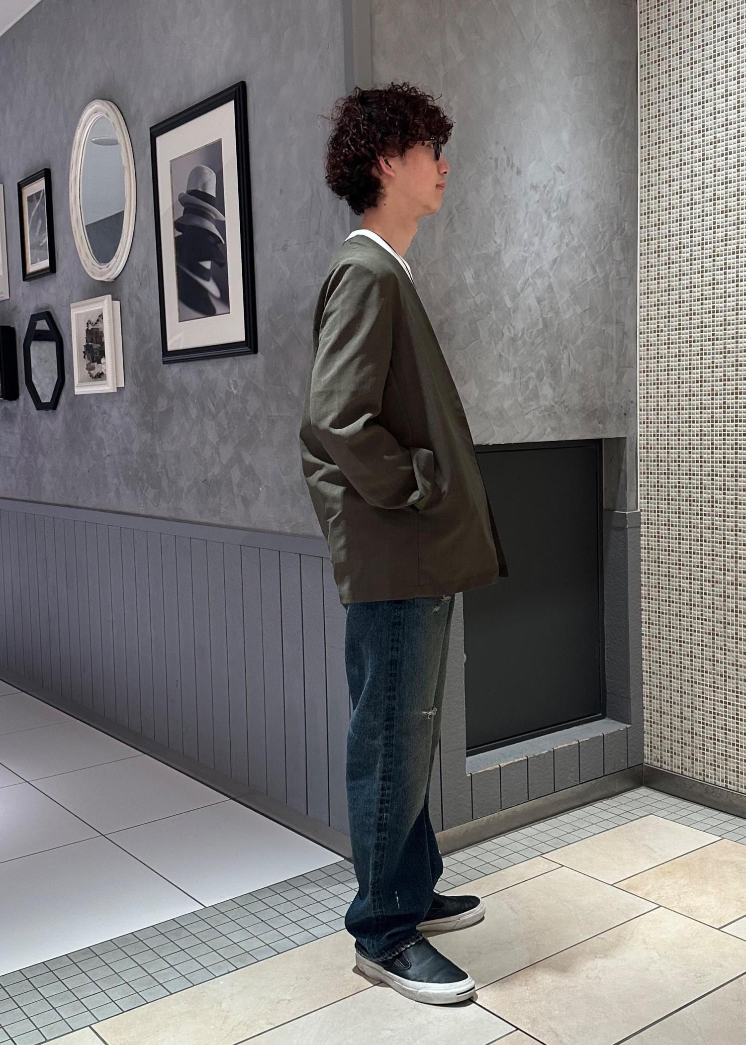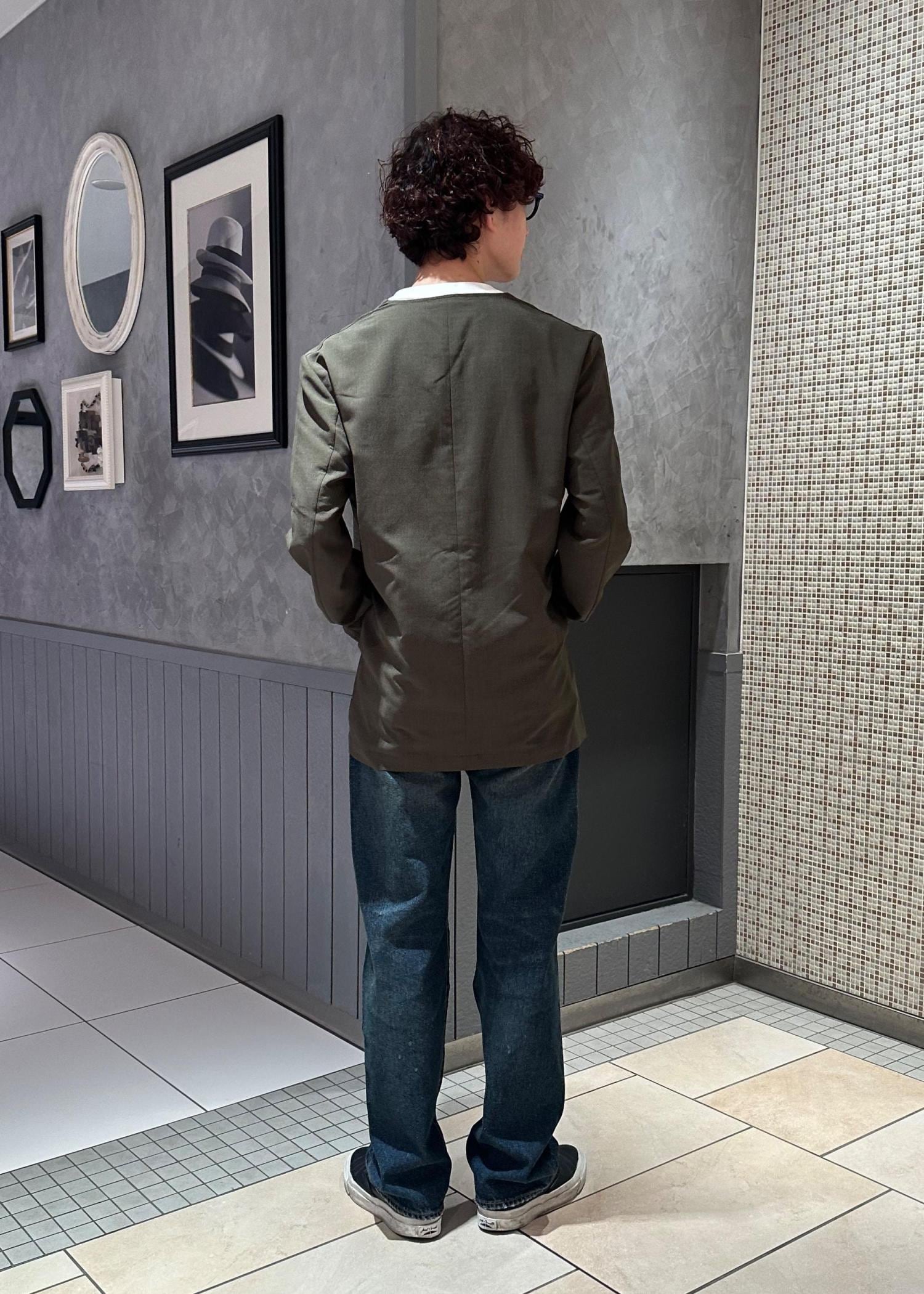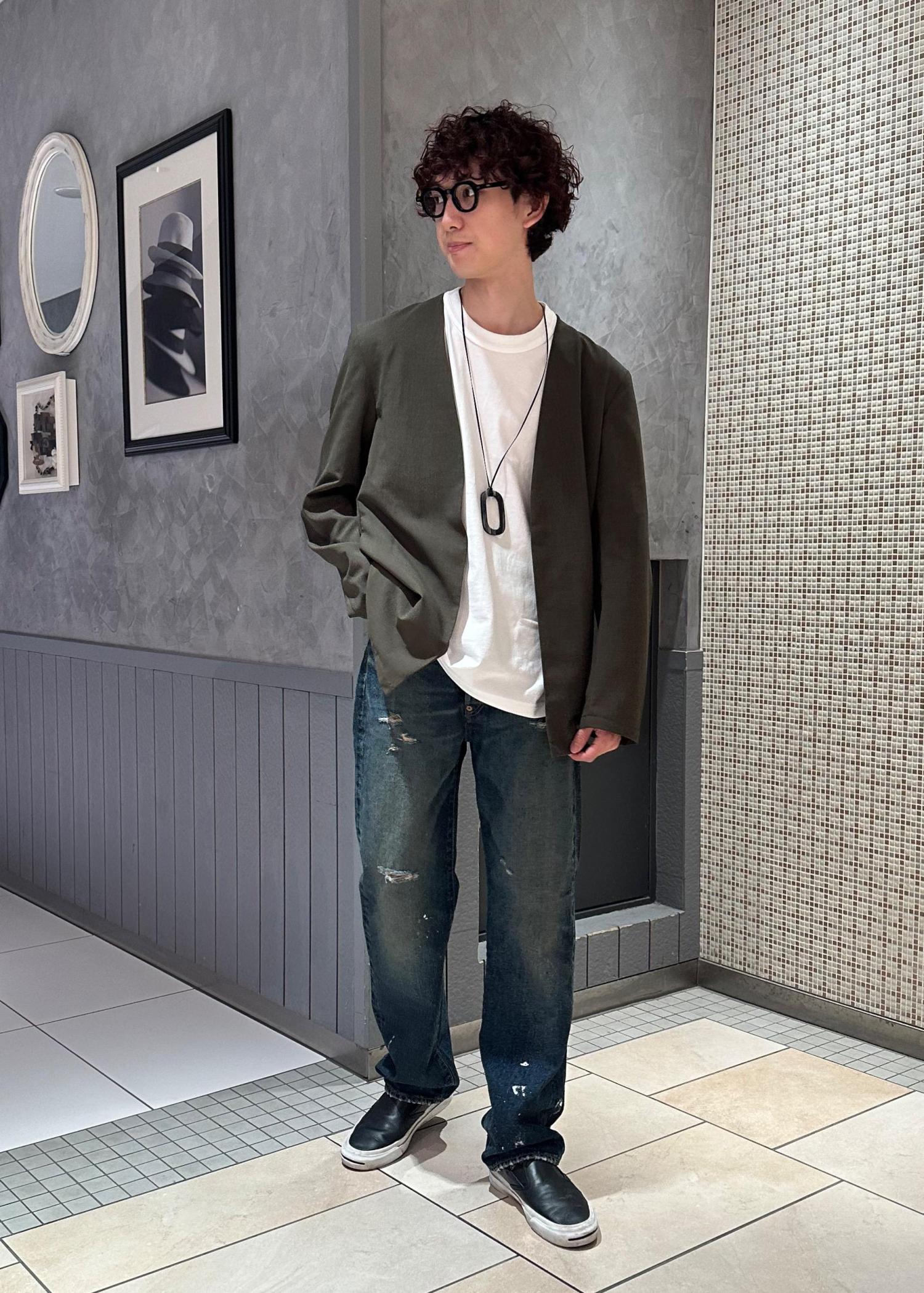 ニューマニュアルのデニムパンツを主役にしたコーデです。シンプルに白Tとノーカラージャケットで合わせました。ジャケットはカーキにすることで、デニムのヴィンテージライクな渋い雰囲気に合わせました。
