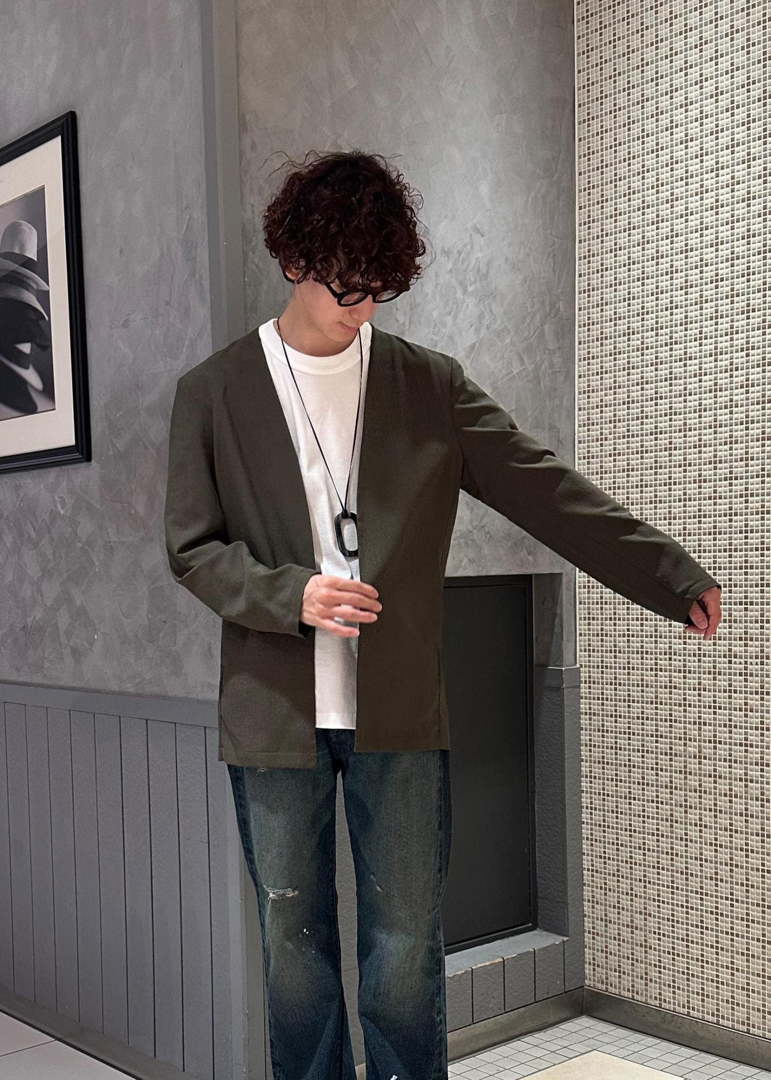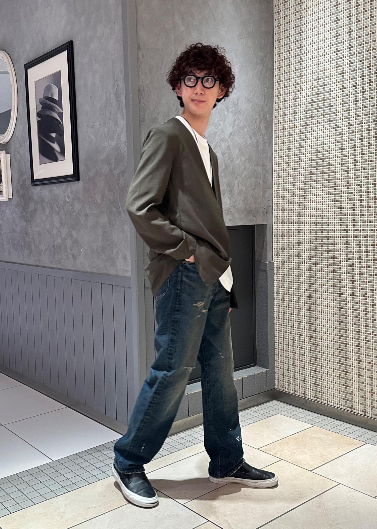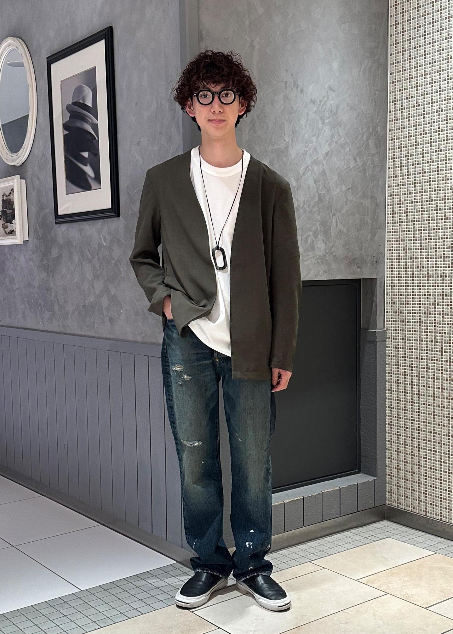 ニューマニュアルのデニムパンツを主役にしたコーデです。シンプルに白Tとノーカラージャケットで合わせました。ジャケットはカーキにすることで、デニムのヴィンテージライクな渋い雰囲気に合わせました。