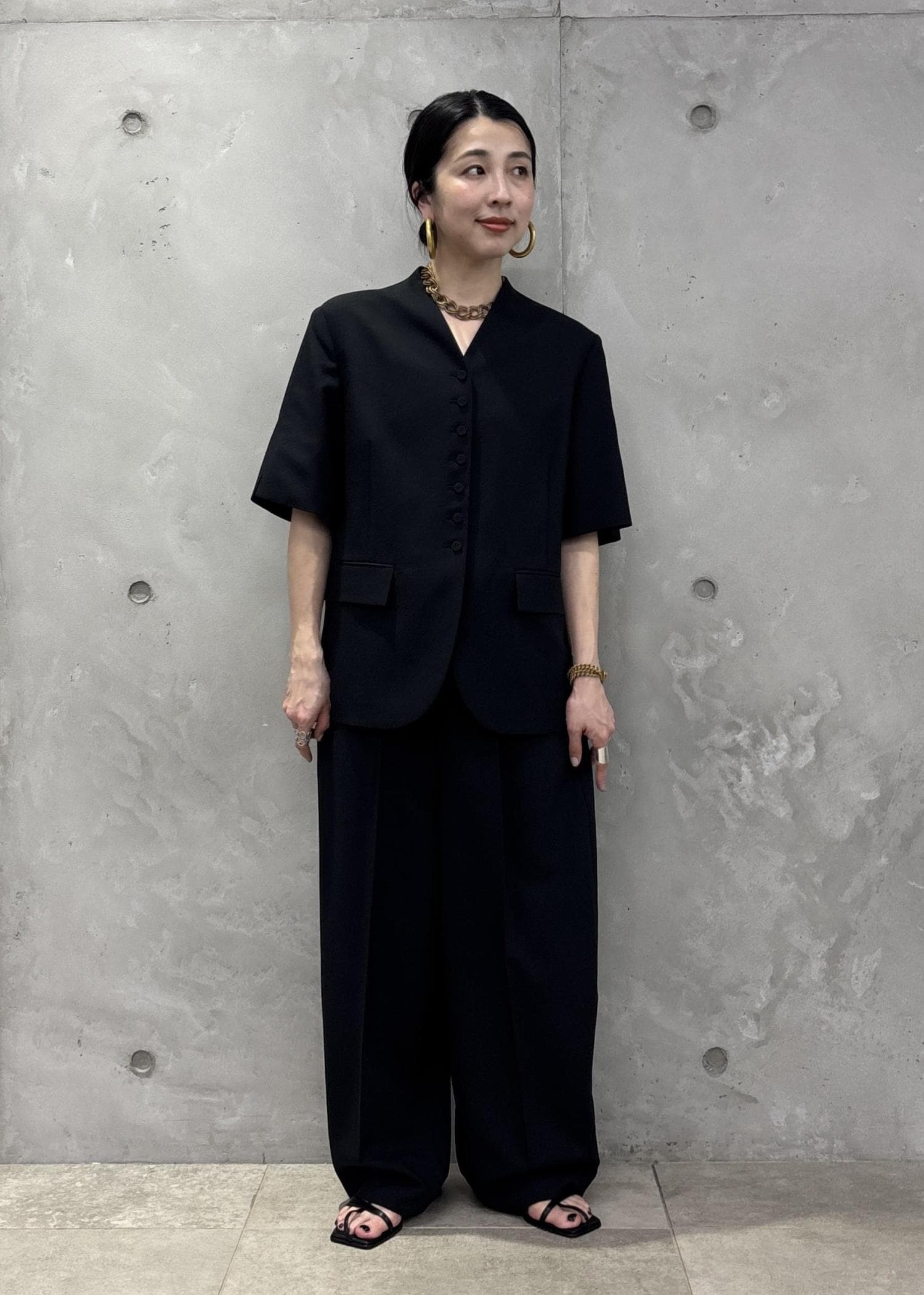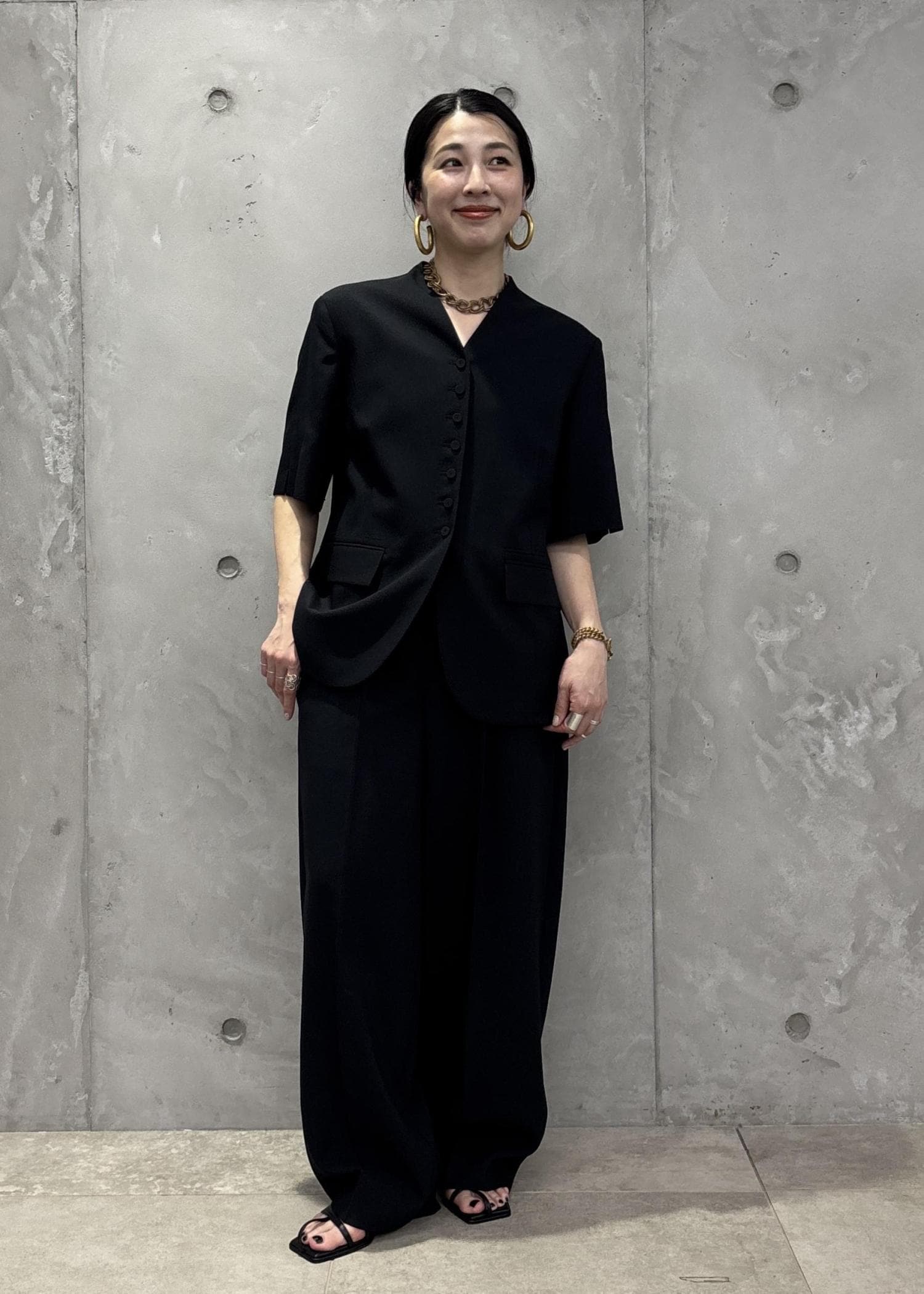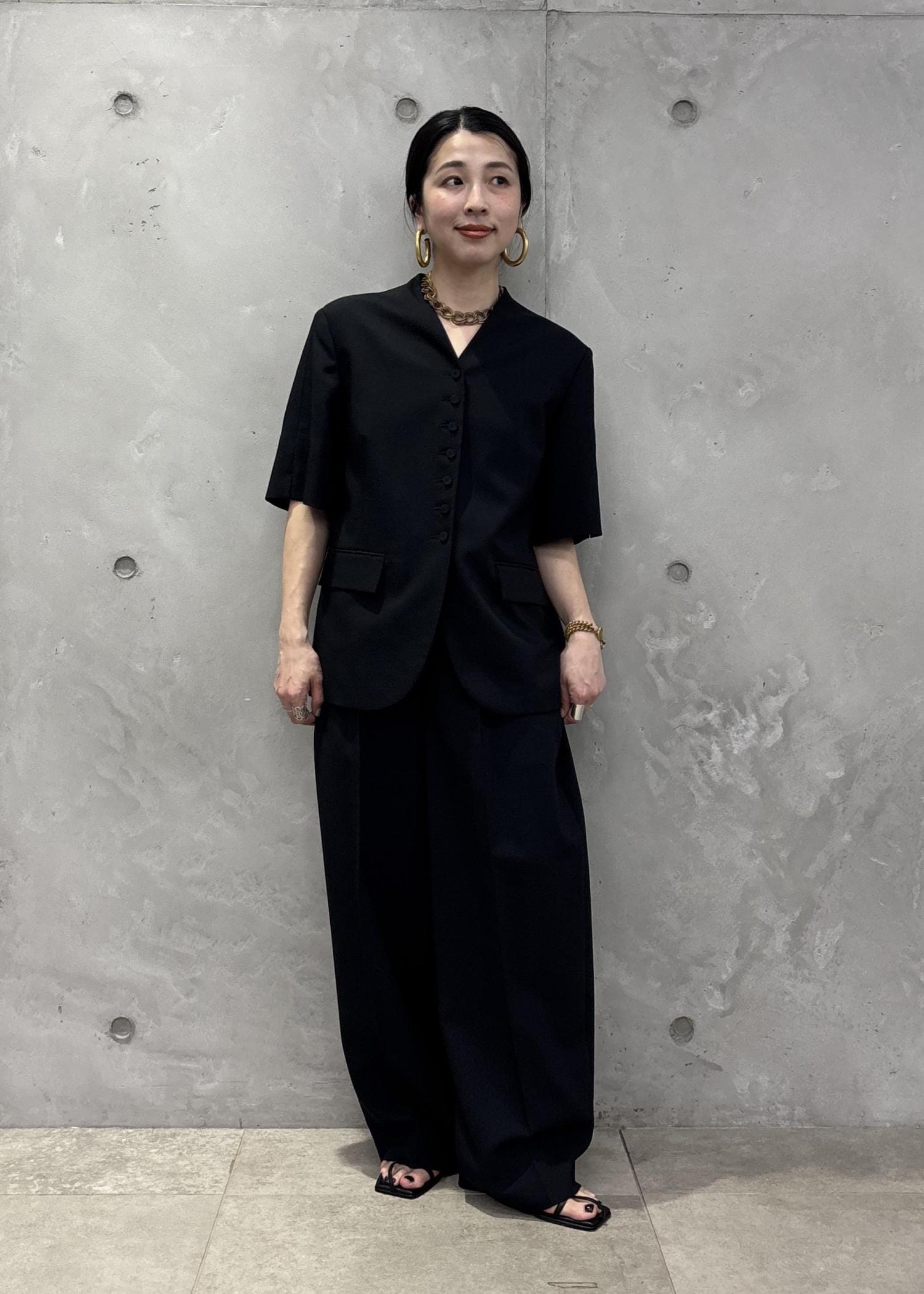 今回は仕事に使えるセットアップスタイリングのご紹介です。ブラウス見えするジャケットを同素材のパンツとセットアップでかっちりと合わせてみました。
