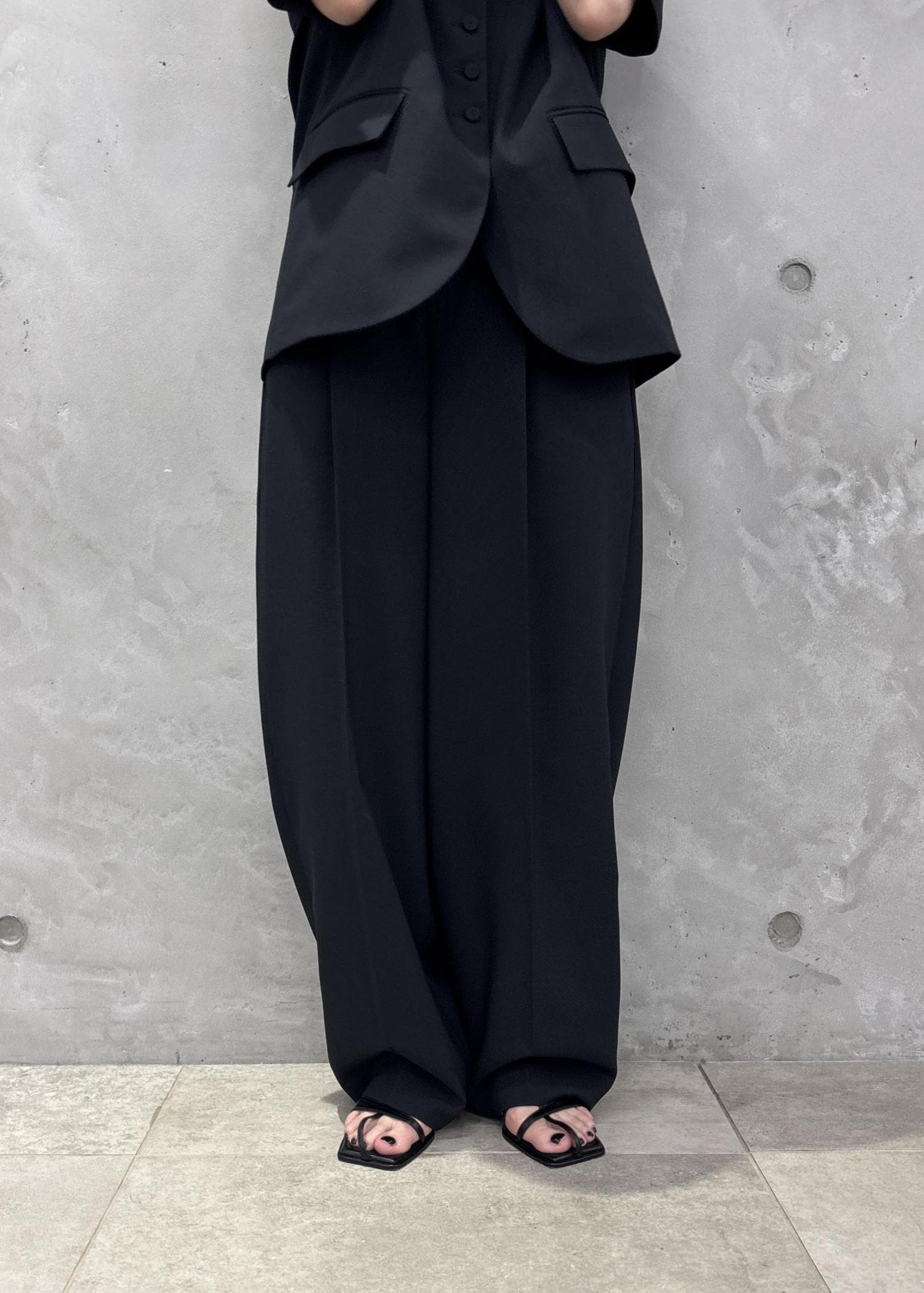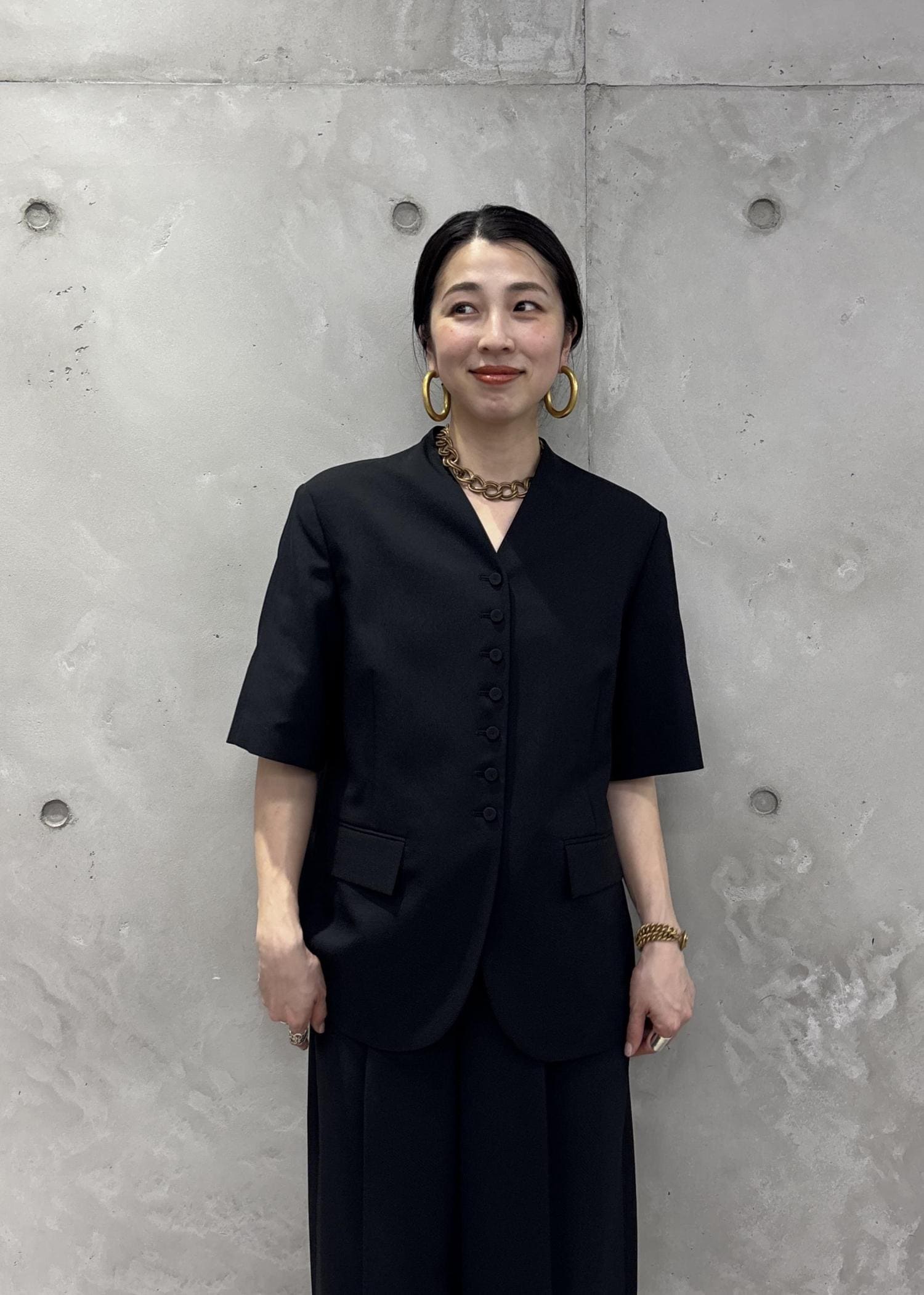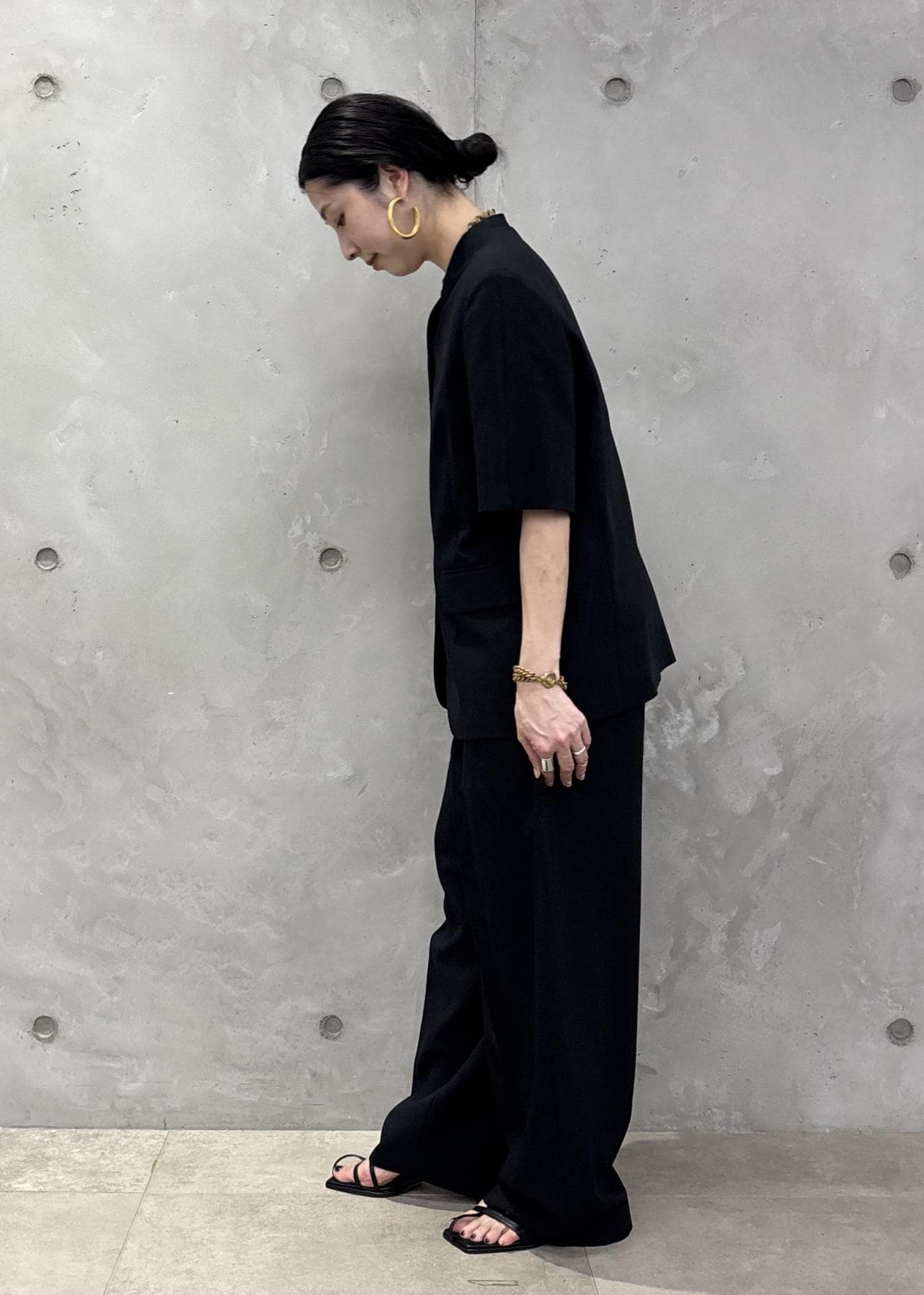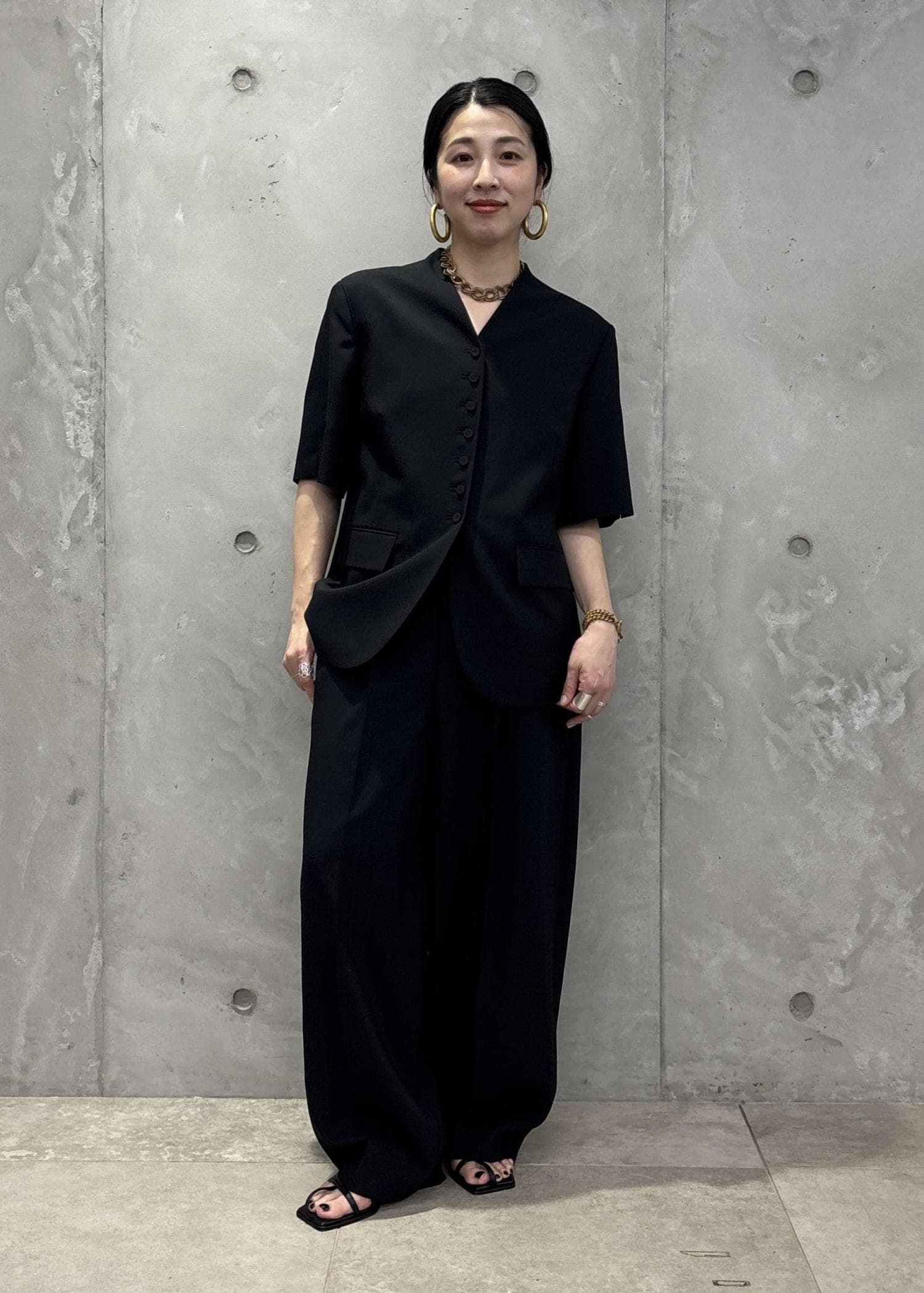 今回は仕事に使えるセットアップスタイリングのご紹介です。ブラウス見えするジャケットを同素材のパンツとセットアップでかっちりと合わせてみました。