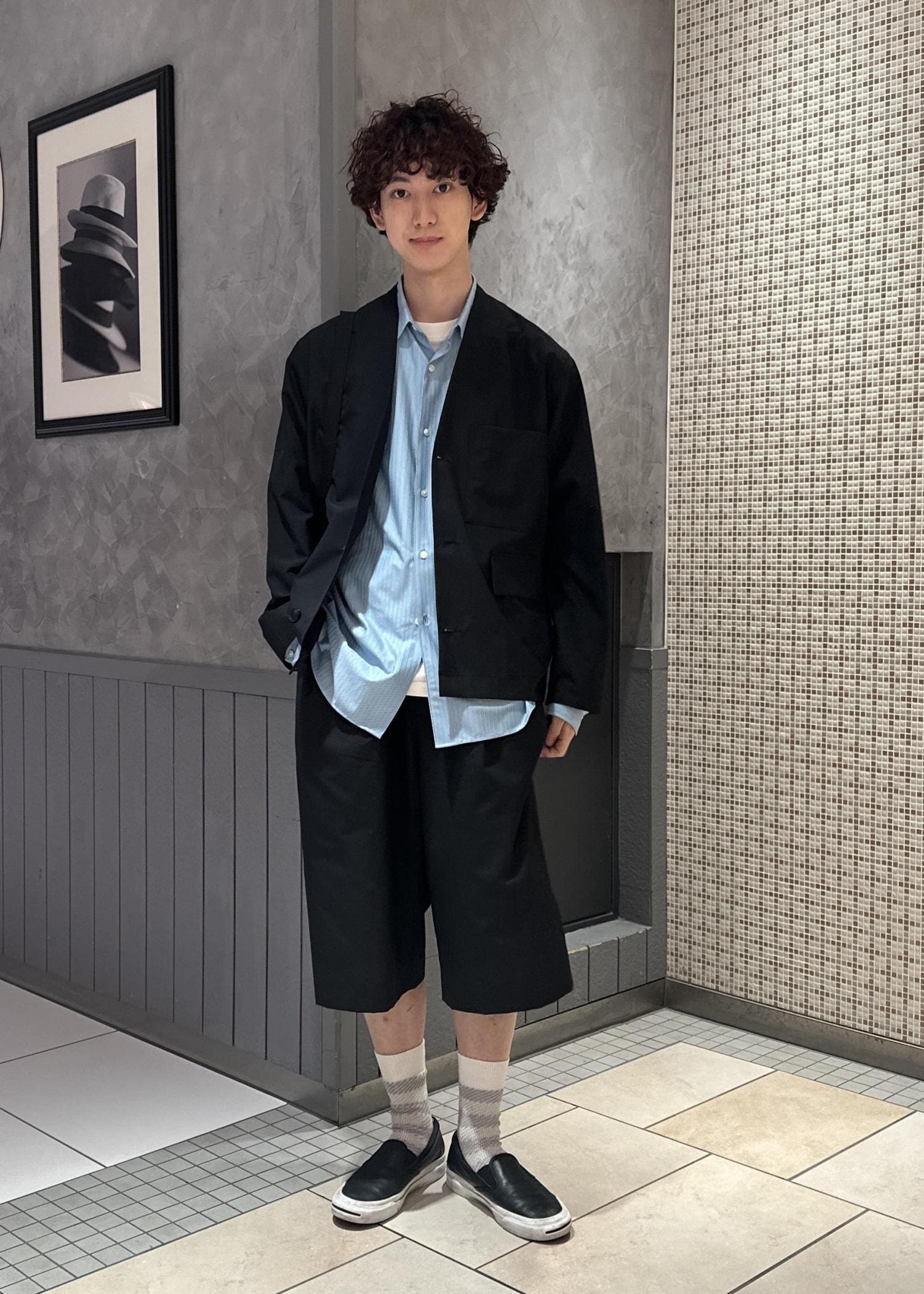 ブルーのストライプシャツを差し色にしたセットアップコーデです。丈長めのショーツで、ジャケットライクなカーディガンとのセットアップなので、少年感が出ず、大人っぽいコーデに。