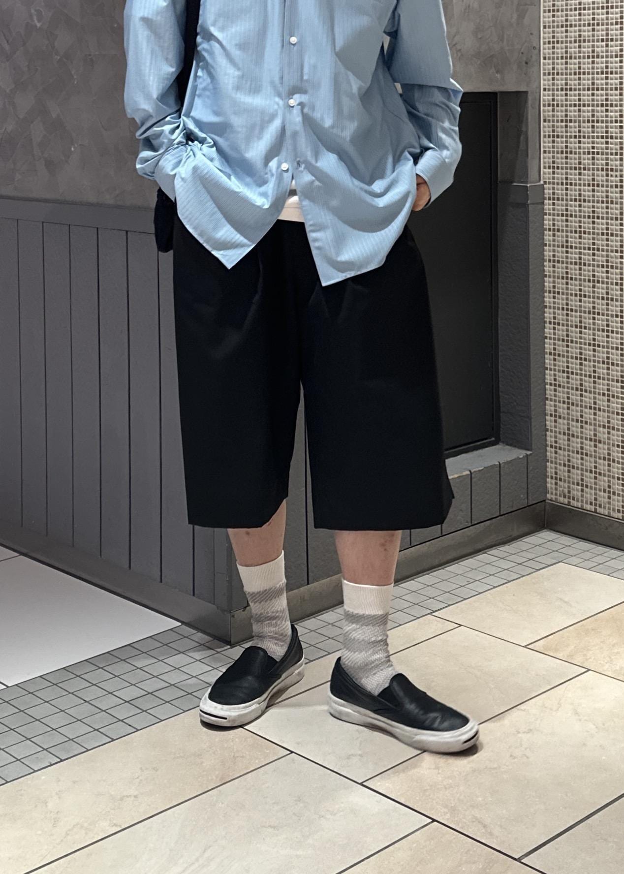 丈長めのショーツ。少年感が出ず大人っぽい雰囲気。薄い生地で涼しいです。薄いけど、トロトロとはしていなく、立体感のあるシルエットです。夏はもちろん、春と秋にも長袖やスウェット、ジャケットなどと合わせてお召しいただけます。 -