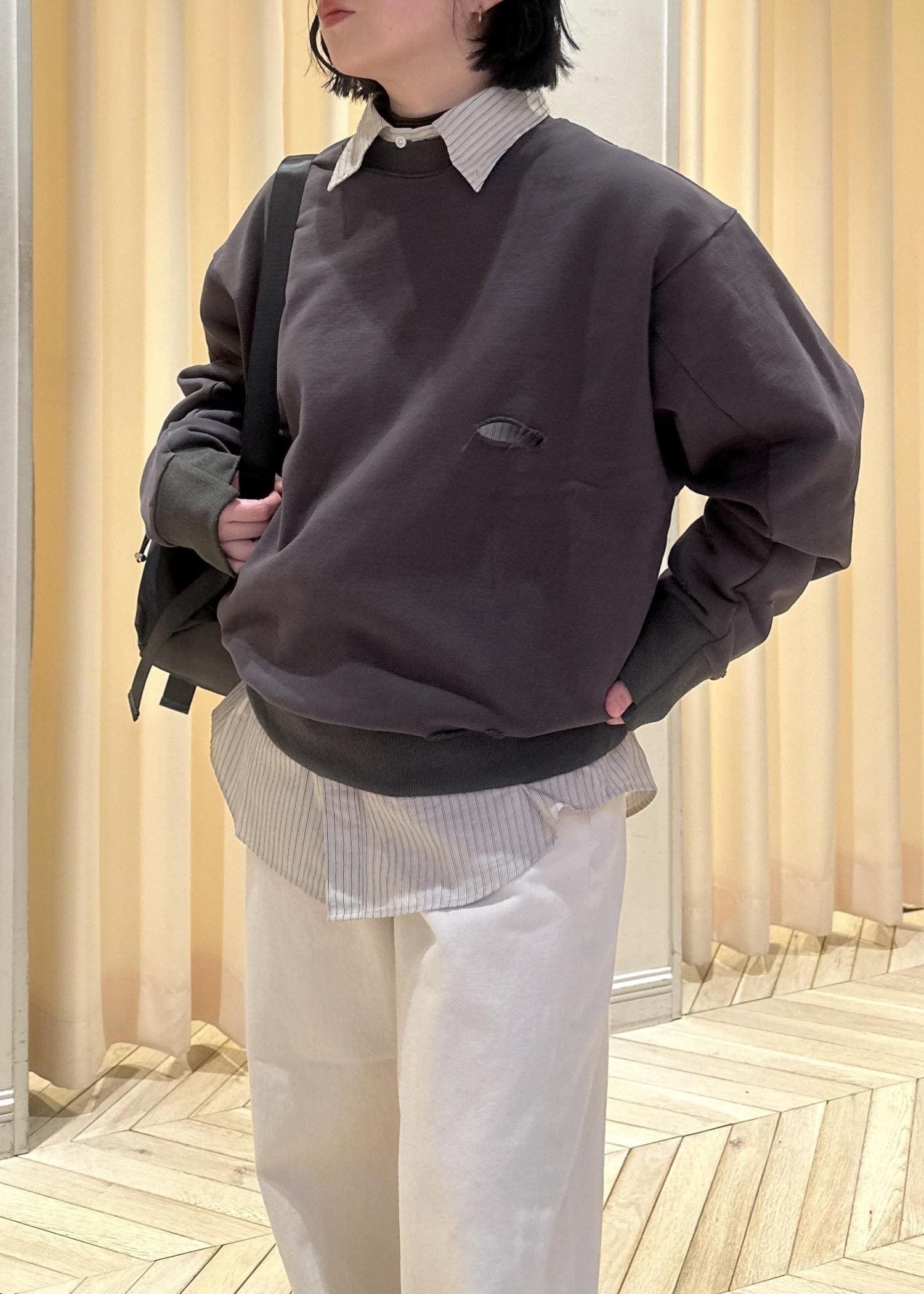 程良く肉厚なスウェットですが、ダメージ加工によりシアー感がプラスされていて長い季節で活躍します。 -