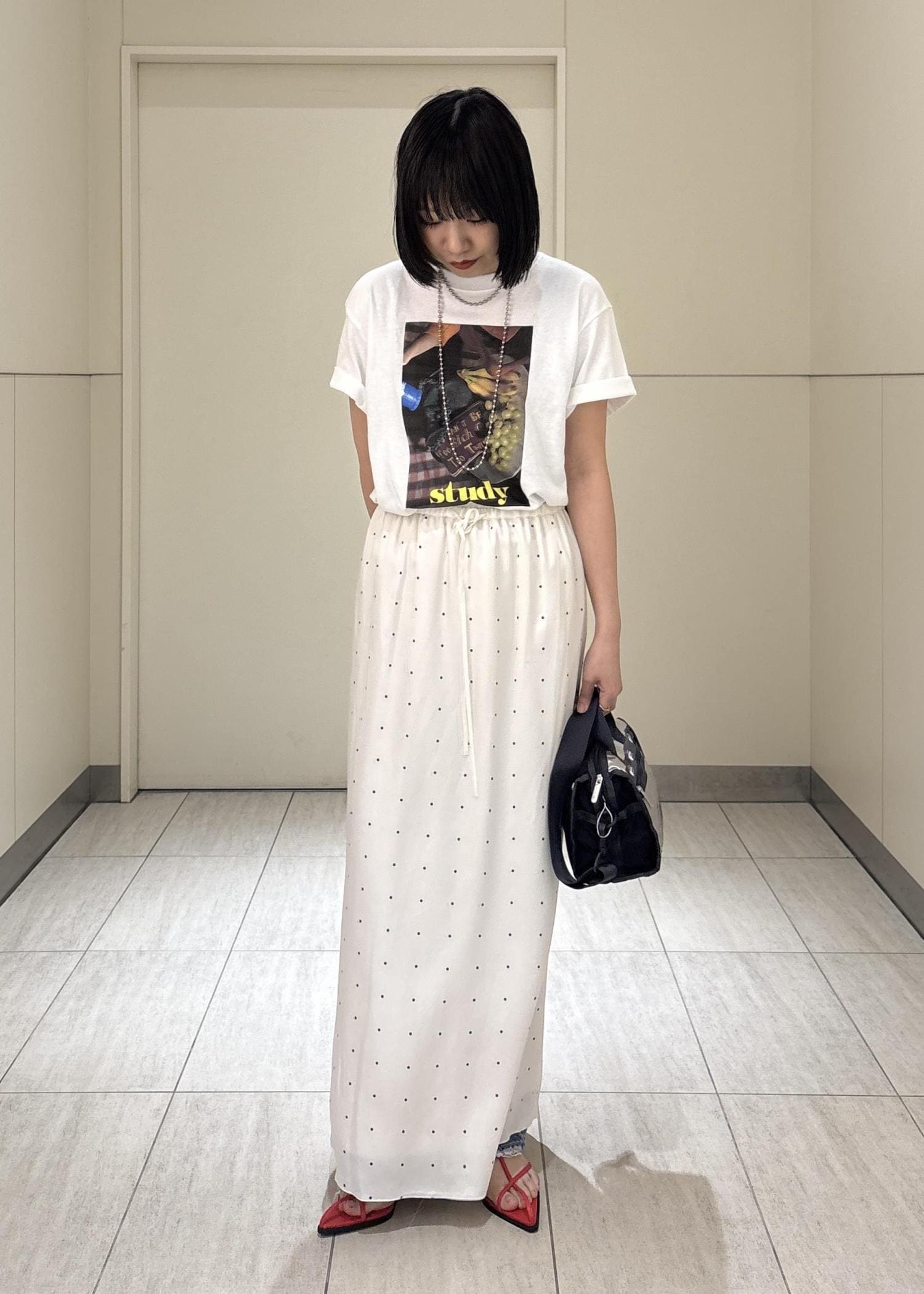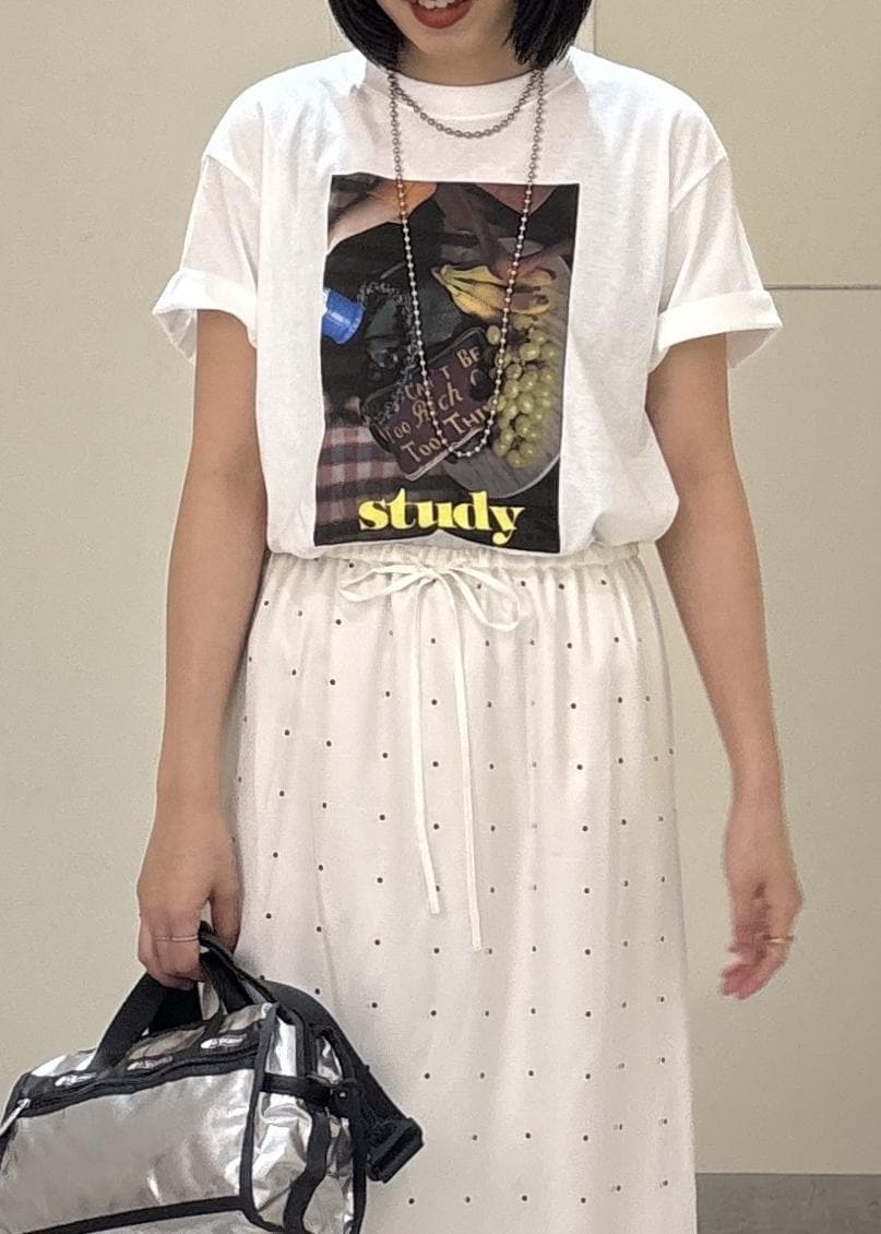 studyのTシャツに、ドットスカートとデニムパンツをレイヤードしてこなれ感をプラス。