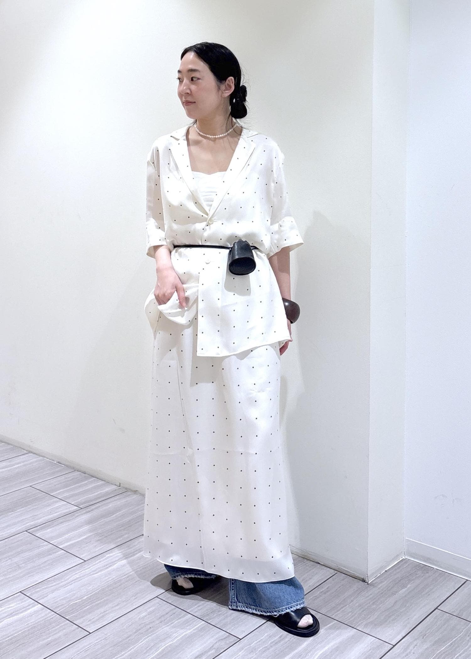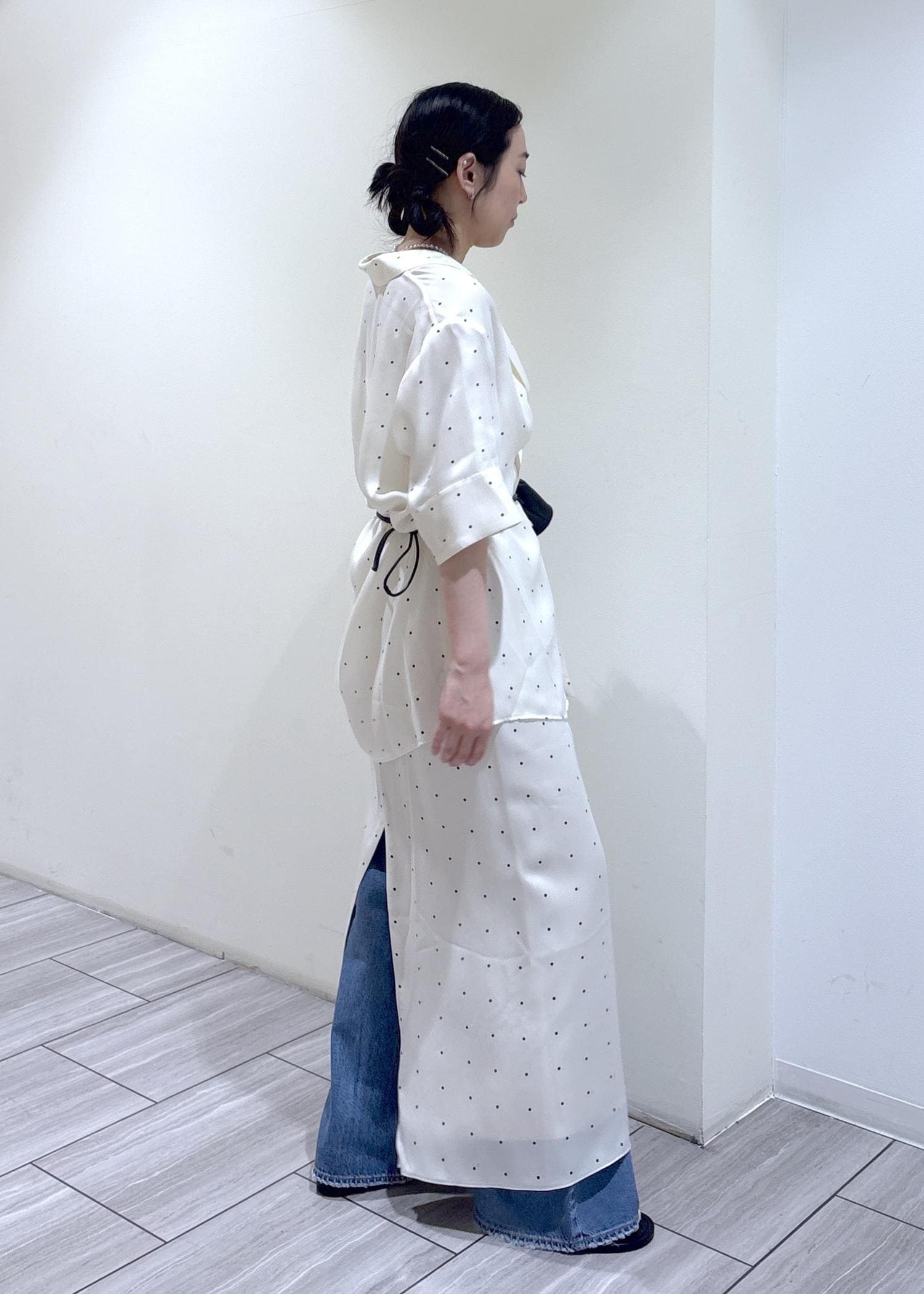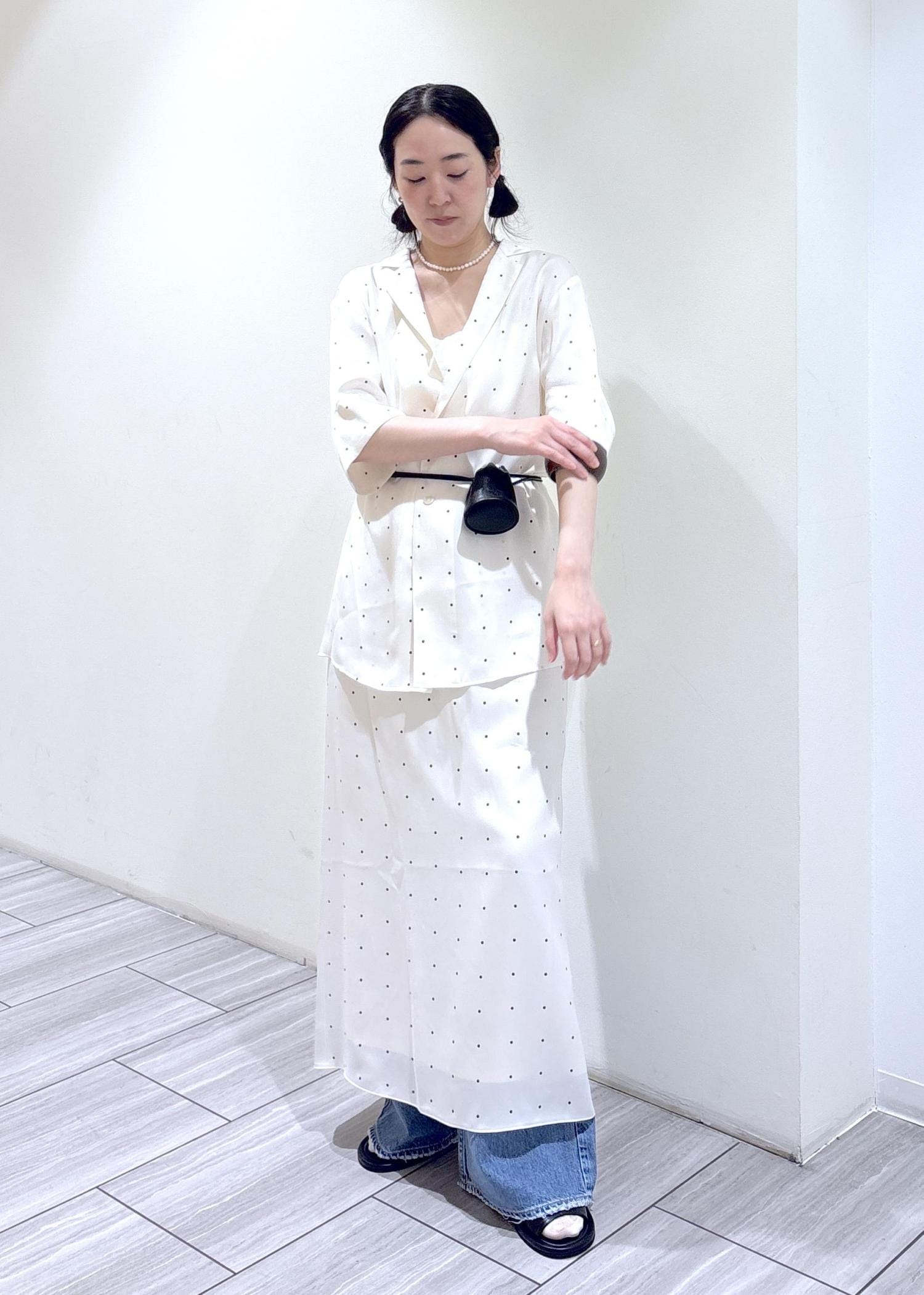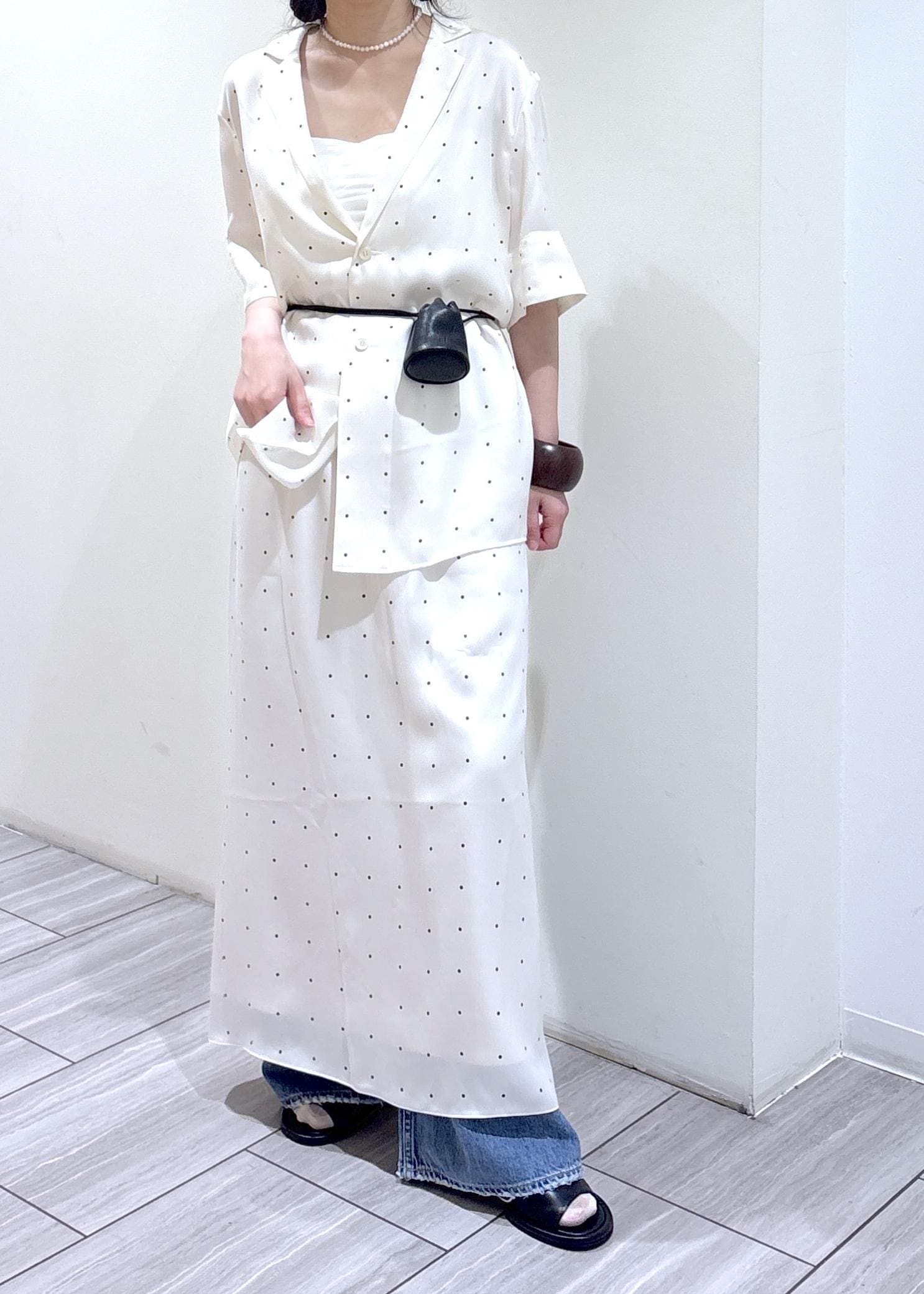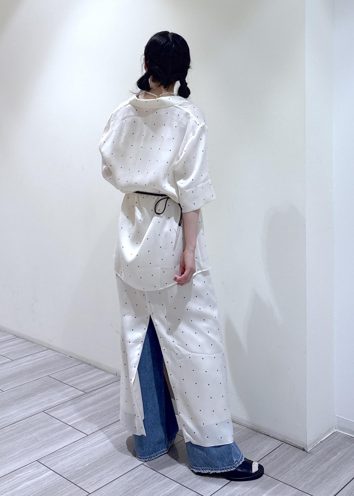 キュプラ100%のサテン素材のドットシャツとスカート。