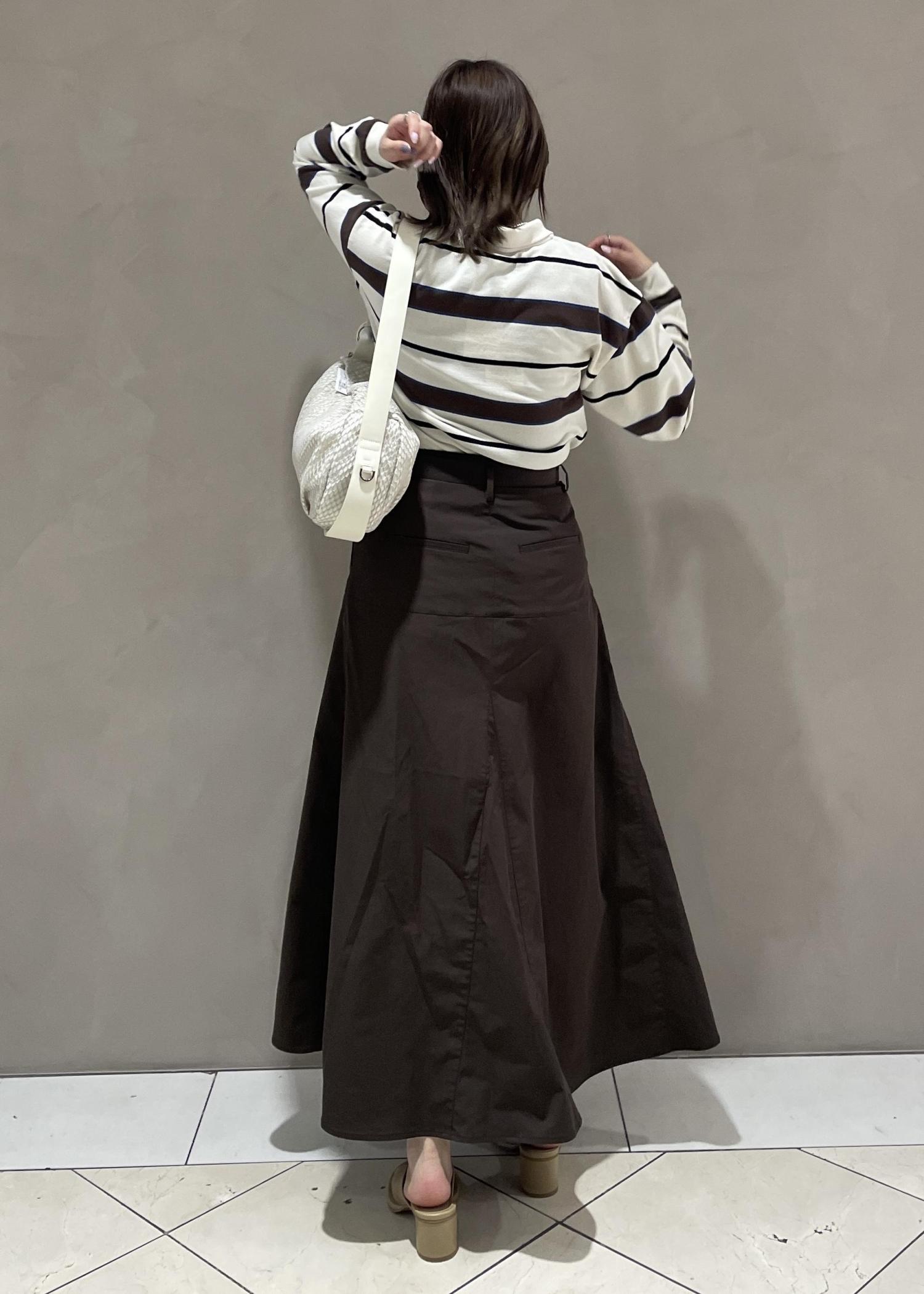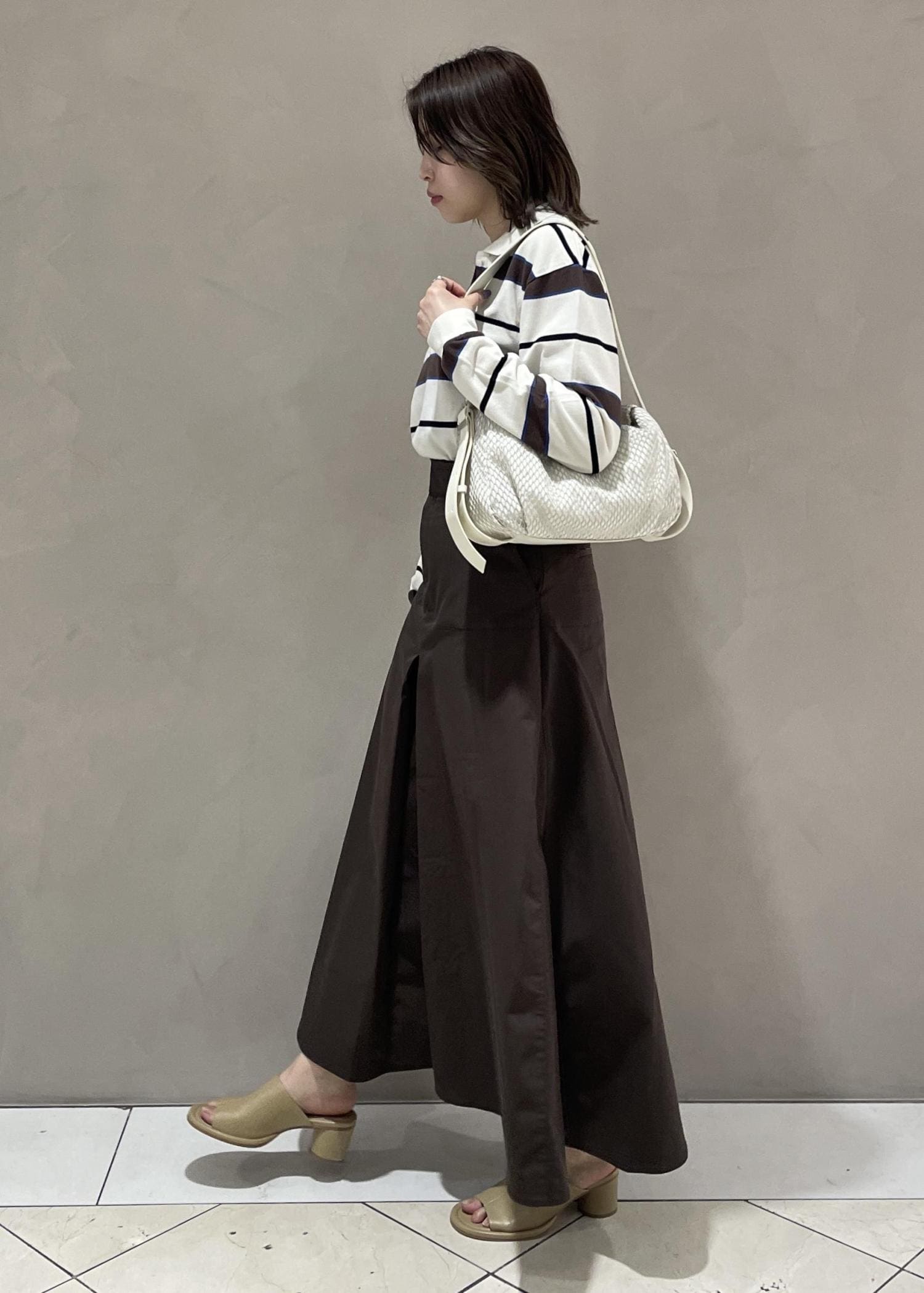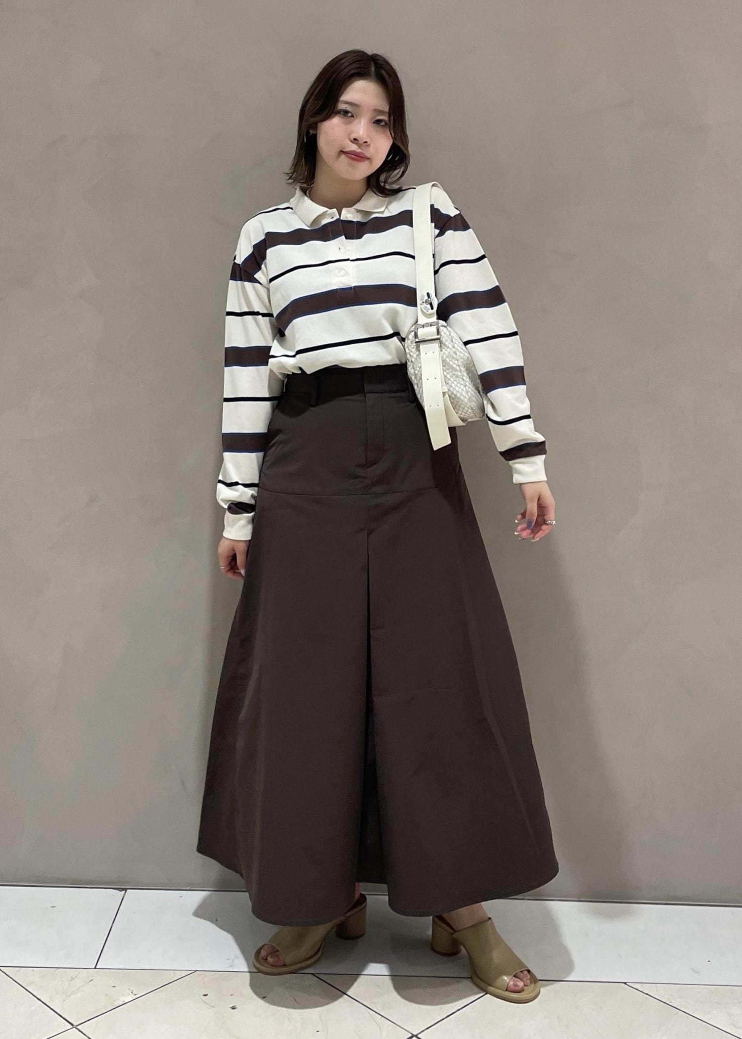 トップスのカラーを拾ったAラインスカートを合わせて女性らしく、足元は夏を見据えたサンダルをチョイスしました☺︎