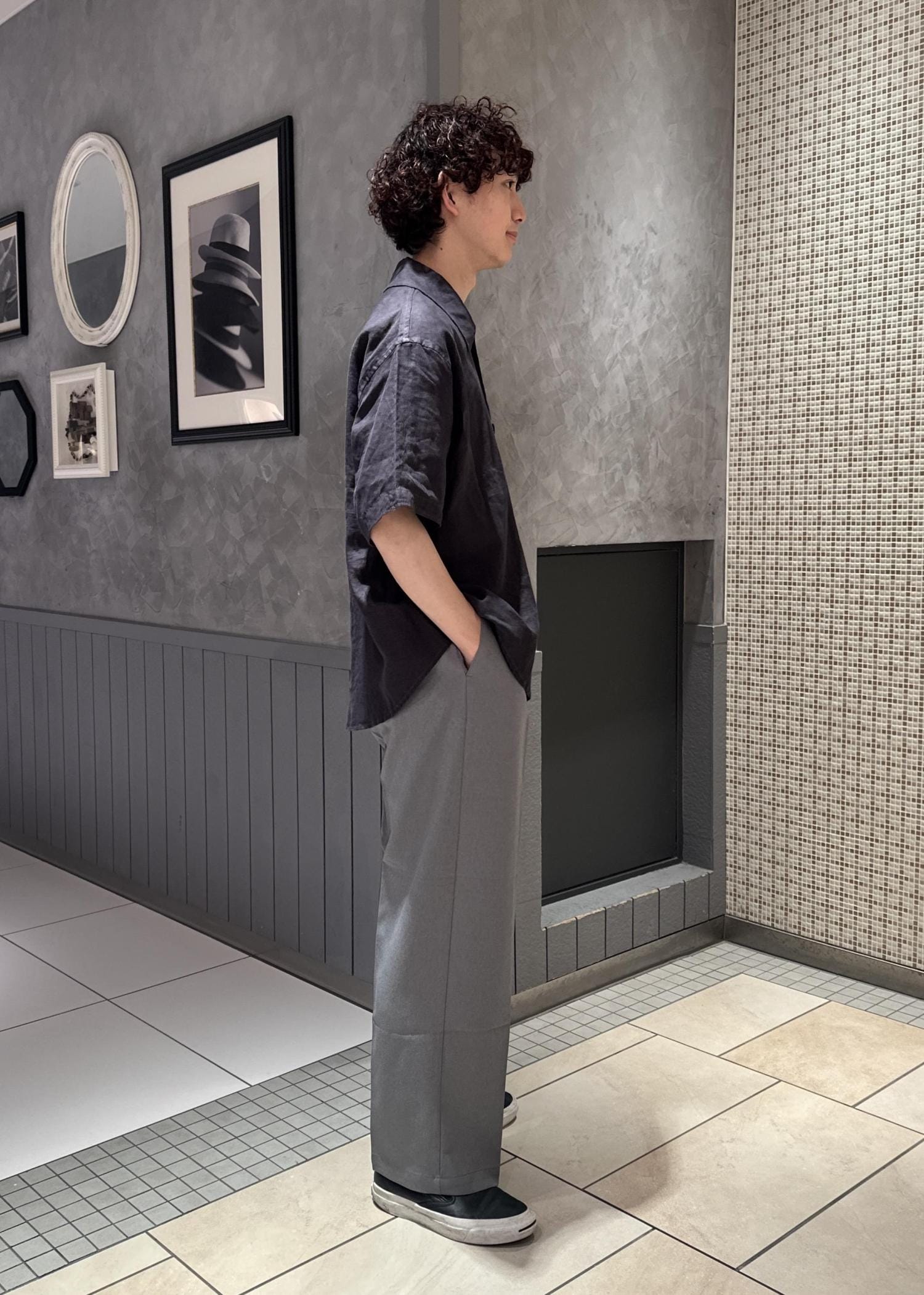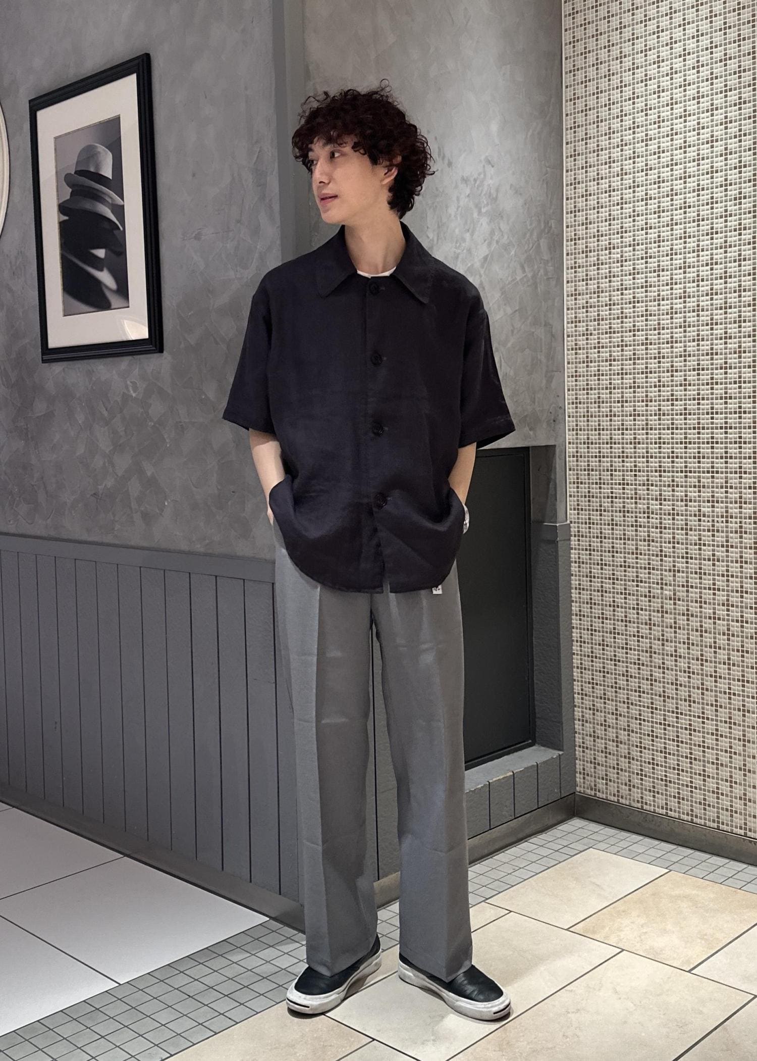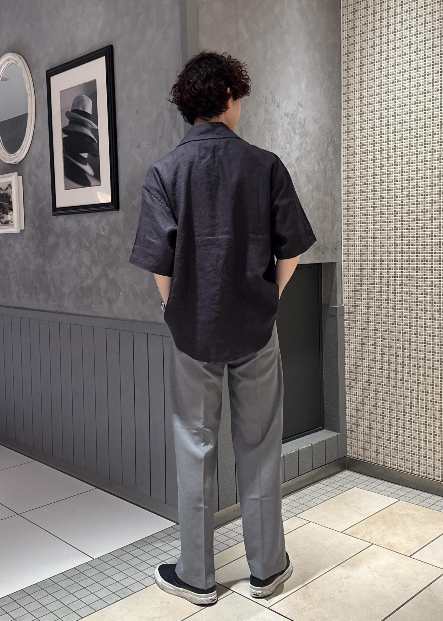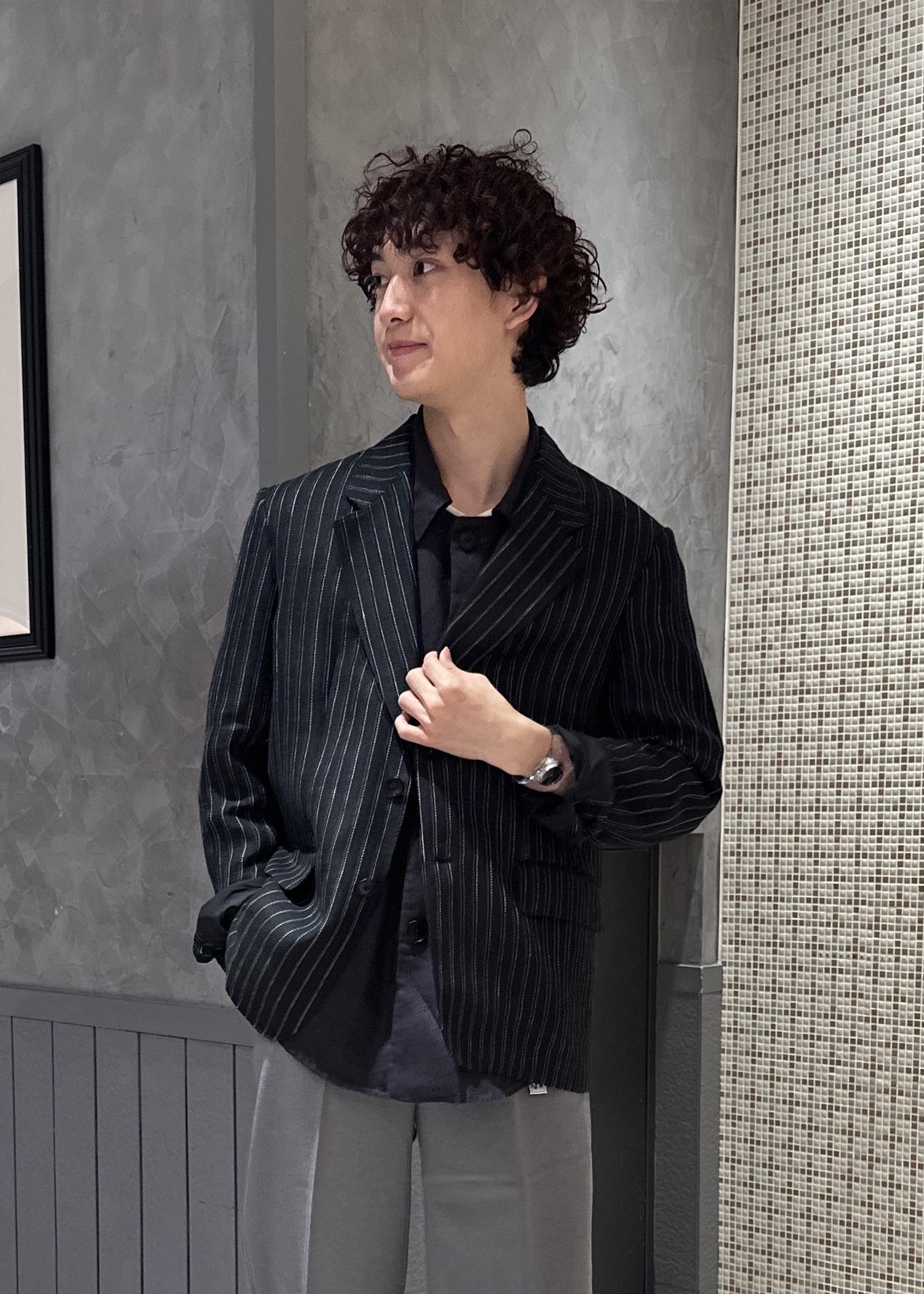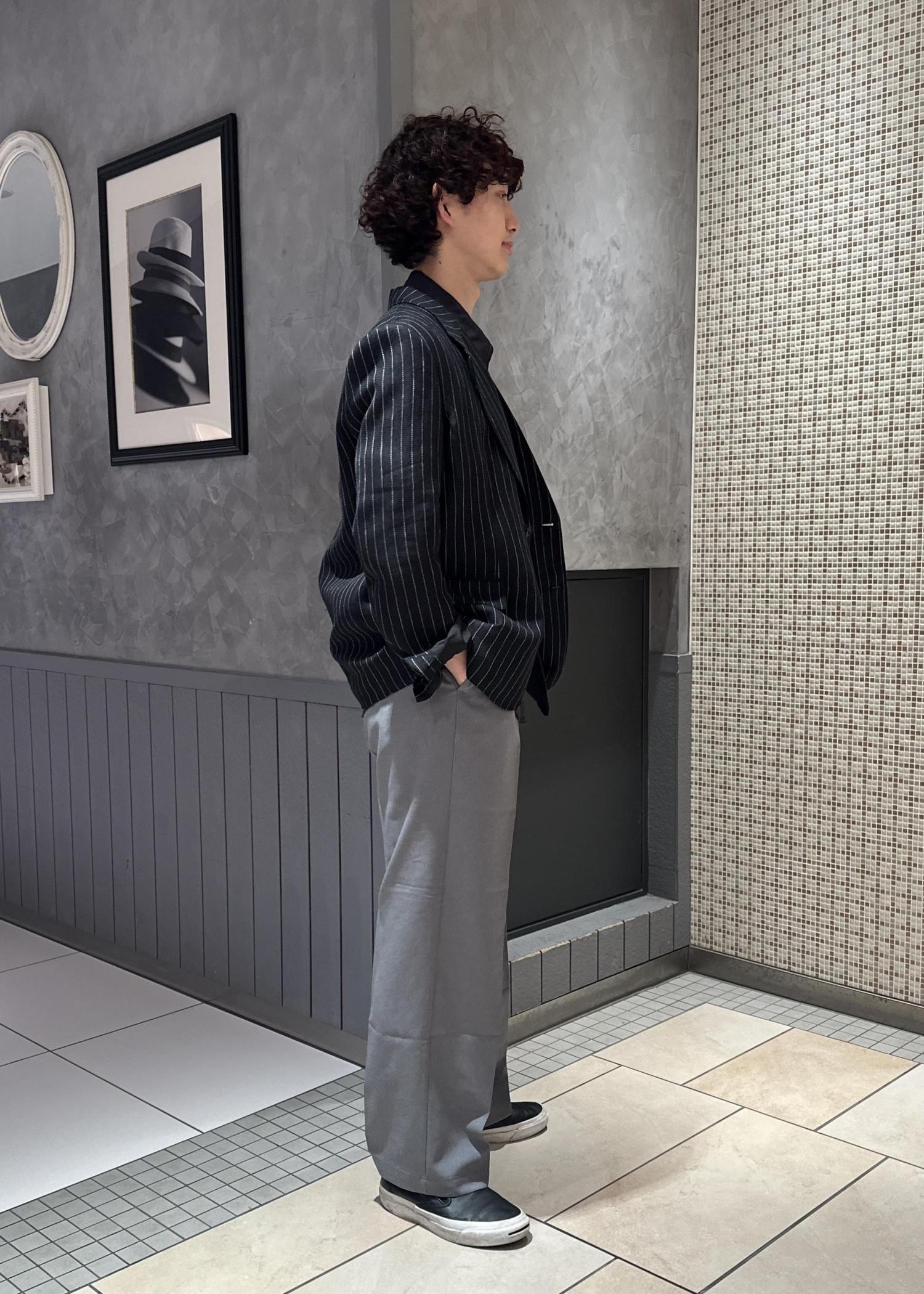 リネンのシャツ、ジャケットを使った涼しげな風合いのコーデ。パンツの色をライトな色にすることで更に涼しげな印象に。モノトーンでまとめてシンプルでスッキリしたコーデに仕上げました。