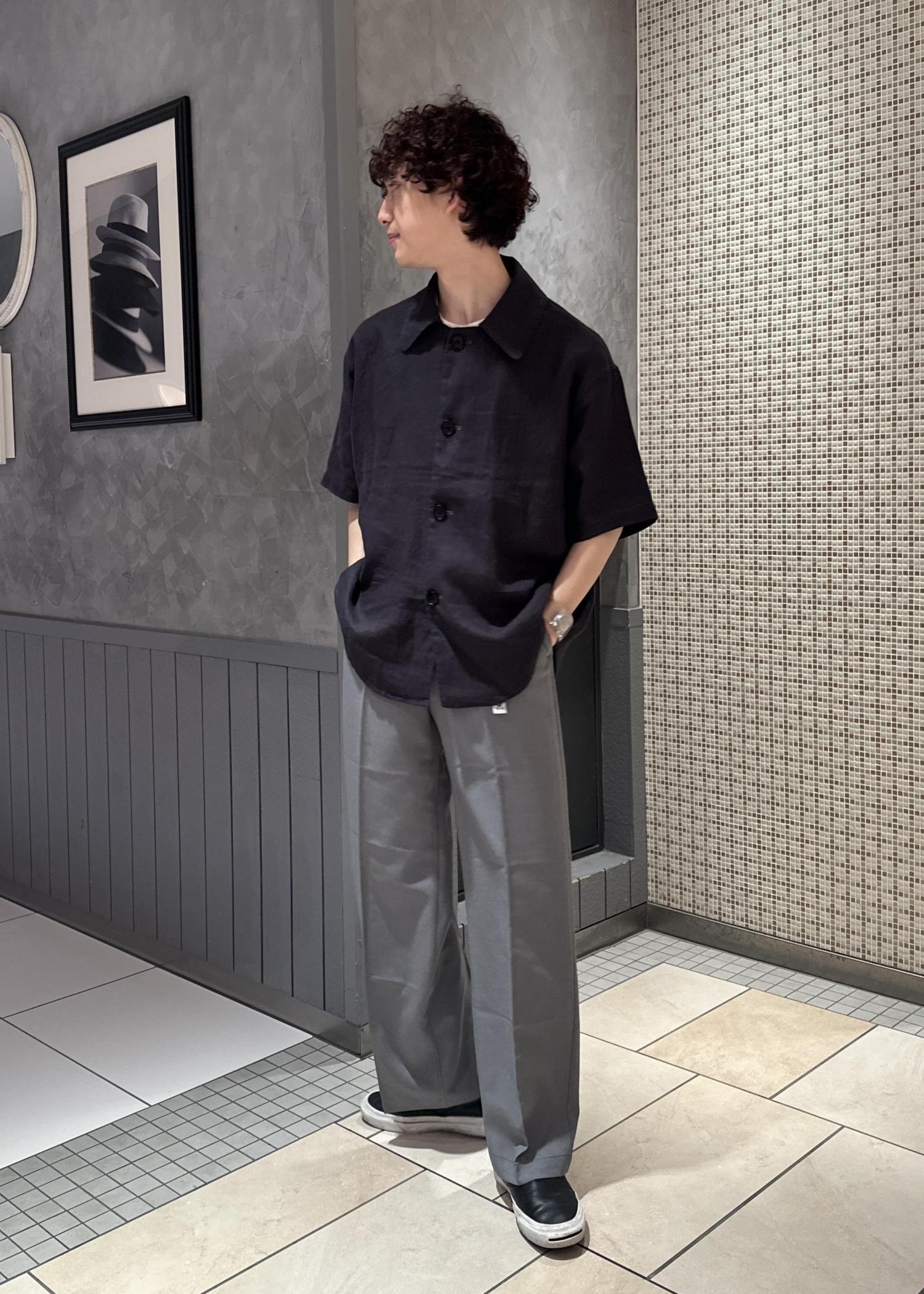 リネン素材のシャツ。バルマカンコートの下をバッサリ切ったようなデザイン。アウターのような襟元、ボタン。シャツだけど少しエッジの効いた、良いカタチのシャツです。