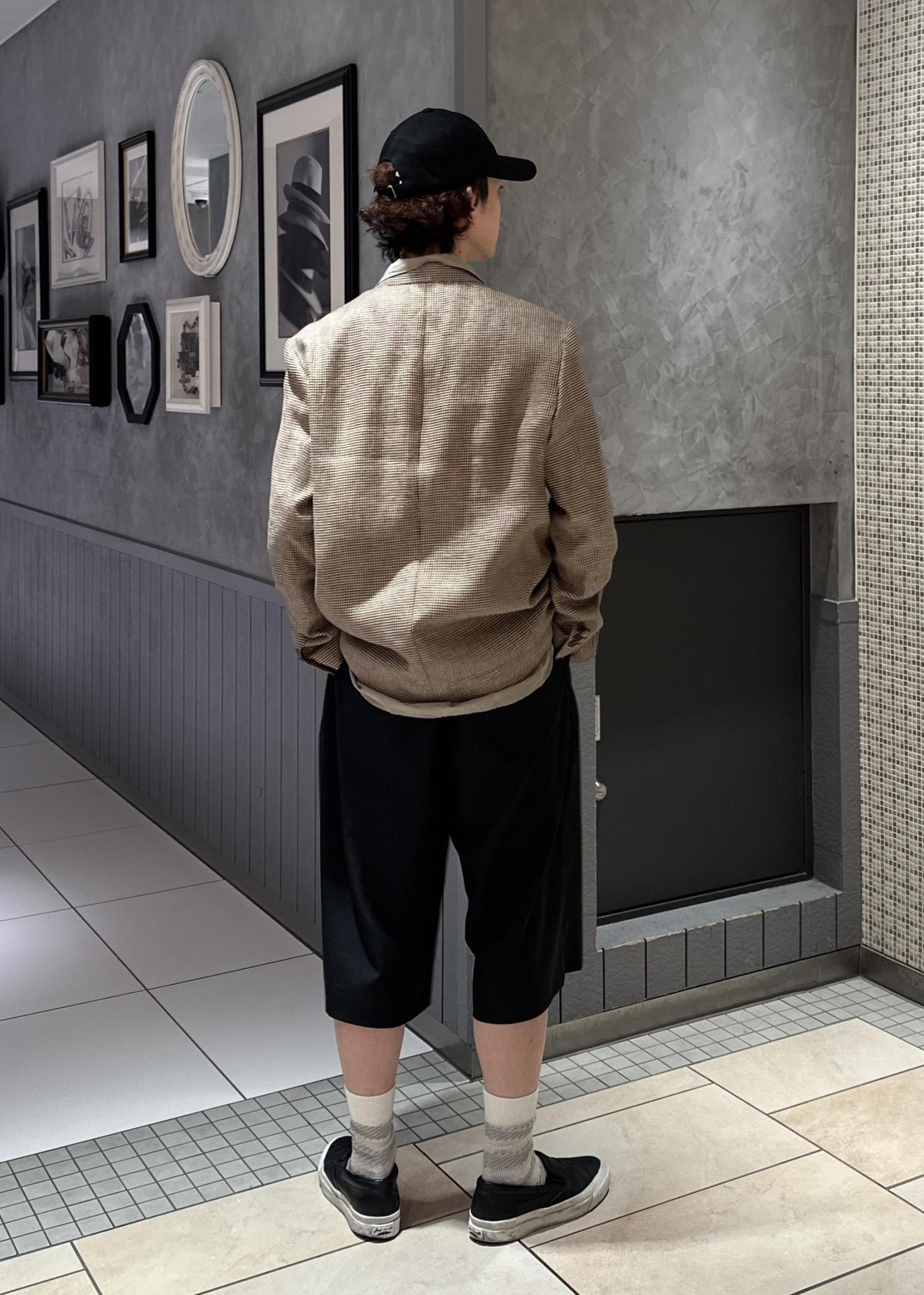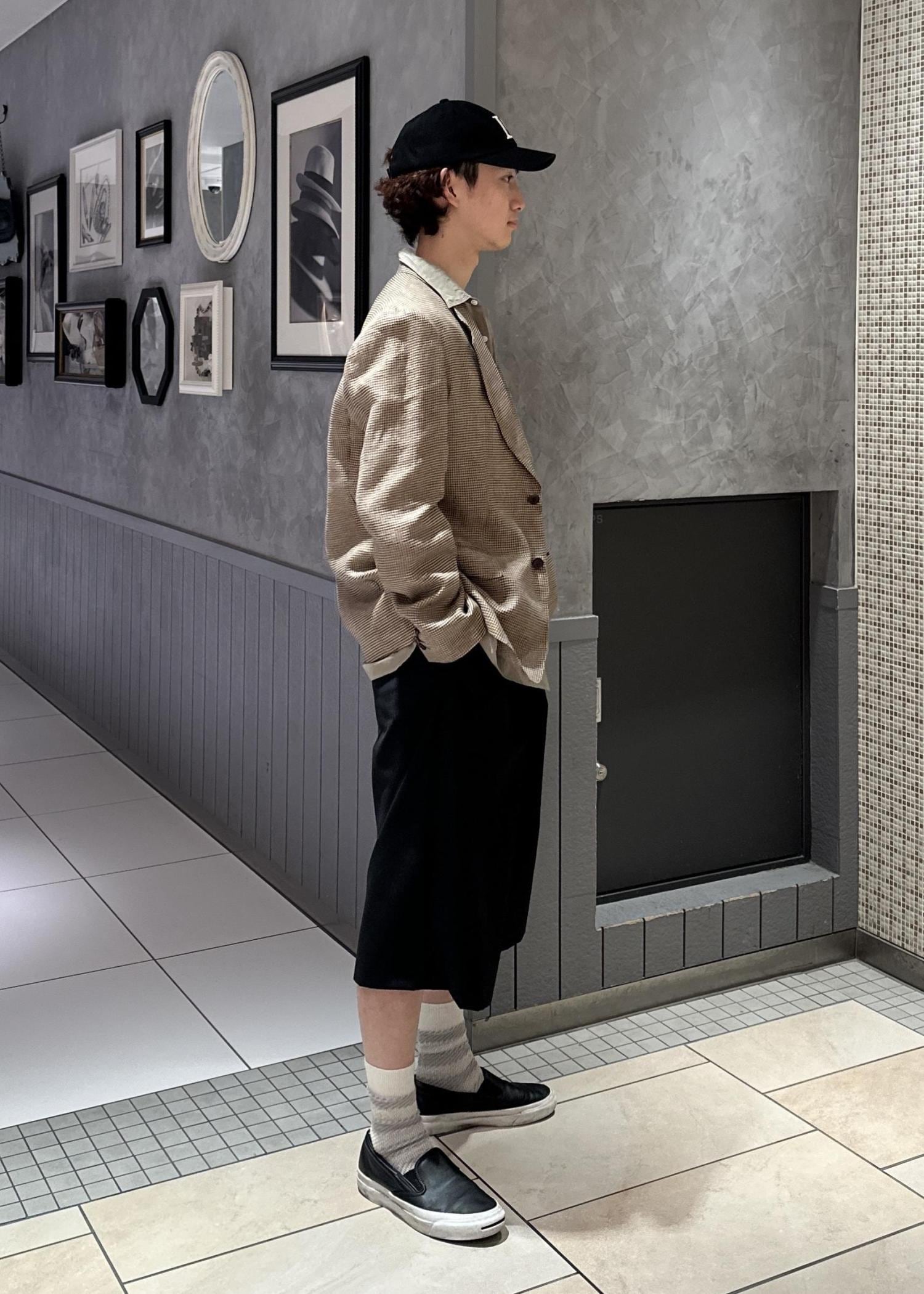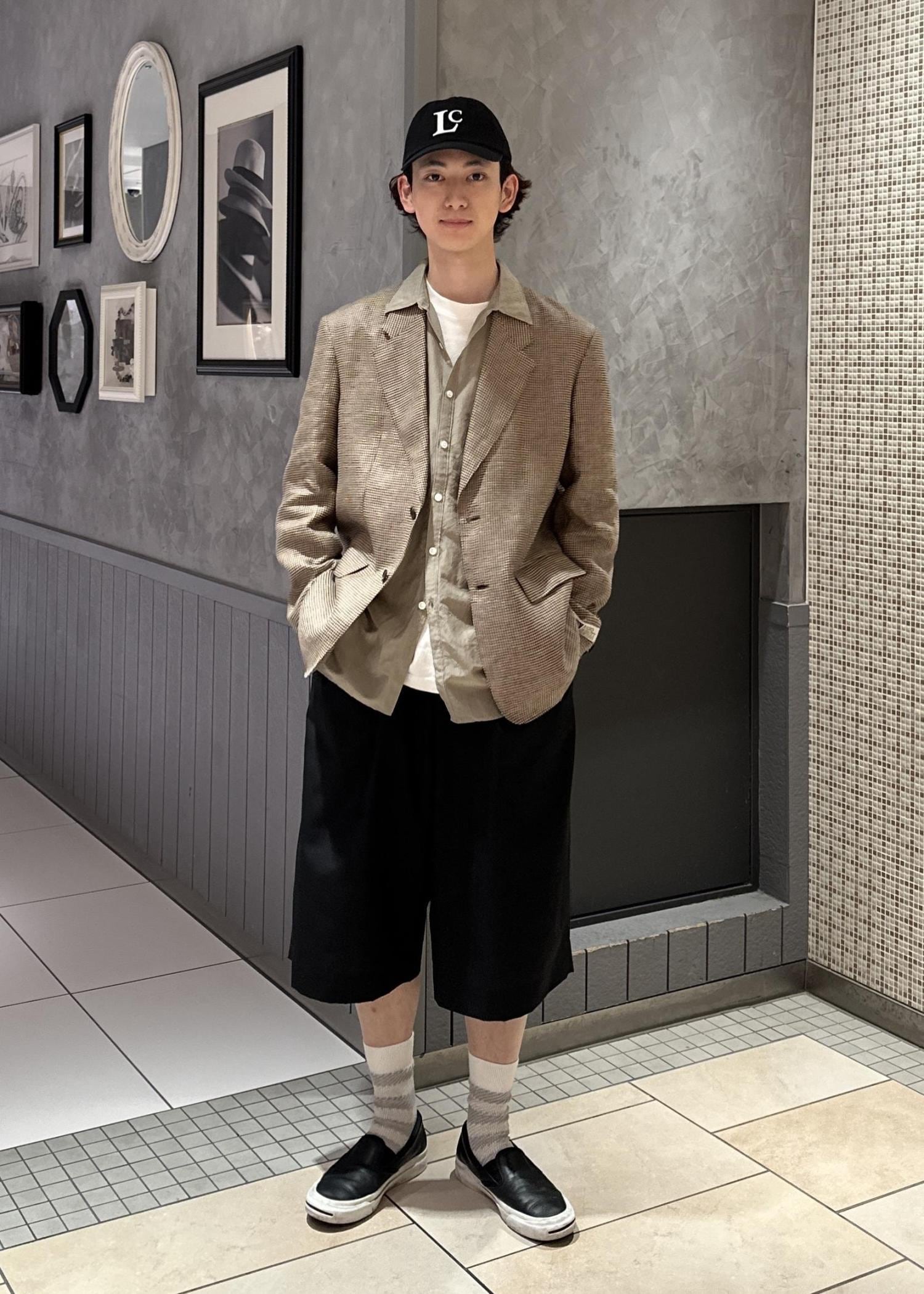 テーラードジャケットにショーツを合わせてラフな印象にしてみました。キャップで更にカジュアルな見え方にし、シャツをインナーに着ることでバランスをとりました。似た色を組み合わせて、少しレトロな感じにしてみました。